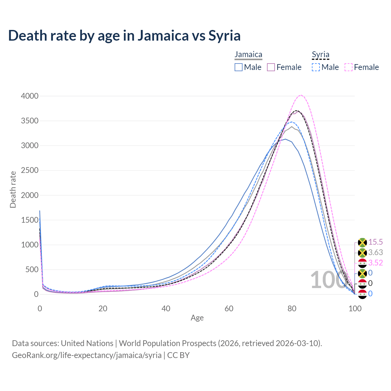 In Jamaica, the most common age of death is 80, compared to 82 in Syria. The median age of death is 75.7 in Jamaica and 77.7 in Syria, meaning only half of each cohort is expected to live past that age.