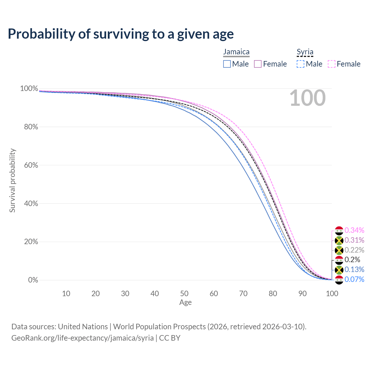 This life expectancy calculator shows the odds of living to 100, 95, 90, and below based on current age for both males and females in Jamaica and Syria, along with mean and median age of death. The calculations are based on the 2026 life tables (actuarial tables) from the UN World Population Prospects.