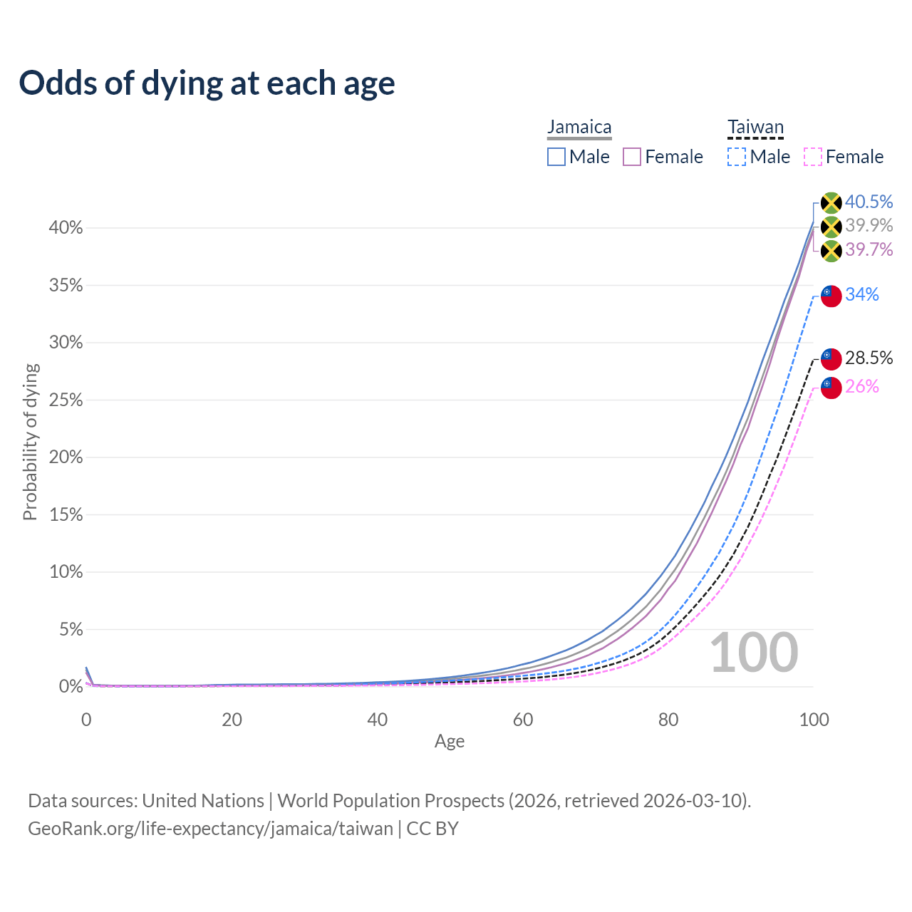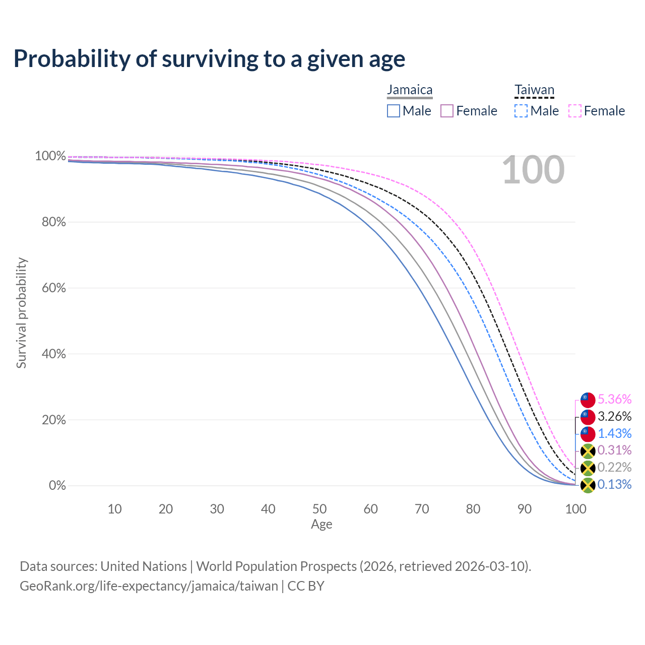 This life expectancy calculator shows the odds of living to 100, 95, 90, and below based on current age for both males and females in Jamaica and Taiwan, along with mean and median age of death. The calculations are based on the 2026 life tables (actuarial tables) from the UN World Population Prospects.