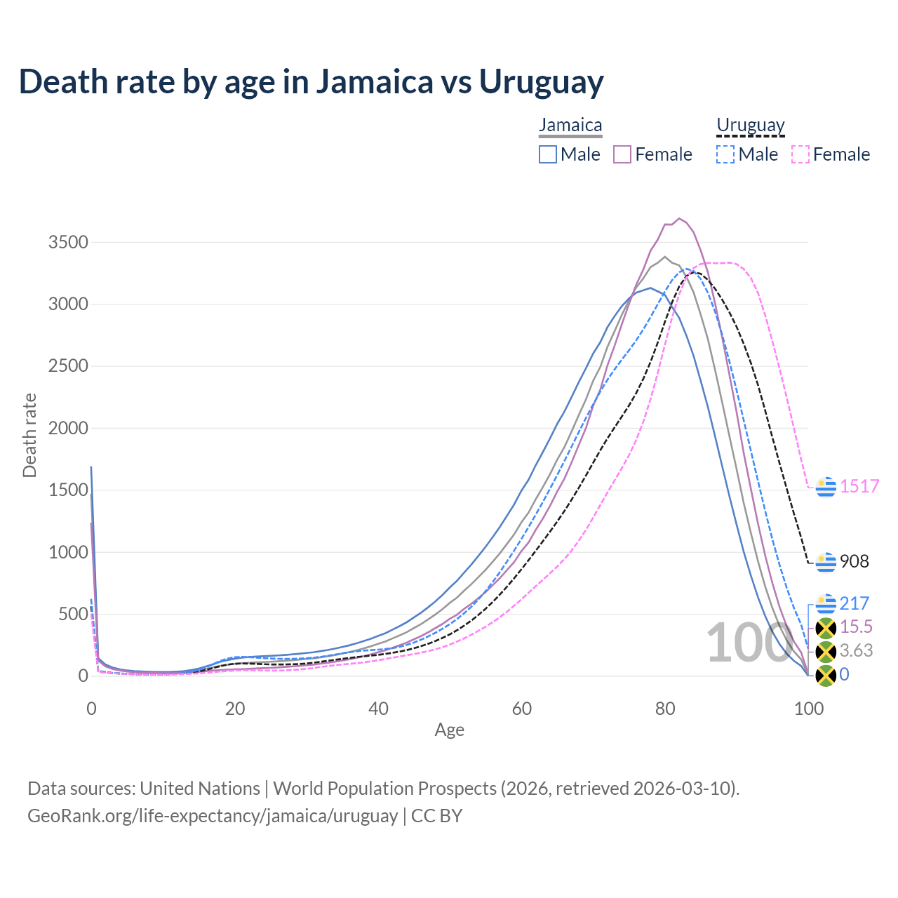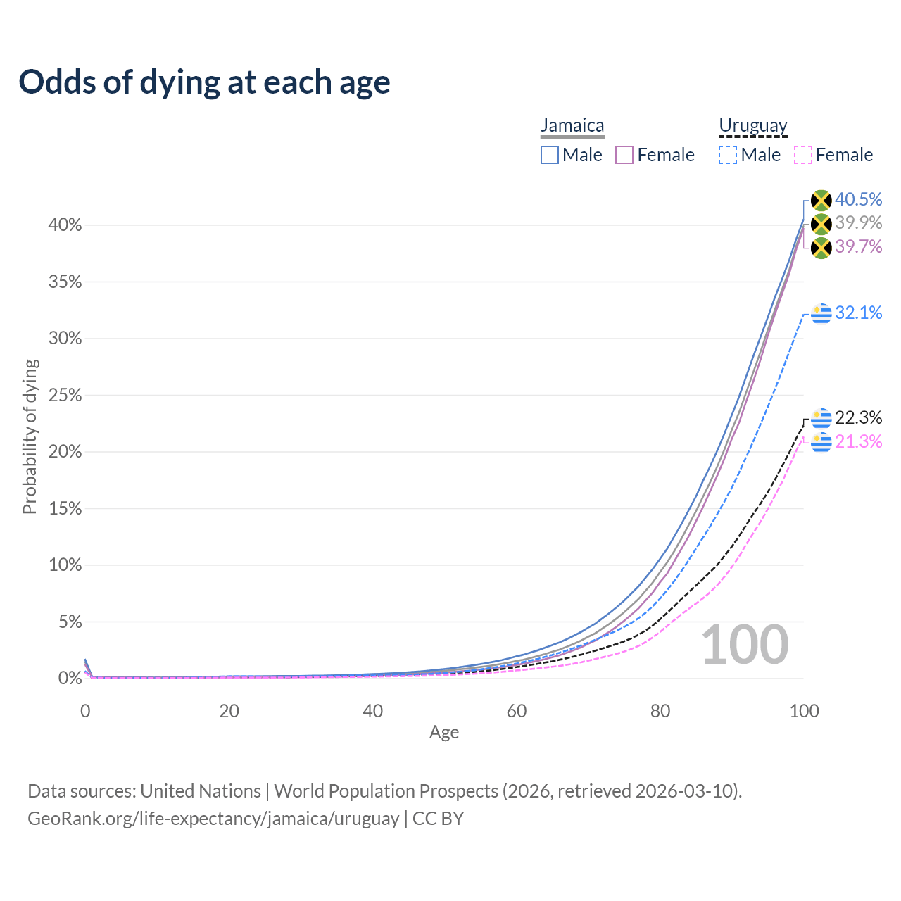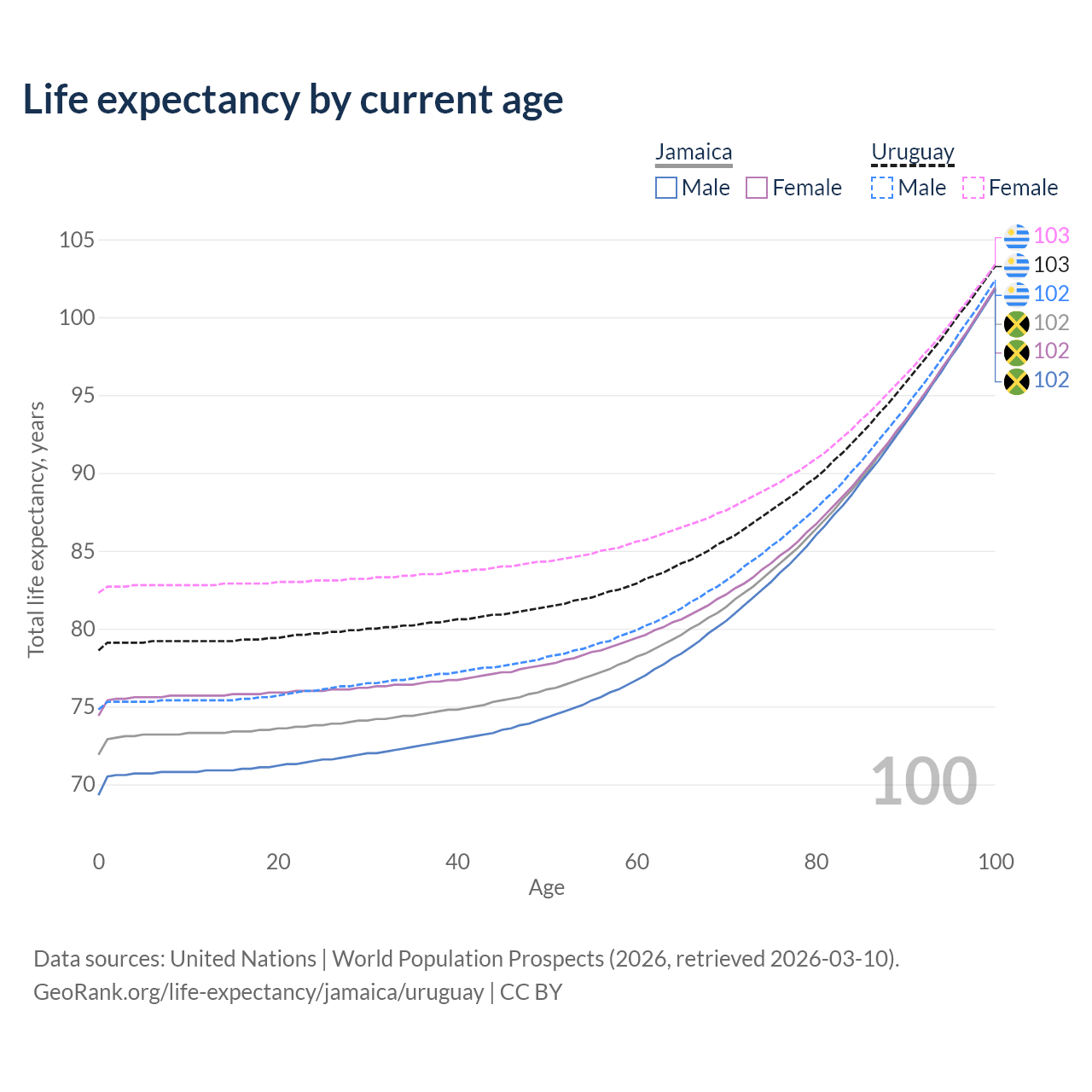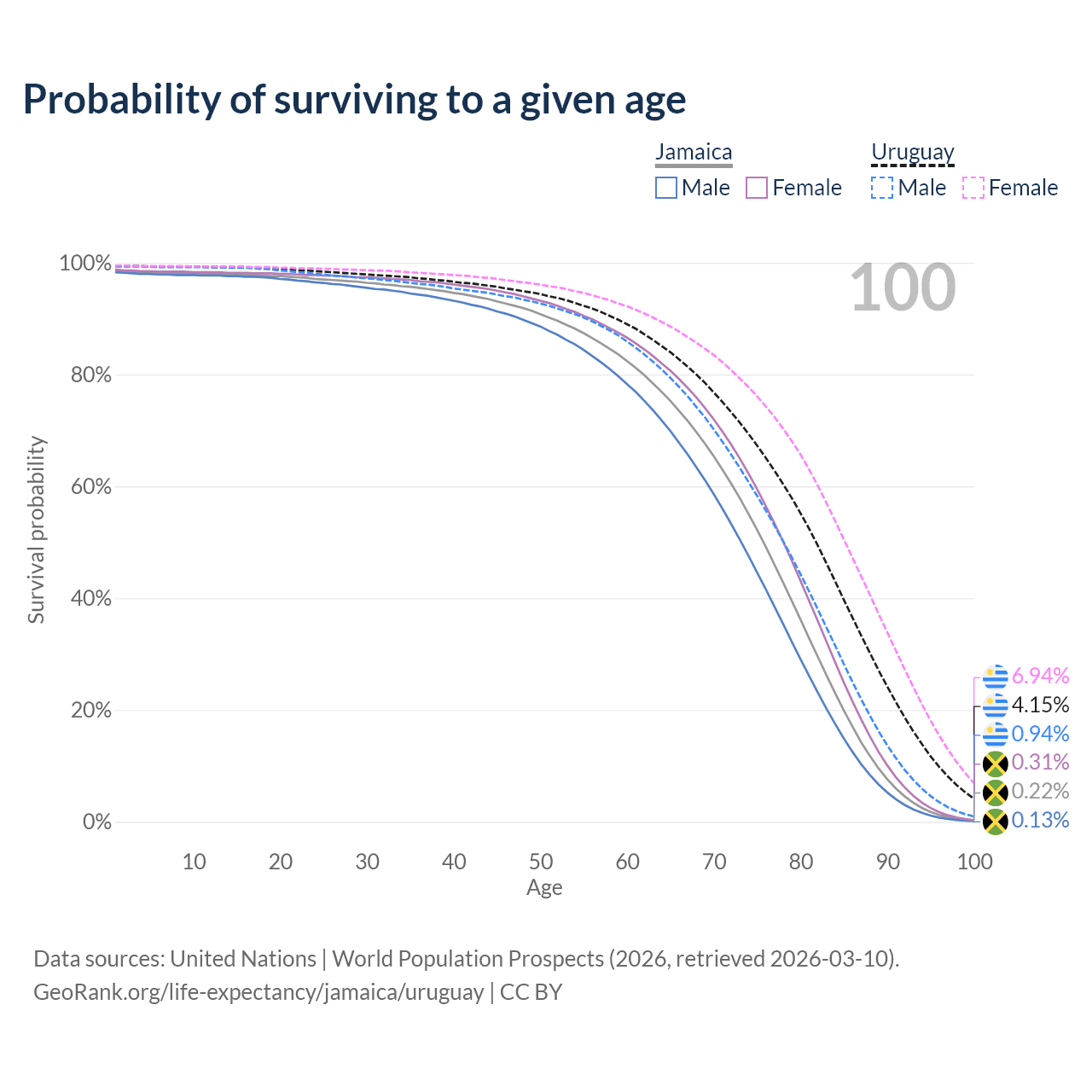 This life expectancy calculator shows the odds of living to 100, 95, 90, and below based on current age for both males and females in Jamaica and Uruguay, along with mean and median age of death. The calculations are based on the 2026 life tables (actuarial tables) from the UN World Population Prospects.