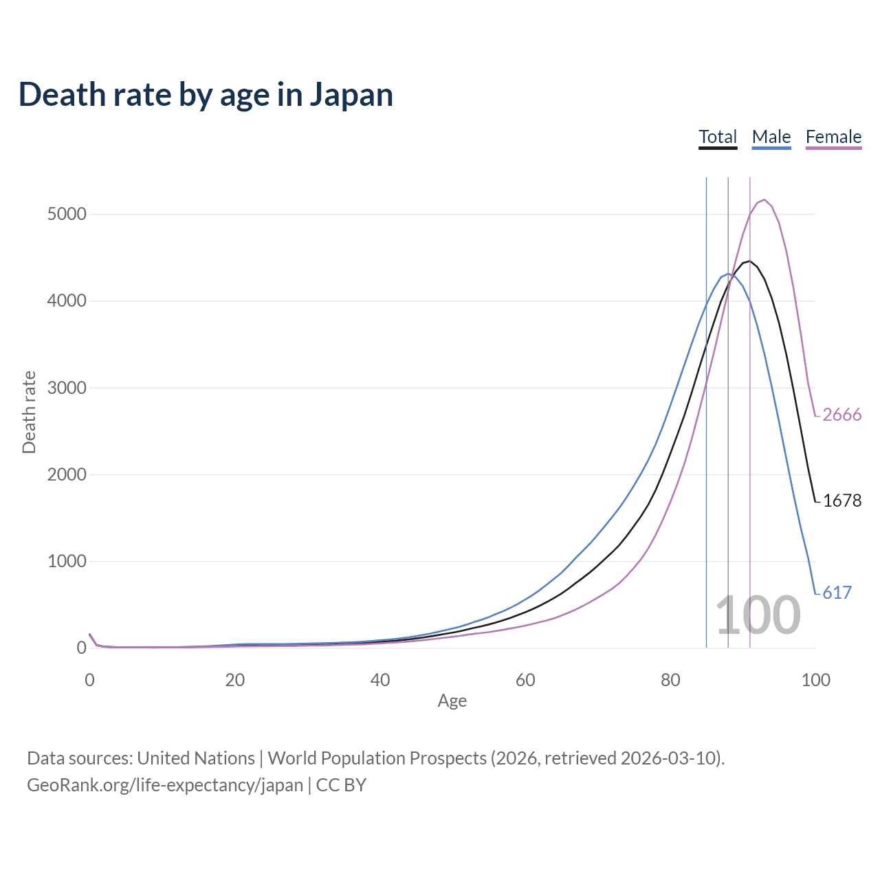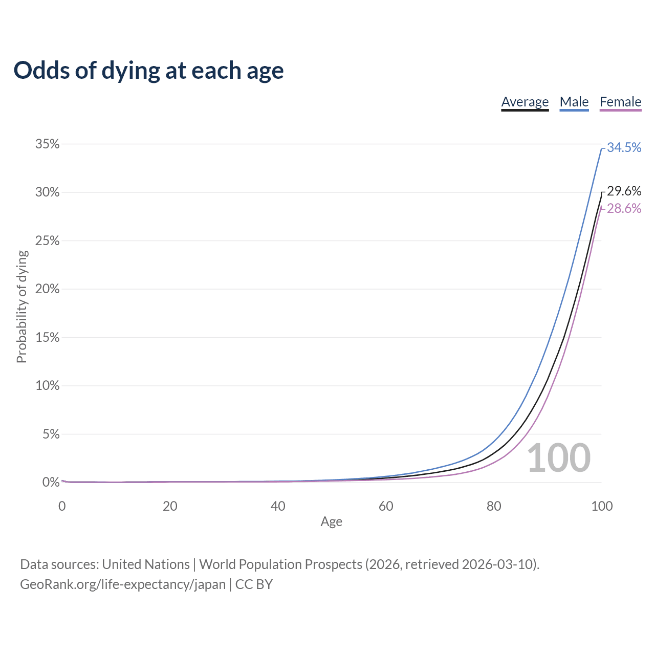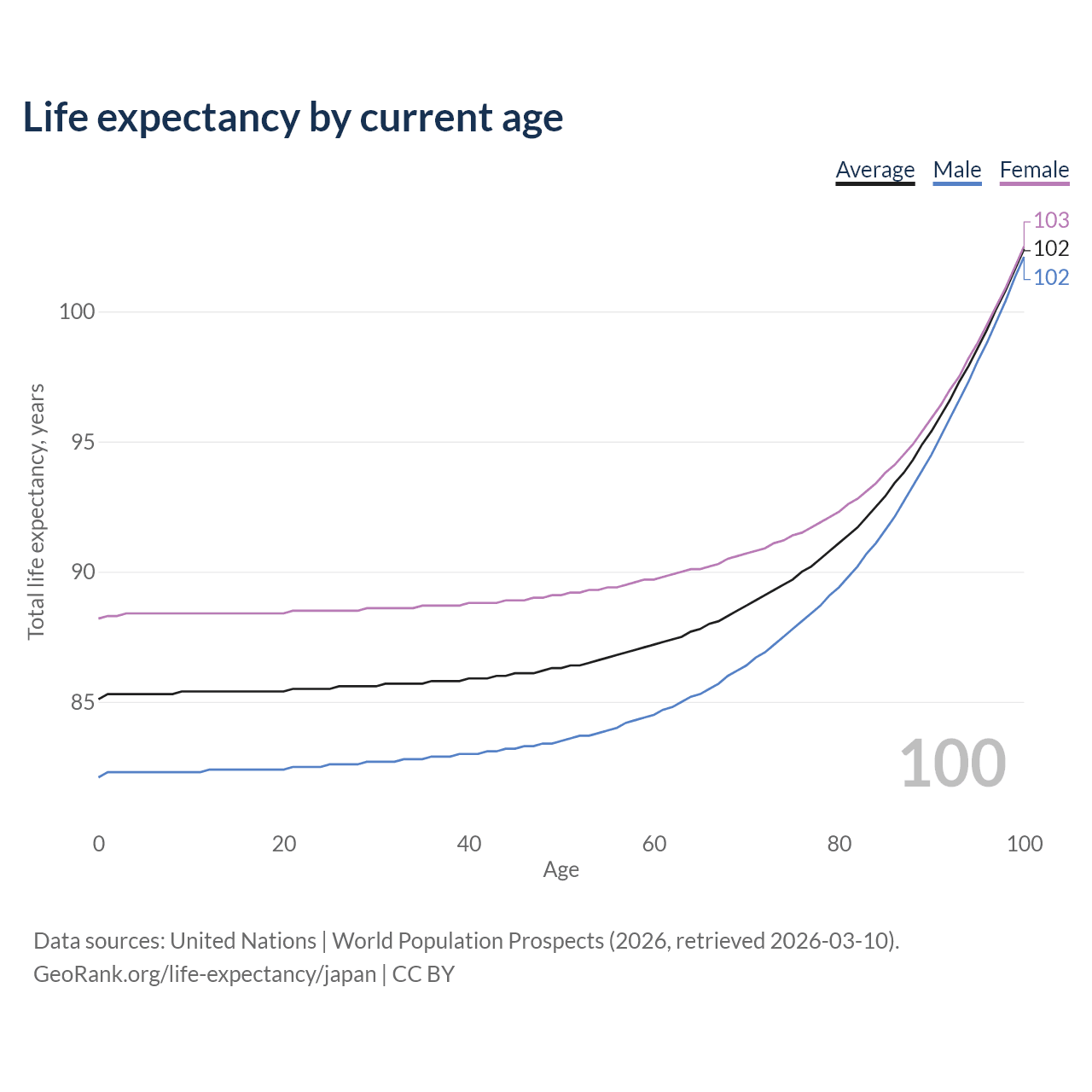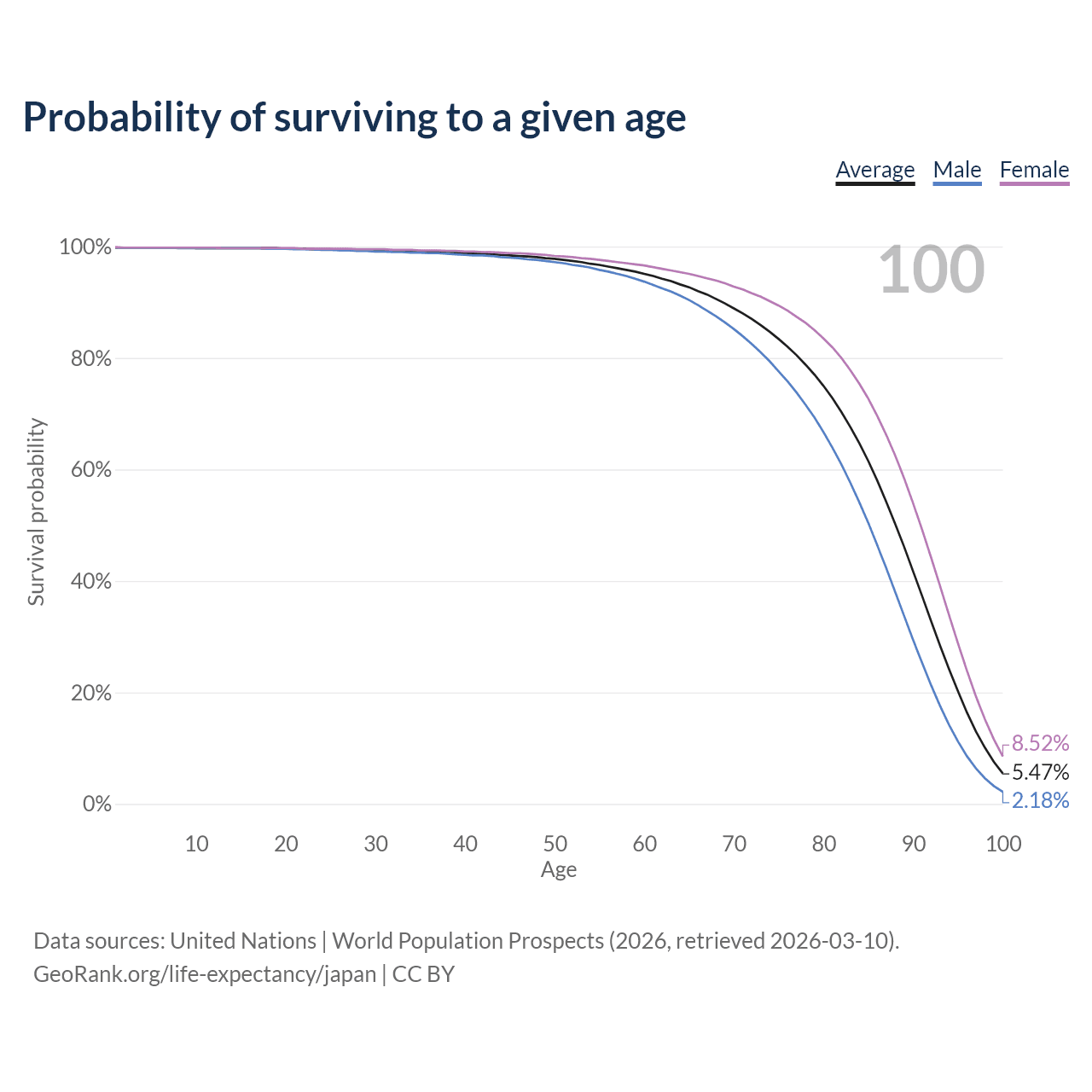 This life expectancy calculator shows the odds of living to 100, 95, 90, and below based on current age for both males and females in Japan, along with mean and median age of death. The calculations are based on the 2026 life tables (actuarial tables) from the UN World Population Prospects.