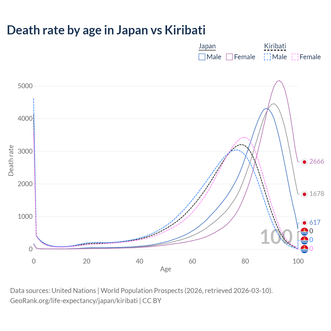 In Japan, the most common age of death is 91, compared to 0 in Kiribati. The median age of death is 88.1 in Japan and 73.1 in Kiribati, meaning only half of each cohort is expected to live past that age.
