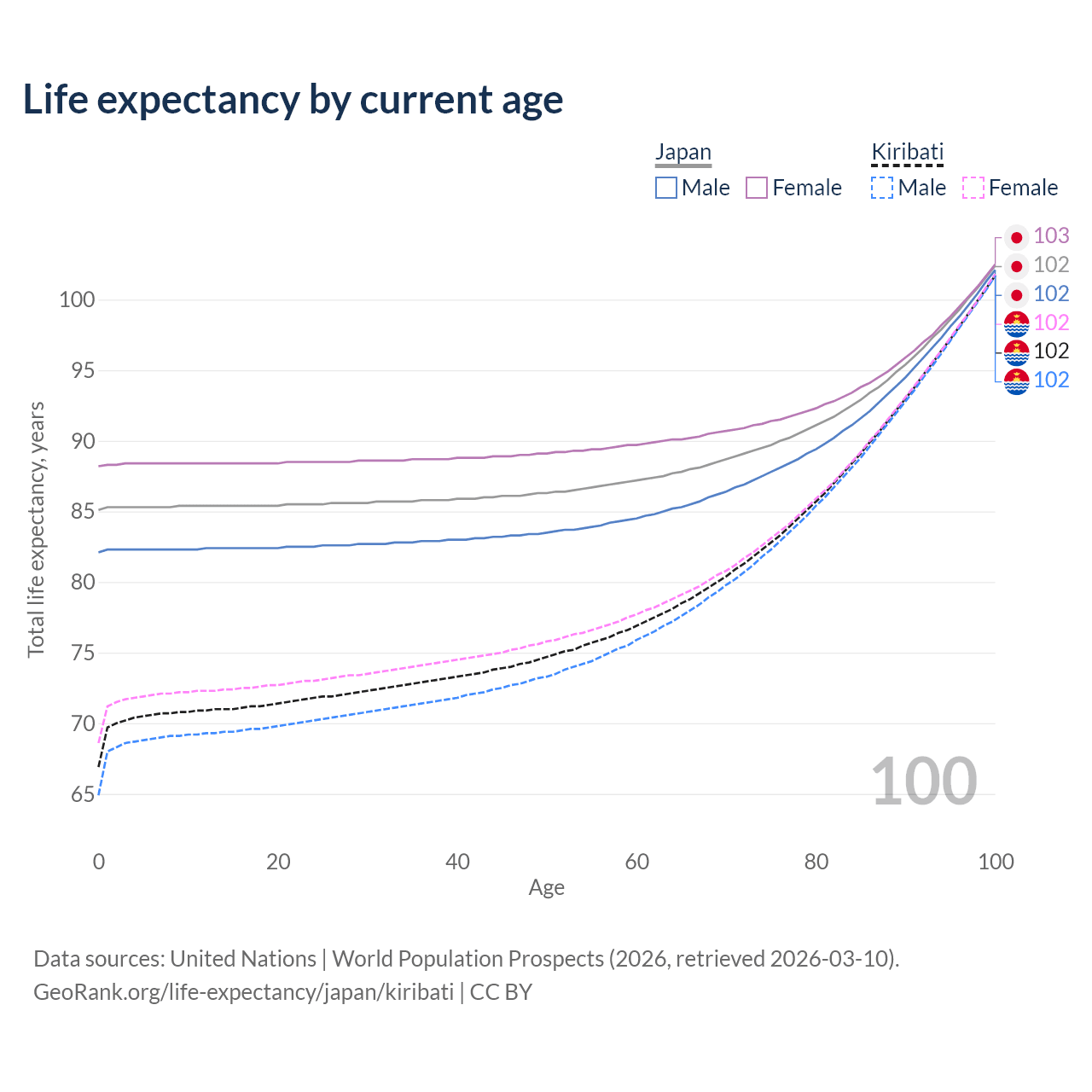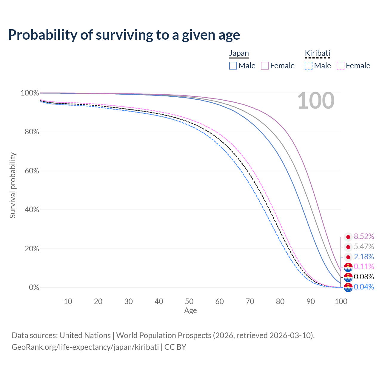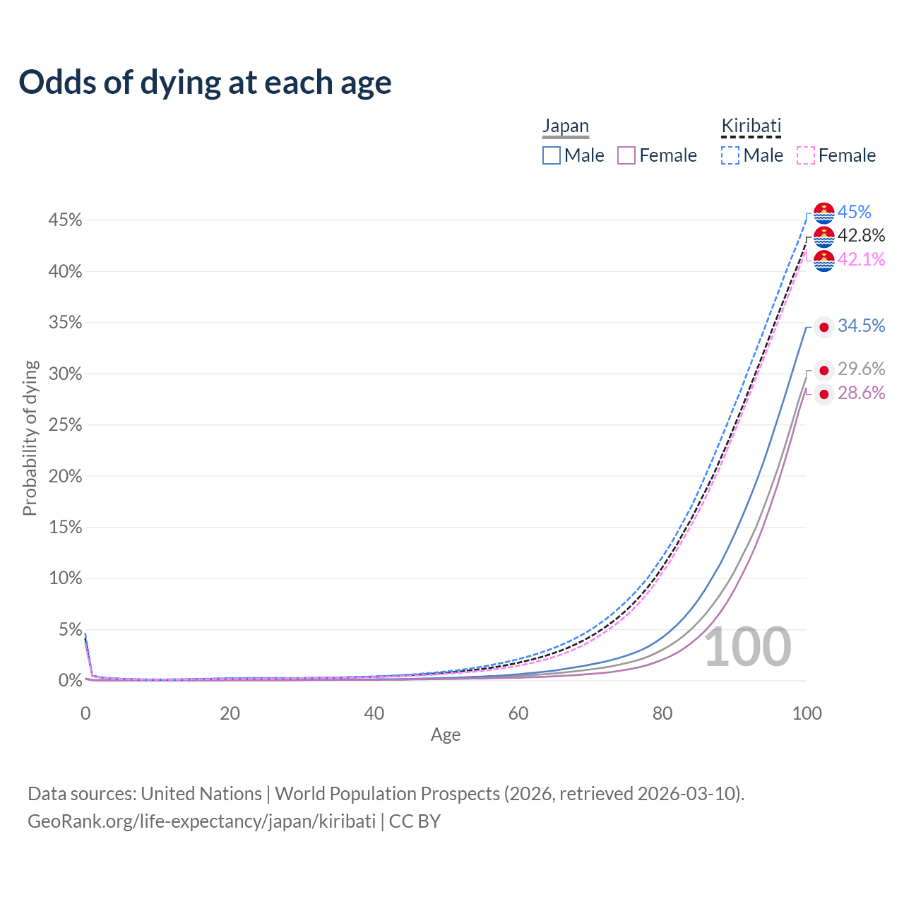 This life expectancy calculator shows the odds of living to 100, 95, 90, and below based on current age for both males and females in Japan and Kiribati, along with mean and median age of death. The calculations are based on the 2026 life tables (actuarial tables) from the UN World Population Prospects.