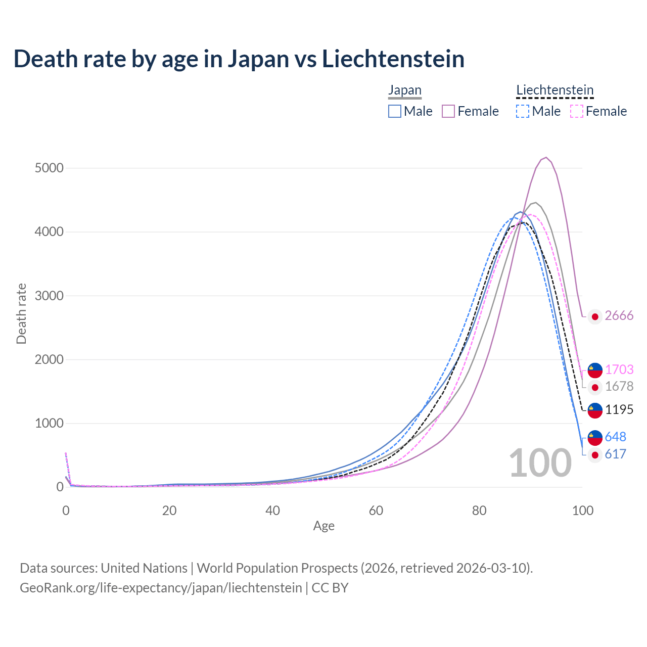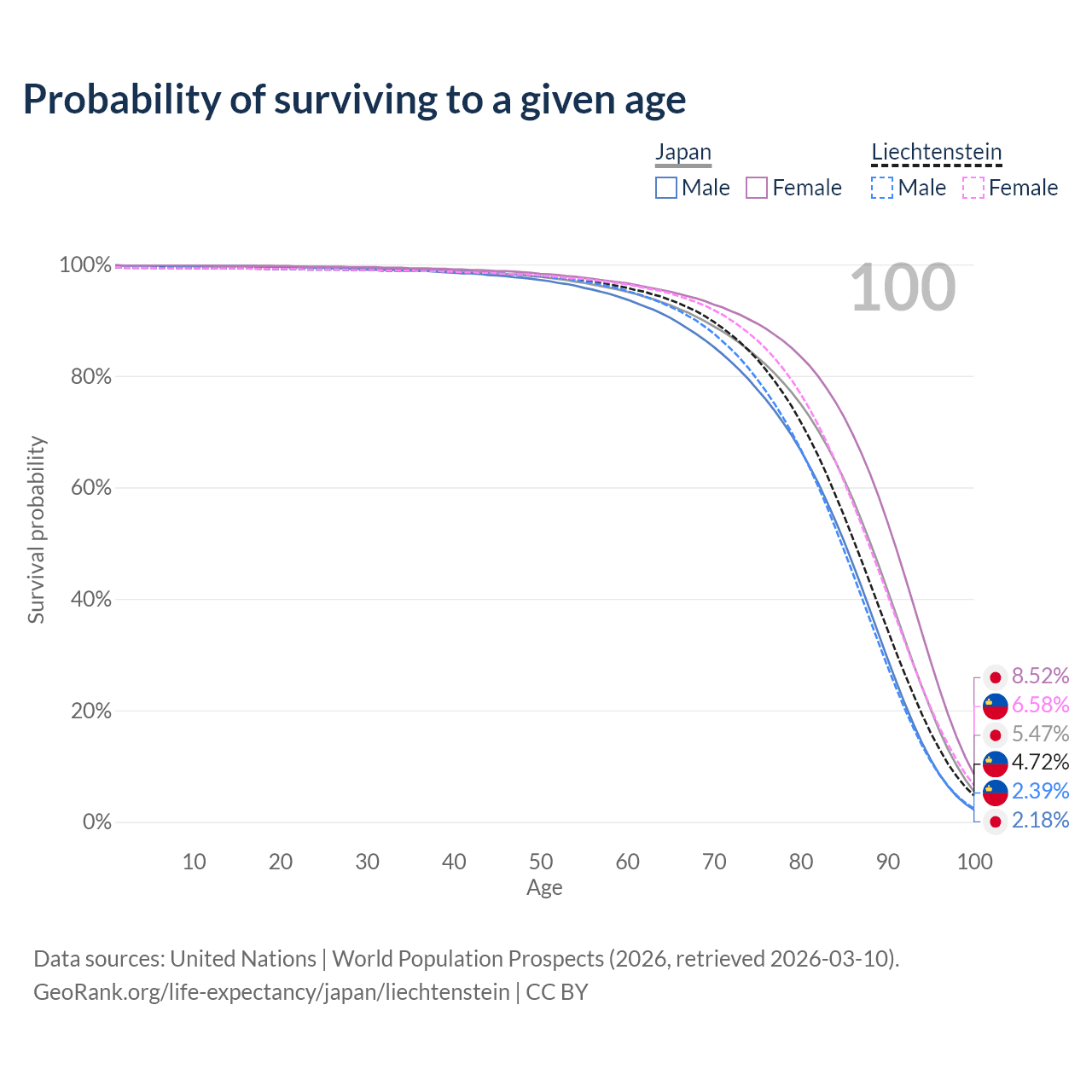 This life expectancy calculator shows the odds of living to 100, 95, 90, and below based on current age for both males and females in Japan and Liechtenstein, along with mean and median age of death. The calculations are based on the 2026 life tables (actuarial tables) from the UN World Population Prospects.