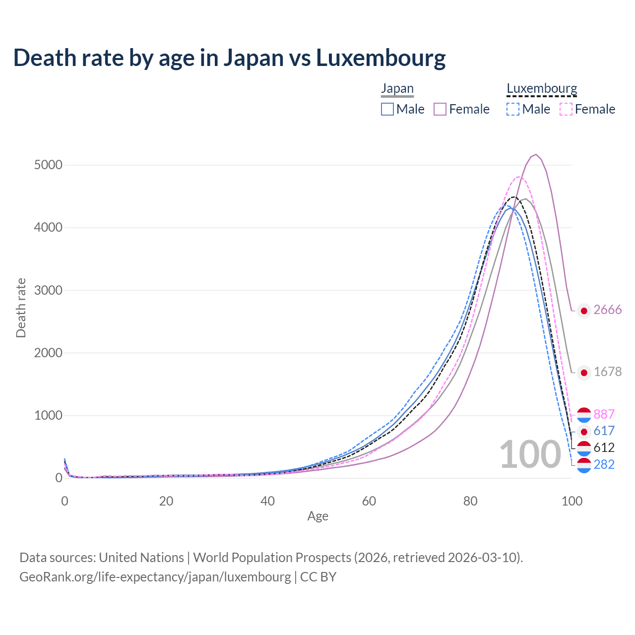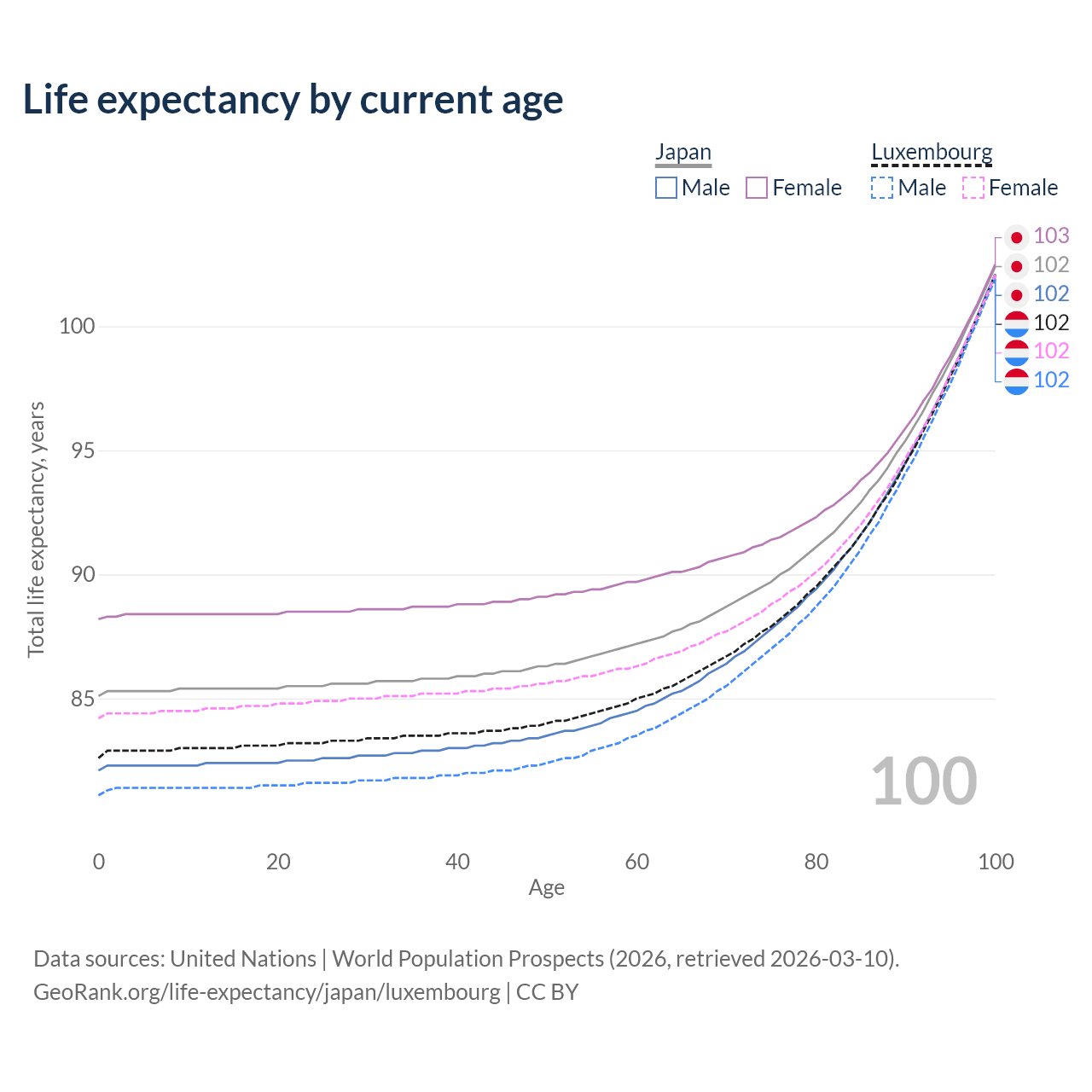 This life expectancy calculator shows the odds of living to 100, 95, 90, and below based on current age for both males and females in Japan and Luxembourg, along with mean and median age of death. The calculations are based on the 2026 life tables (actuarial tables) from the UN World Population Prospects.
