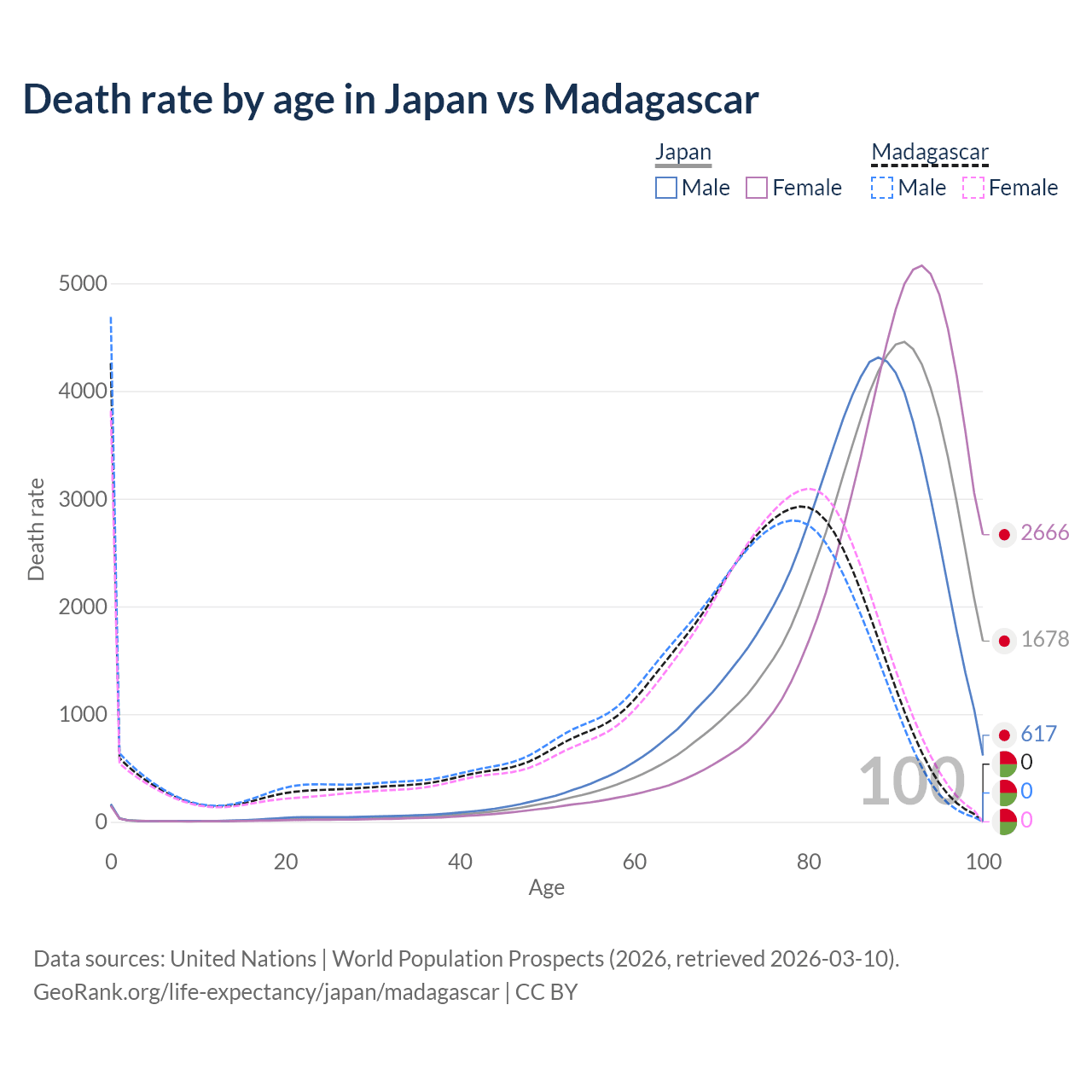 In Japan, the most common age of death is 91, compared to 0 in Madagascar. The median age of death is 88.1 in Japan and 72.2 in Madagascar, meaning only half of each cohort is expected to live past that age.