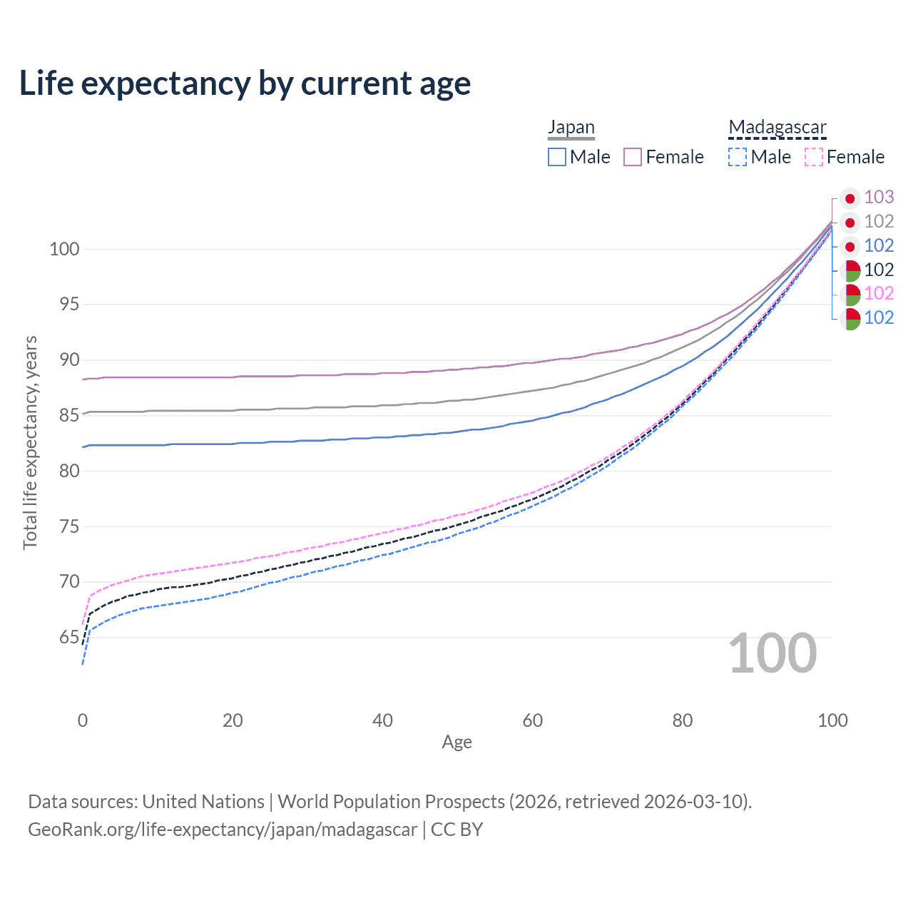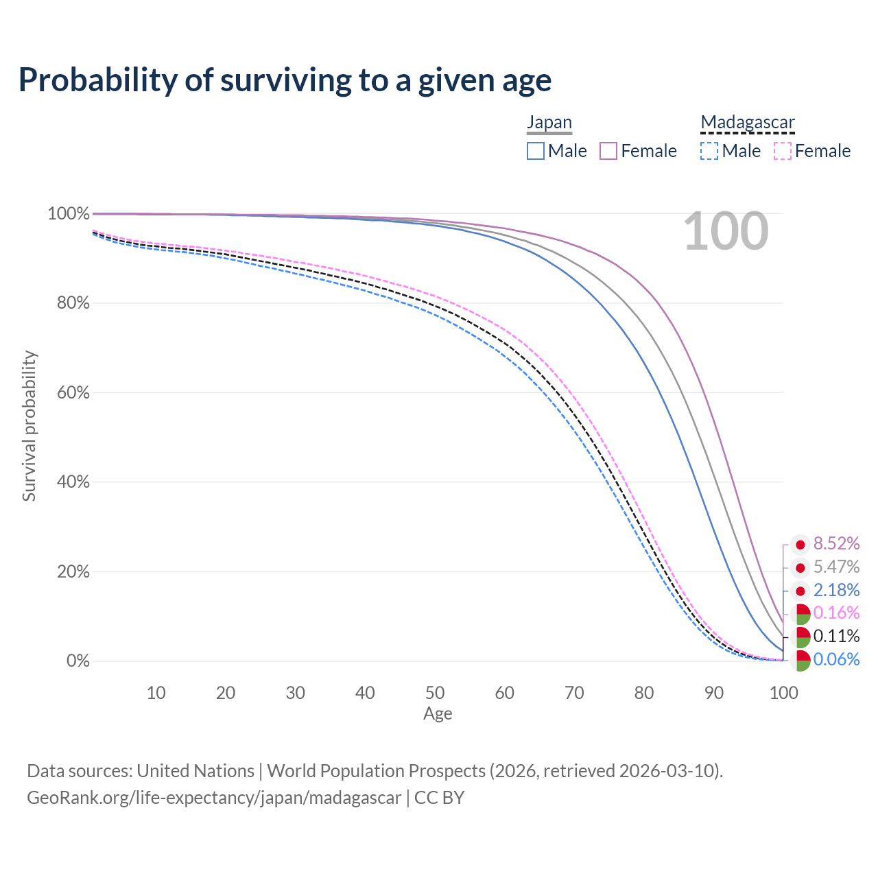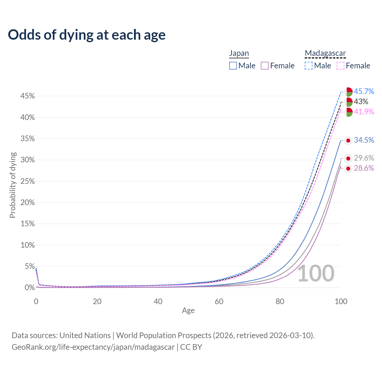 This life expectancy calculator shows the odds of living to 100, 95, 90, and below based on current age for both males and females in Japan and Madagascar, along with mean and median age of death. The calculations are based on the 2026 life tables (actuarial tables) from the UN World Population Prospects.