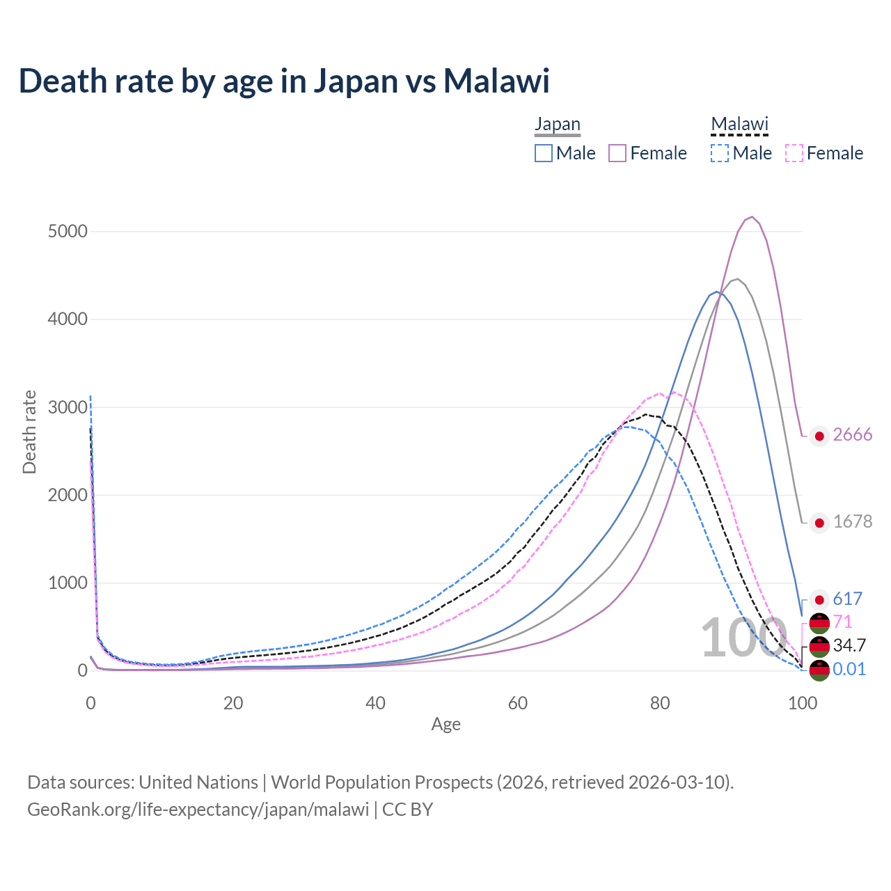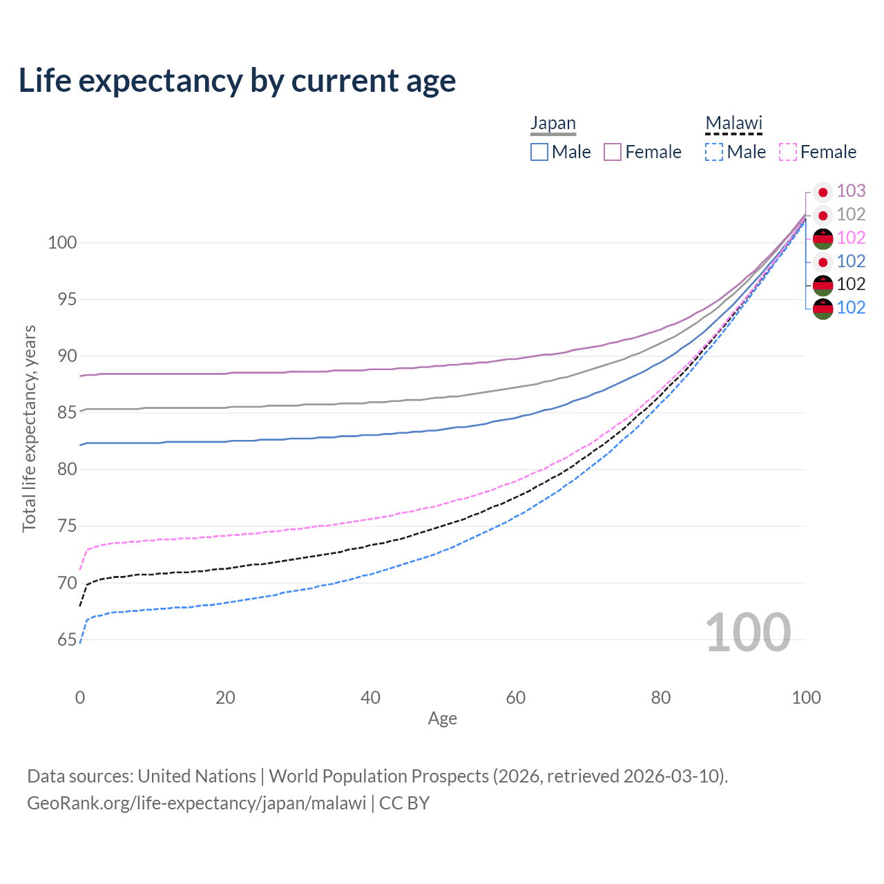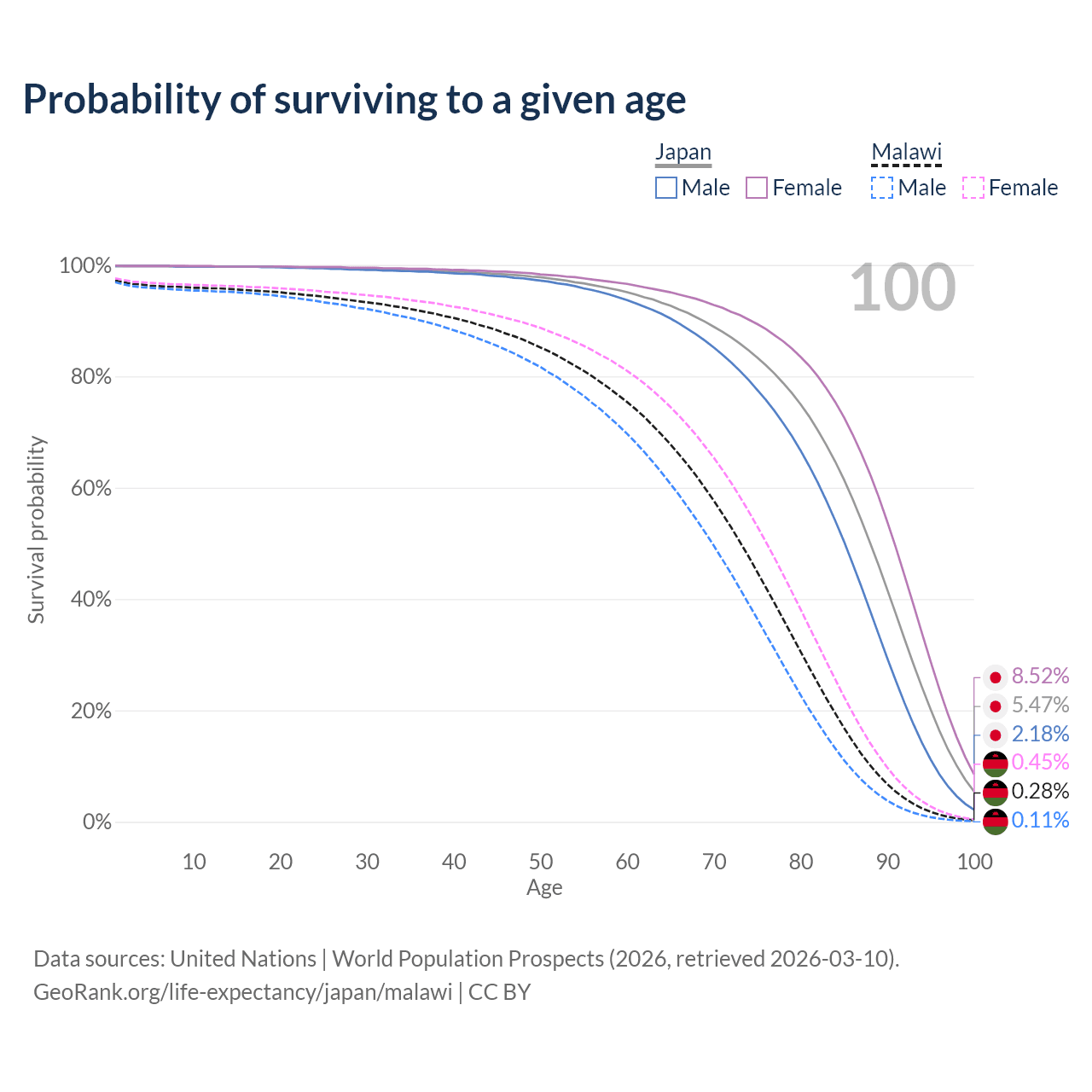 This life expectancy calculator shows the odds of living to 100, 95, 90, and below based on current age for both males and females in Japan and Malawi, along with mean and median age of death. The calculations are based on the 2026 life tables (actuarial tables) from the UN World Population Prospects.