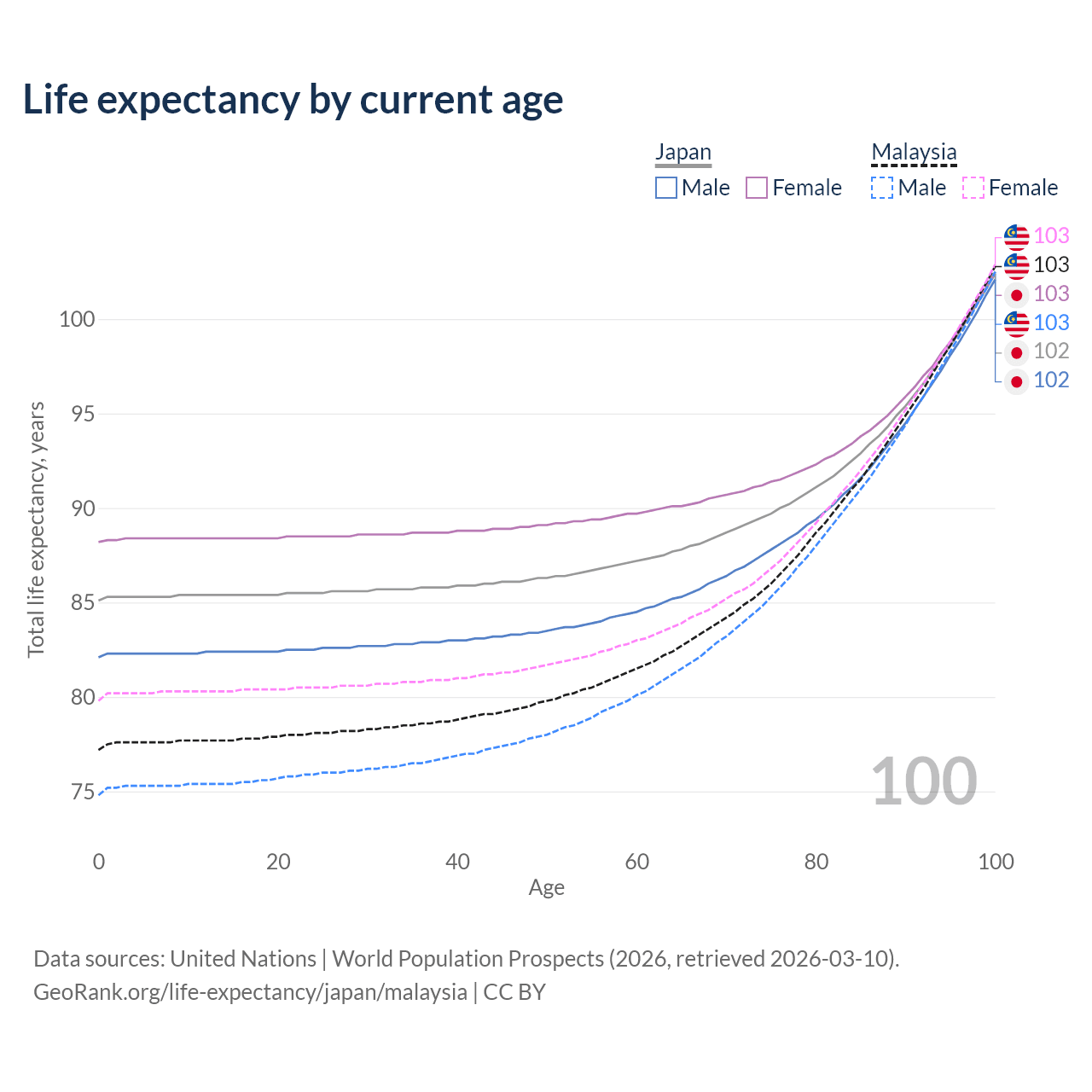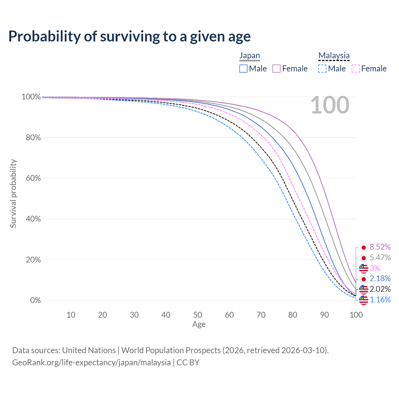 This life expectancy calculator shows the odds of living to 100, 95, 90, and below based on current age for both males and females in Japan and Malaysia, along with mean and median age of death. The calculations are based on the 2026 life tables (actuarial tables) from the UN World Population Prospects.