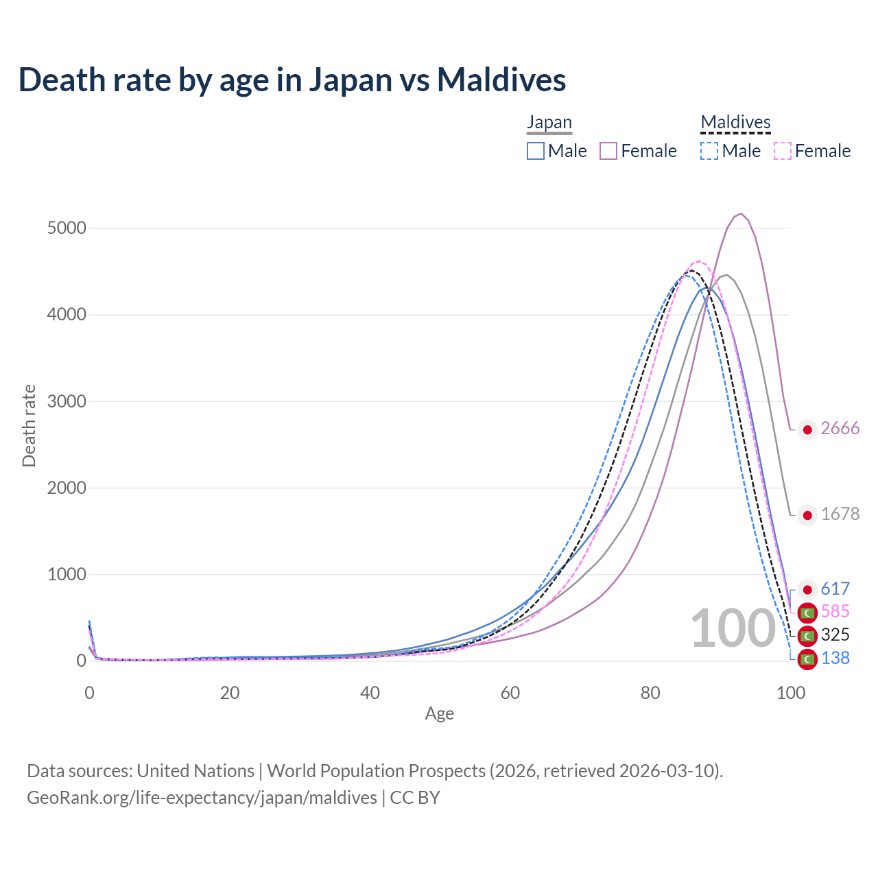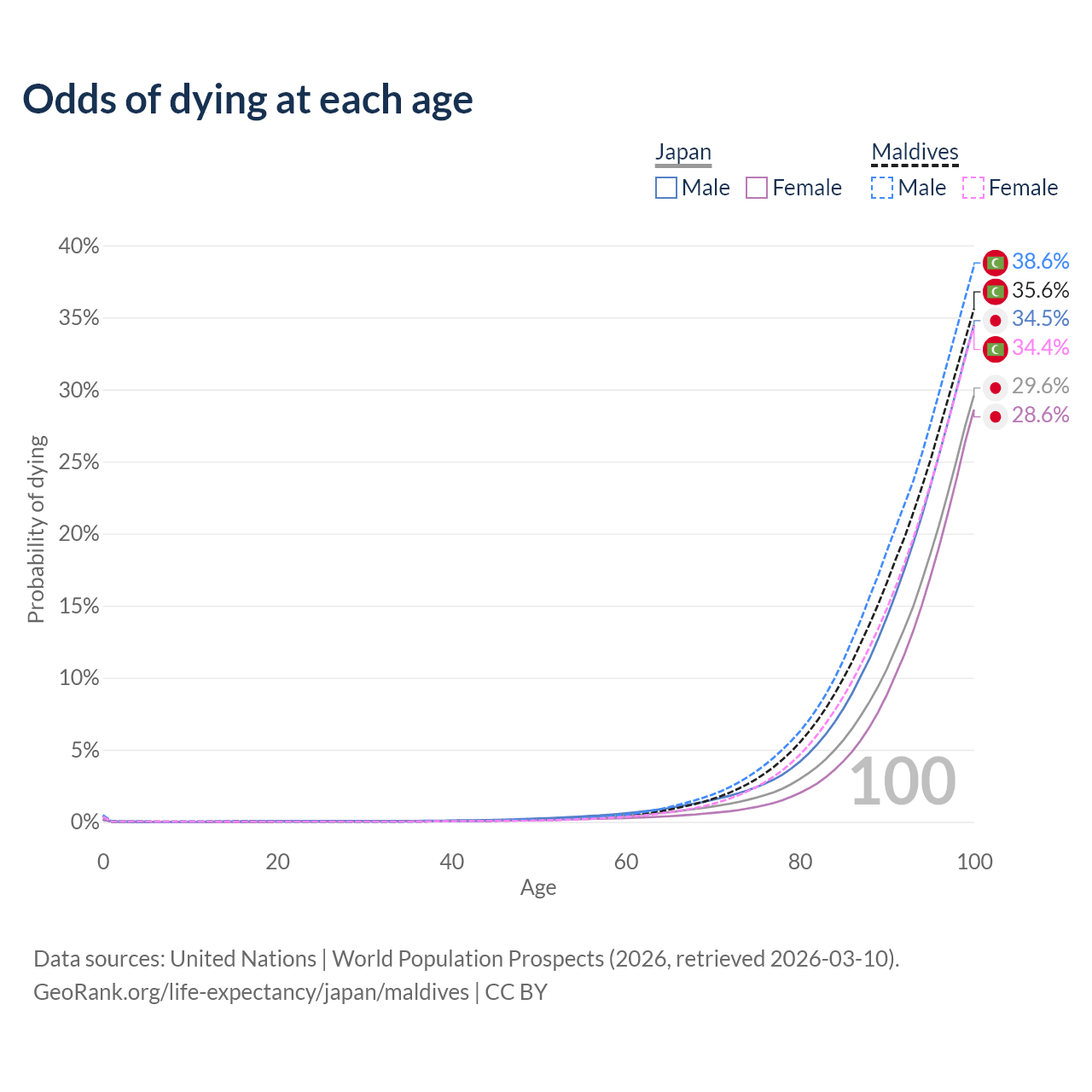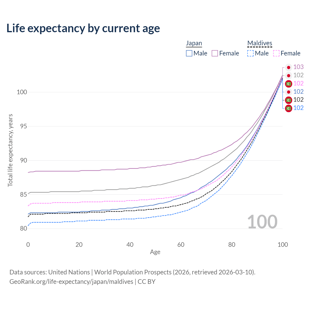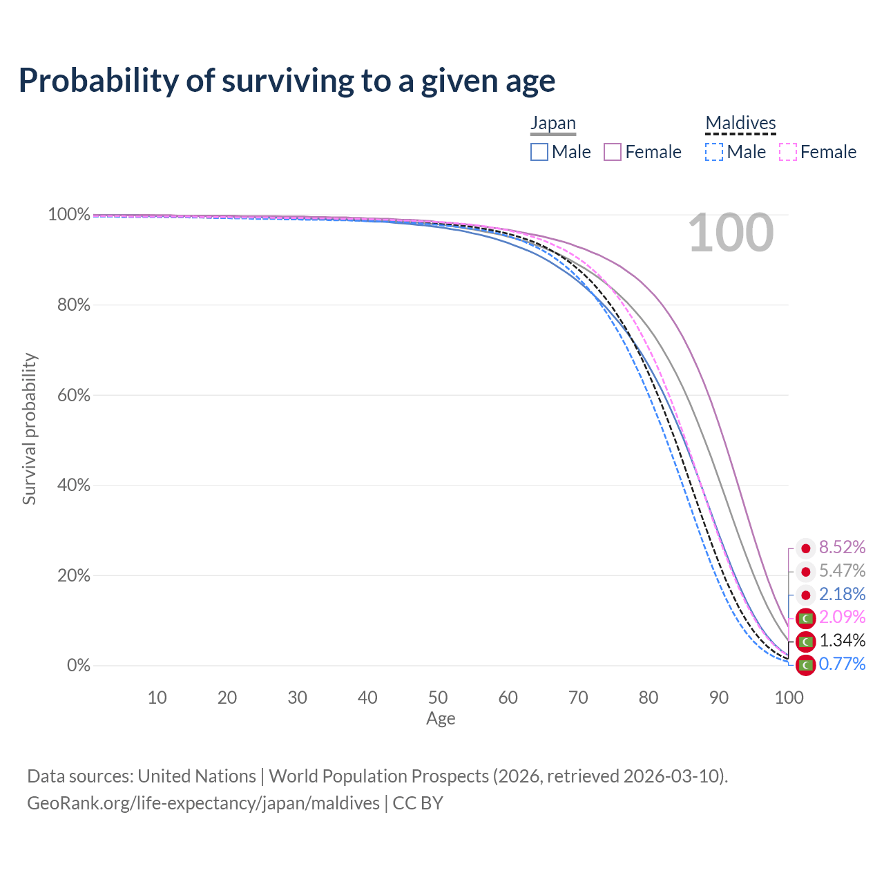This life expectancy calculator shows the odds of living to 100, 95, 90, and below based on current age for both males and females in Japan and Maldives, along with mean and median age of death. The calculations are based on the 2026 life tables (actuarial tables) from the UN World Population Prospects.