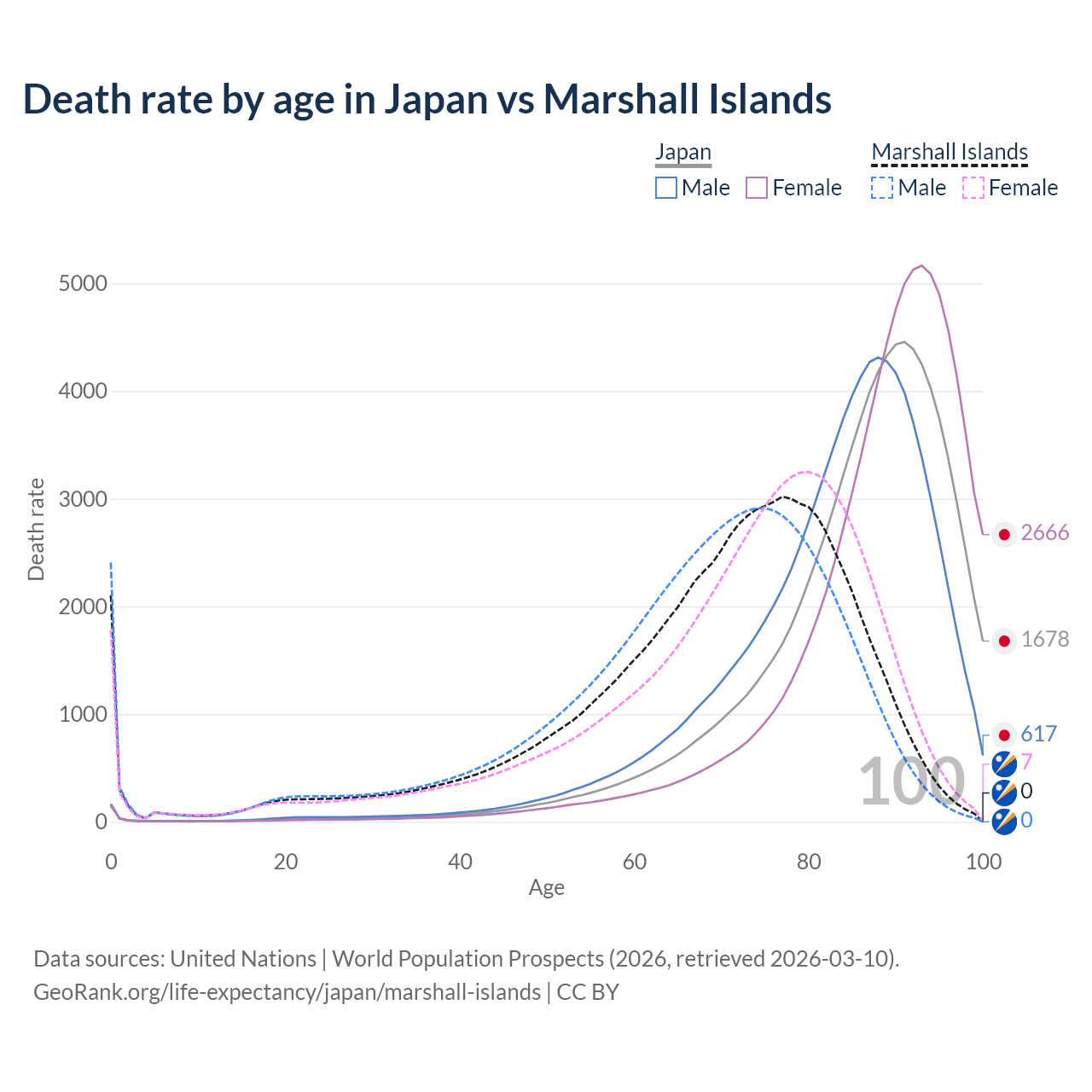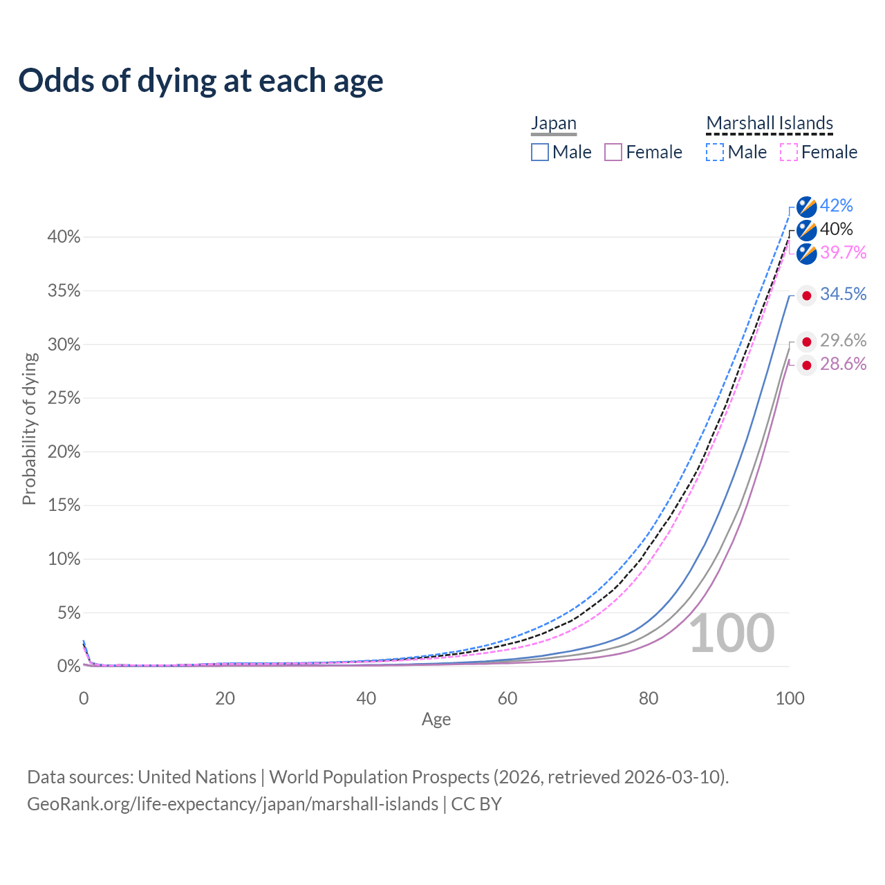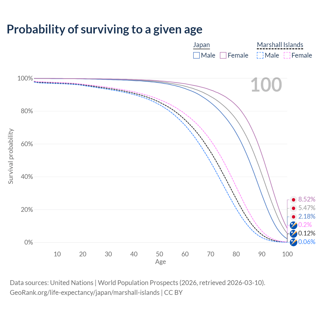 This life expectancy calculator shows the odds of living to 100, 95, 90, and below based on current age for both males and females in Japan and the Marshall Islands, along with mean and median age of death. The calculations are based on the 2026 life tables (actuarial tables) from the UN World Population Prospects.