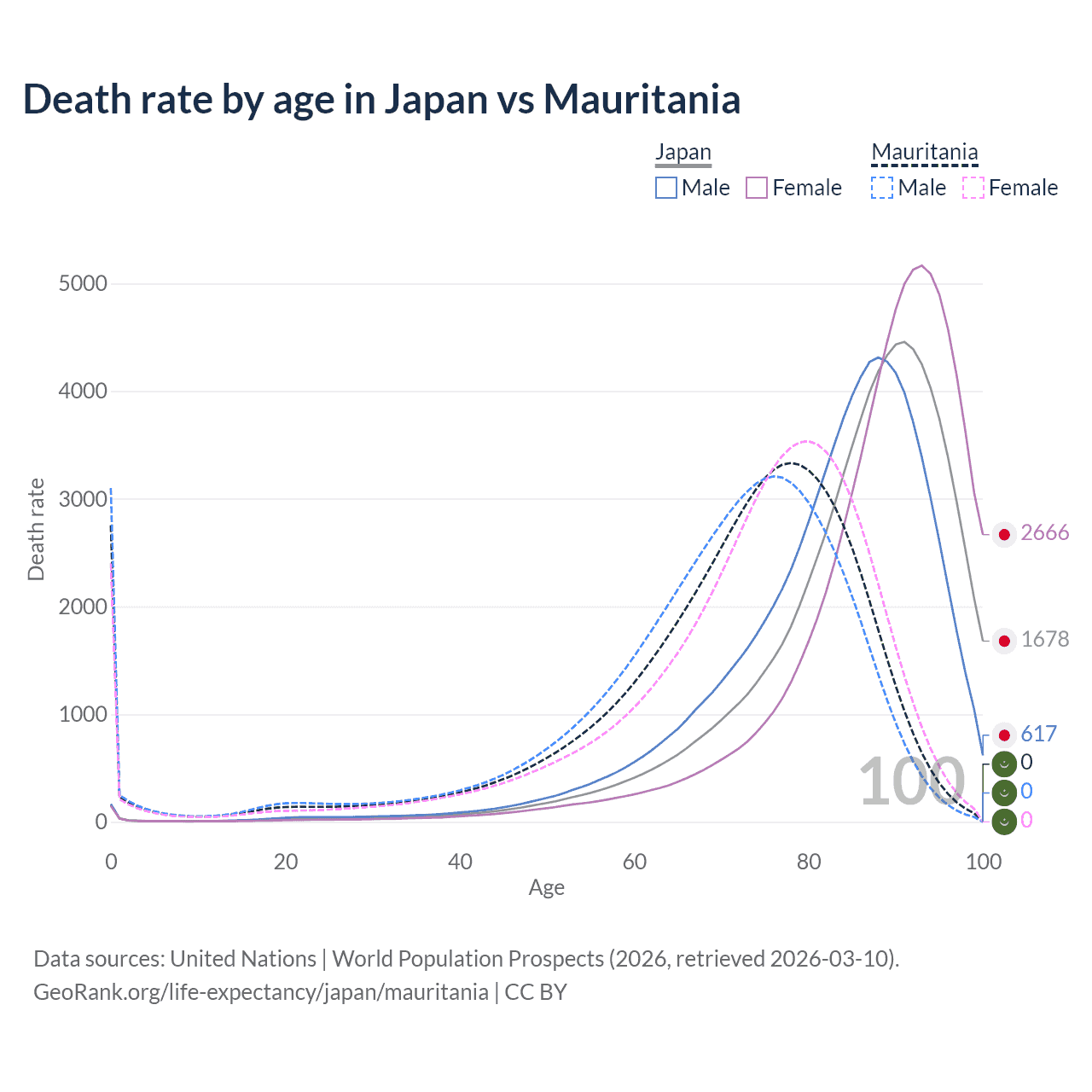In Japan, the most common age of death is 91, compared to 78 in Mauritania. The median age of death is 88.1 in Japan and 74.1 in Mauritania, meaning only half of each cohort is expected to live past that age.