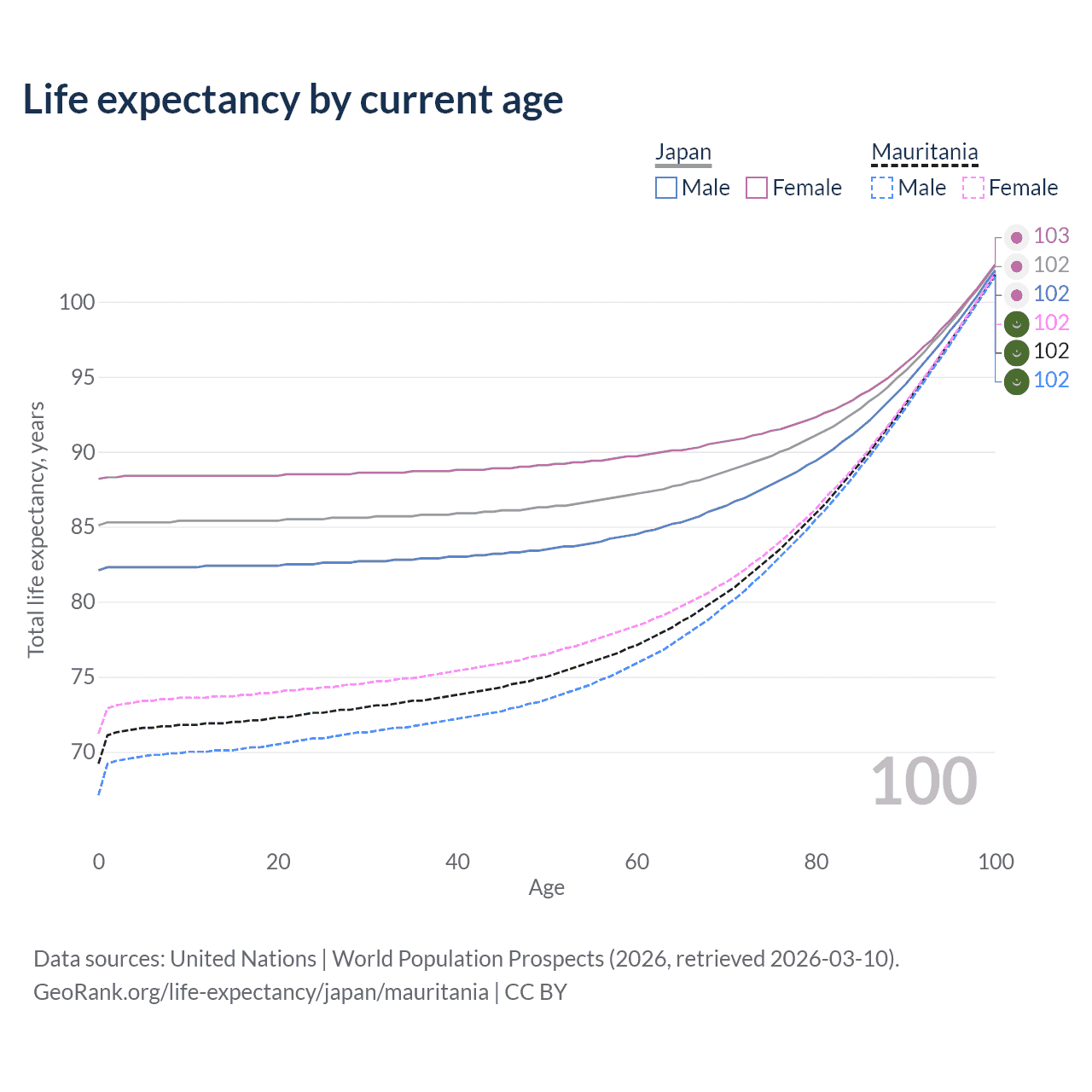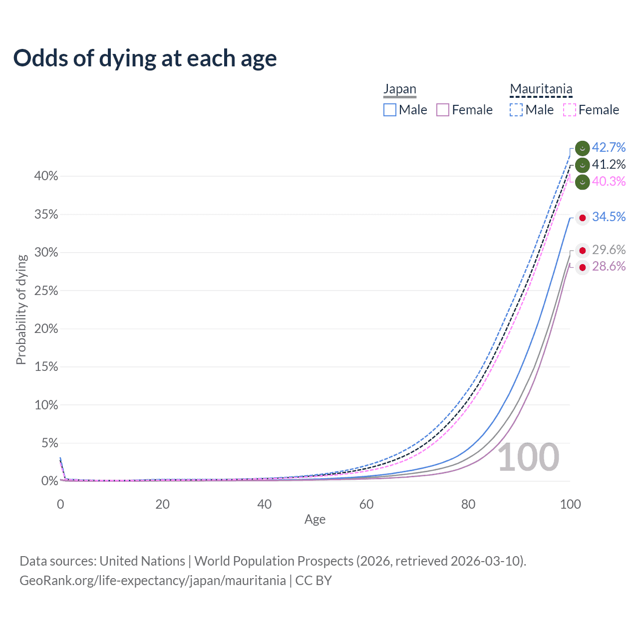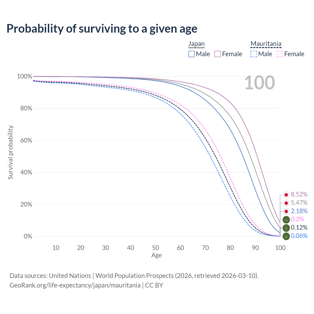 This life expectancy calculator shows the odds of living to 100, 95, 90, and below based on current age for both males and females in Japan and Mauritania, along with mean and median age of death. The calculations are based on the 2026 life tables (actuarial tables) from the UN World Population Prospects.