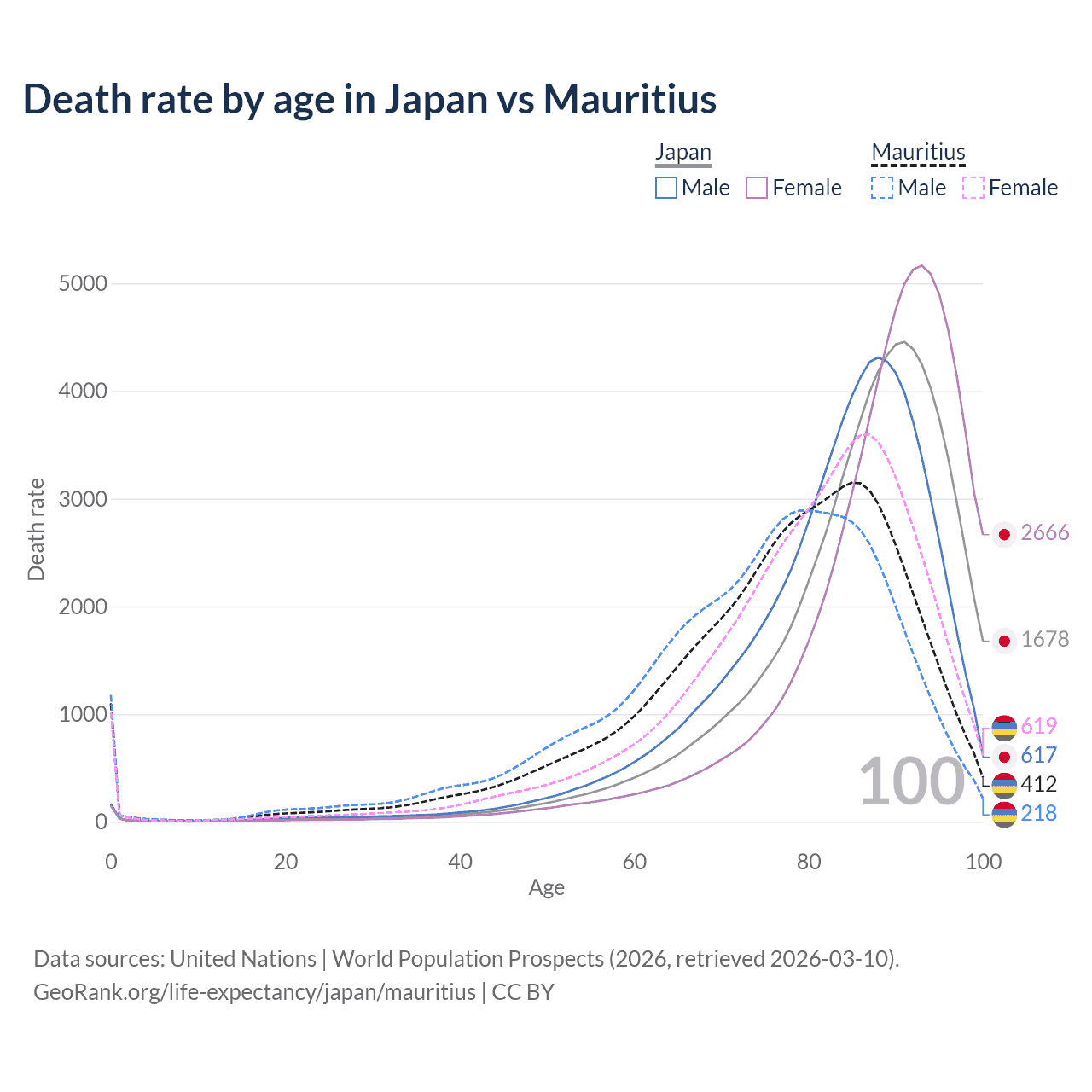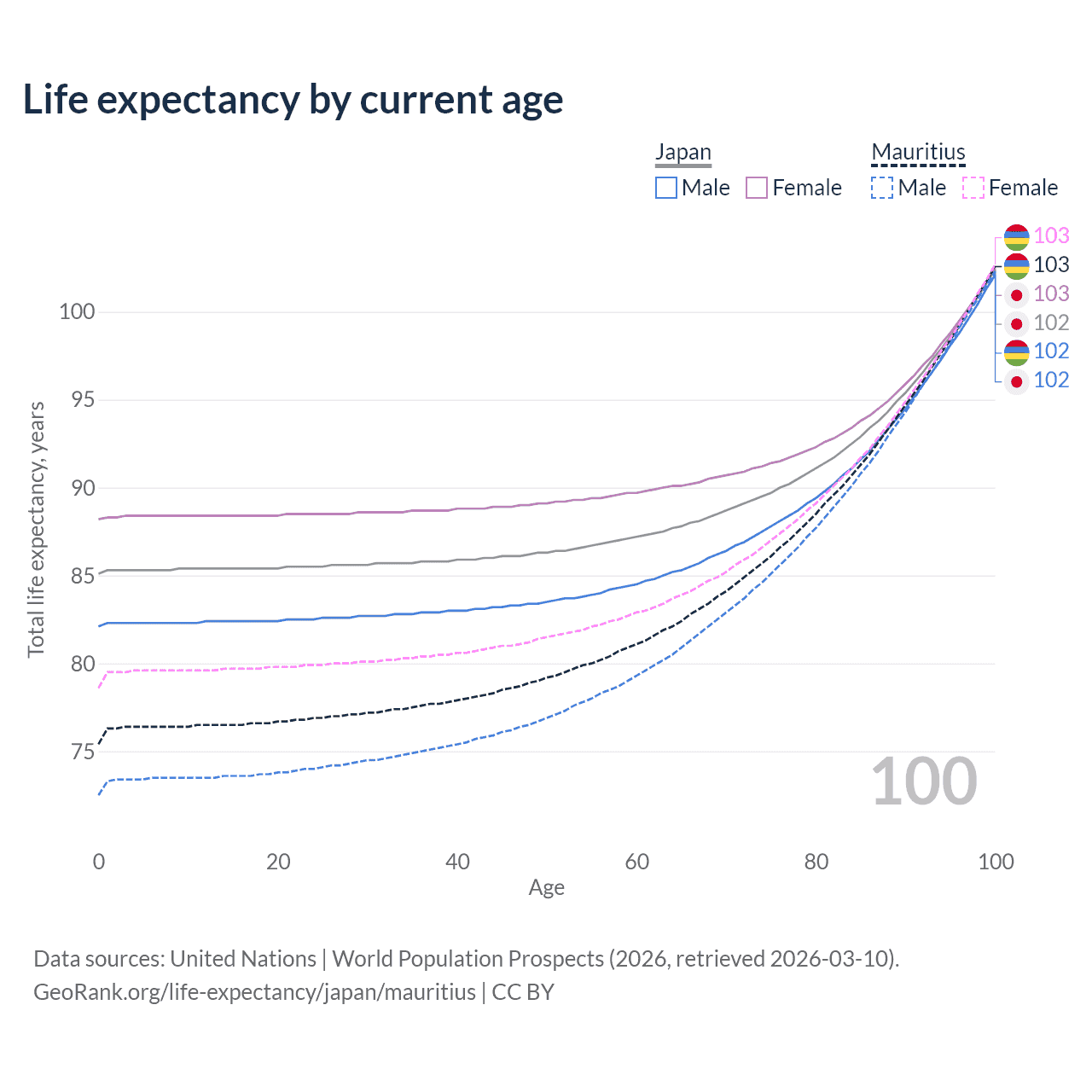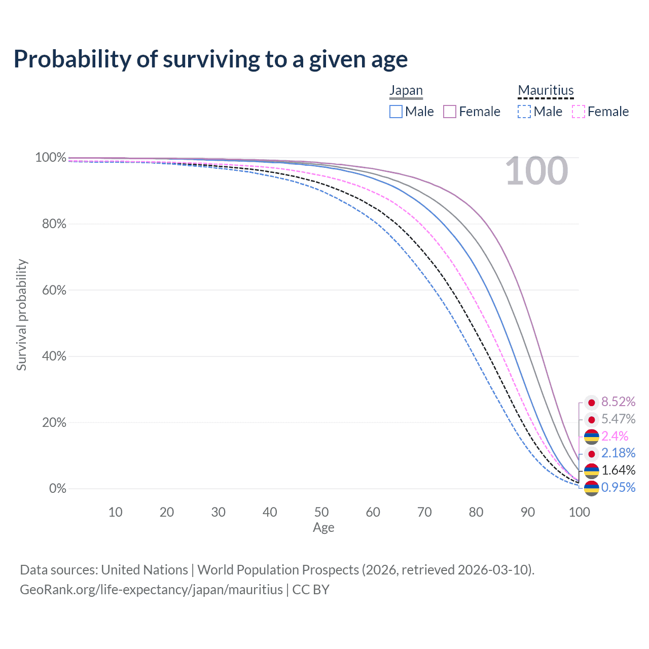 This life expectancy calculator shows the odds of living to 100, 95, 90, and below based on current age for both males and females in Japan and Mauritius, along with mean and median age of death. The calculations are based on the 2026 life tables (actuarial tables) from the UN World Population Prospects.