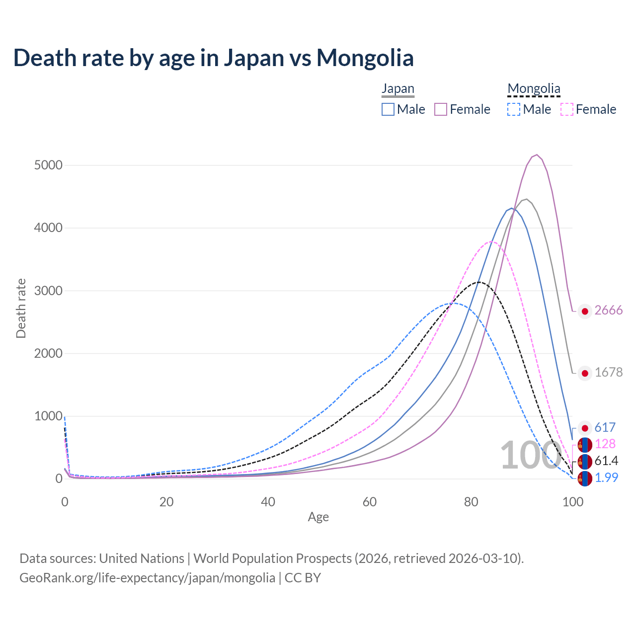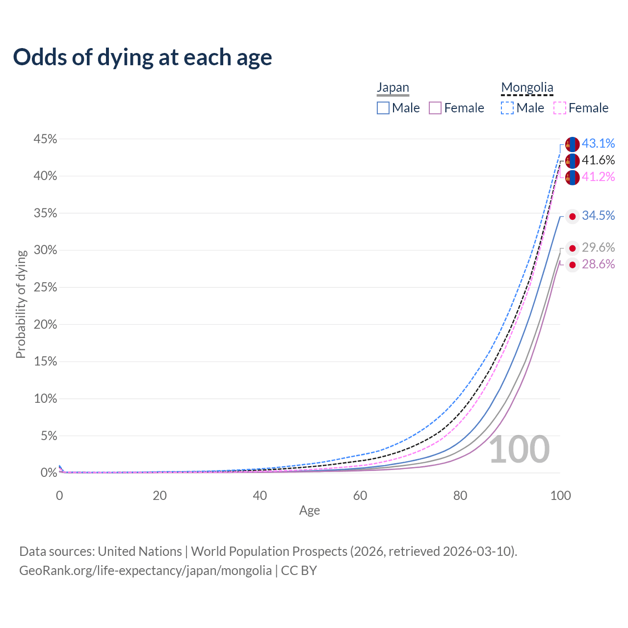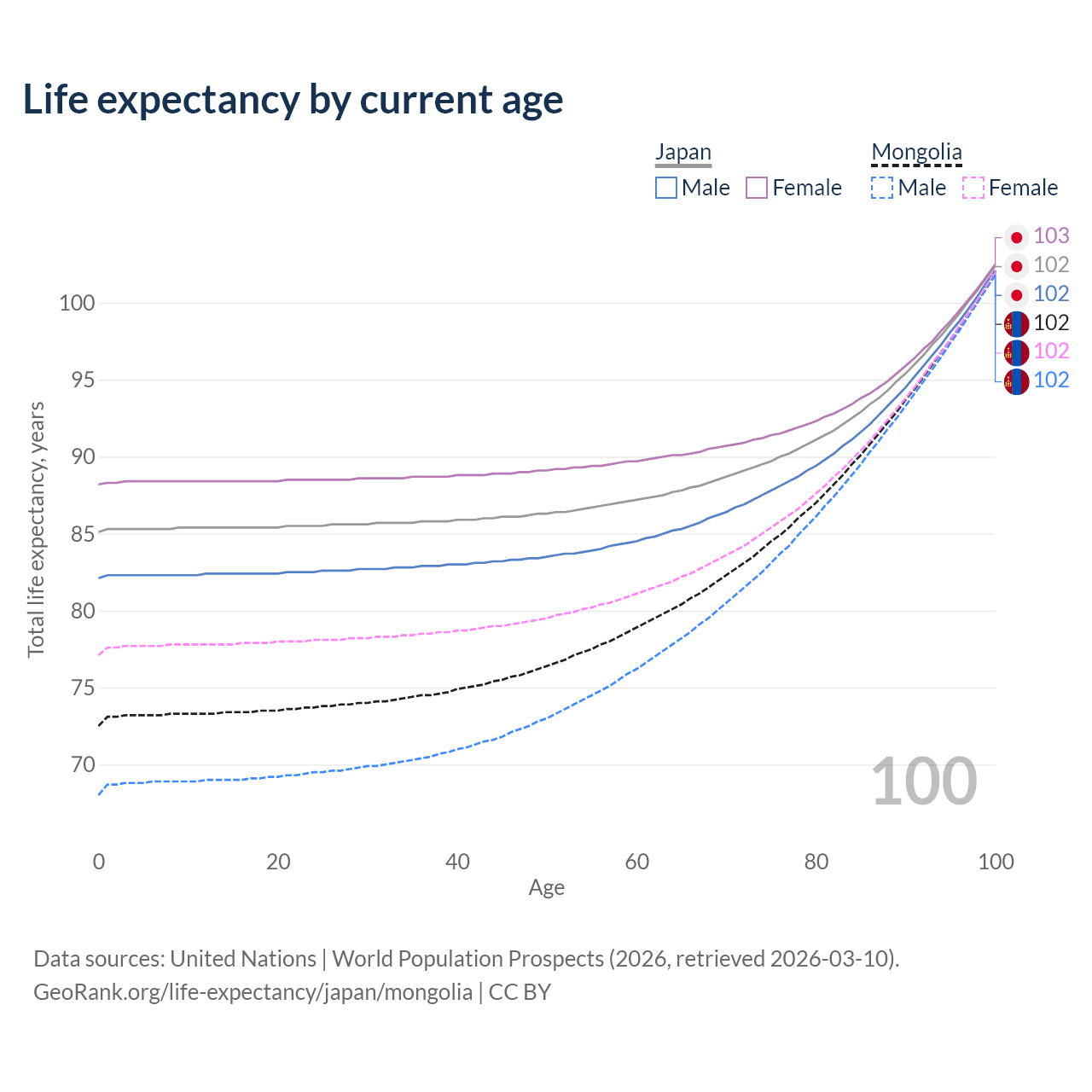 This life expectancy calculator shows the odds of living to 100, 95, 90, and below based on current age for both males and females in Japan and Mongolia, along with mean and median age of death. The calculations are based on the 2026 life tables (actuarial tables) from the UN World Population Prospects.