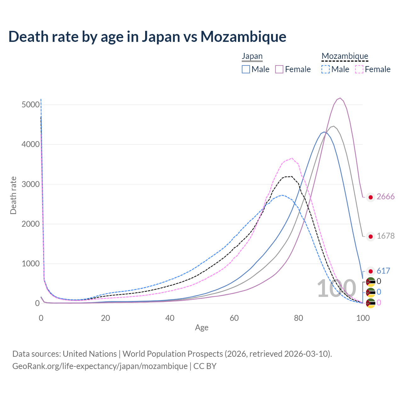 In Japan, the most common age of death is 91, compared to 0 in Mozambique. The median age of death is 88.1 in Japan and 71.2 in Mozambique, meaning only half of each cohort is expected to live past that age.