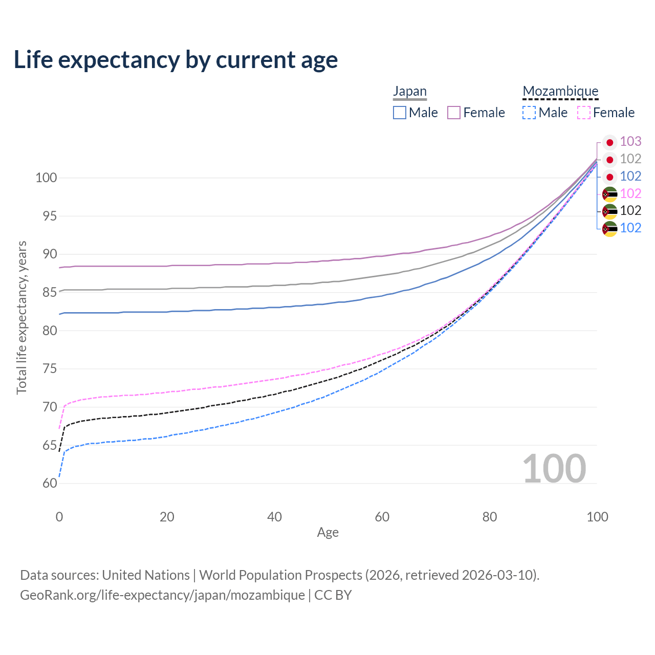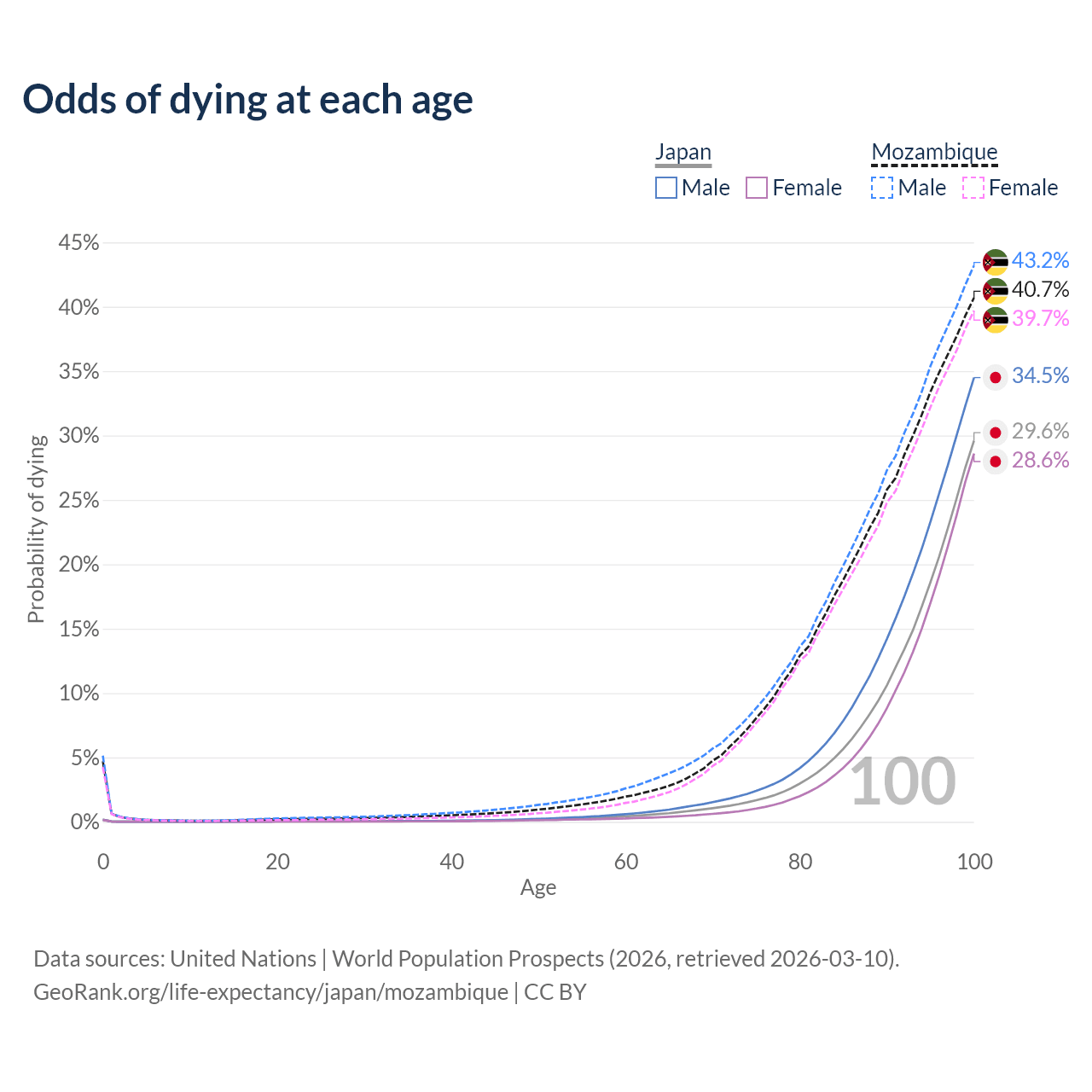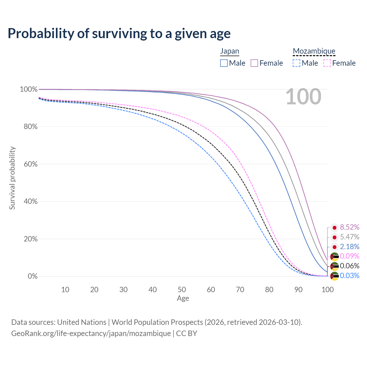 This life expectancy calculator shows the odds of living to 100, 95, 90, and below based on current age for both males and females in Japan and Mozambique, along with mean and median age of death. The calculations are based on the 2026 life tables (actuarial tables) from the UN World Population Prospects.