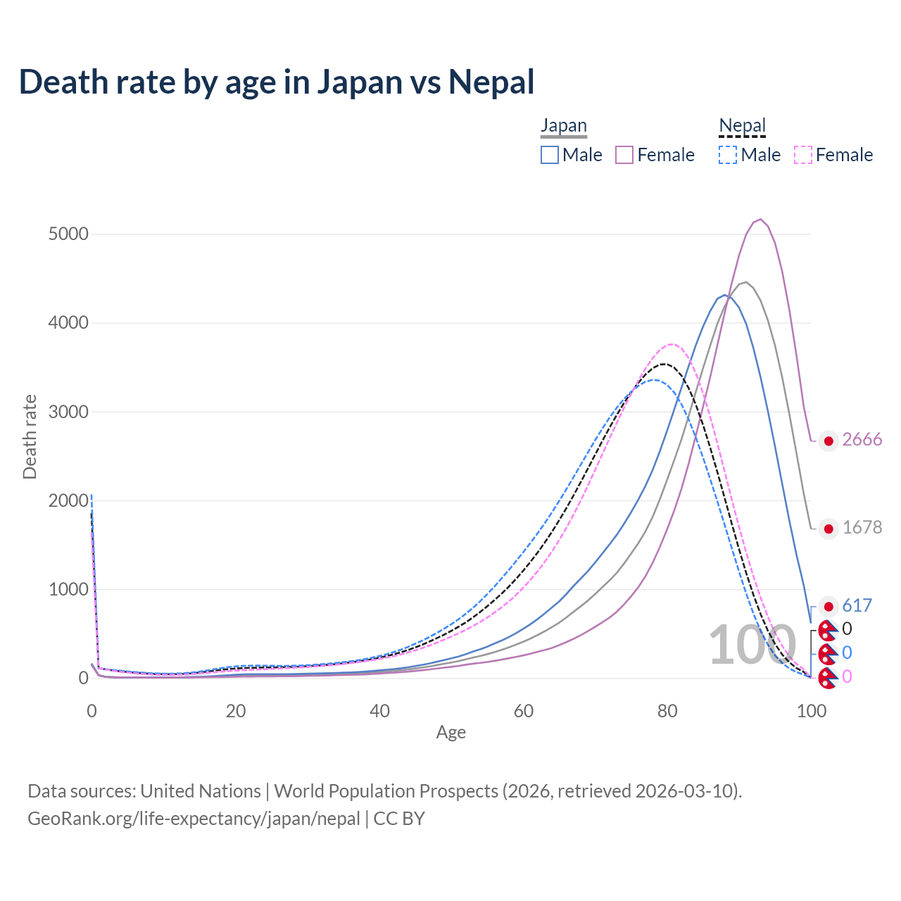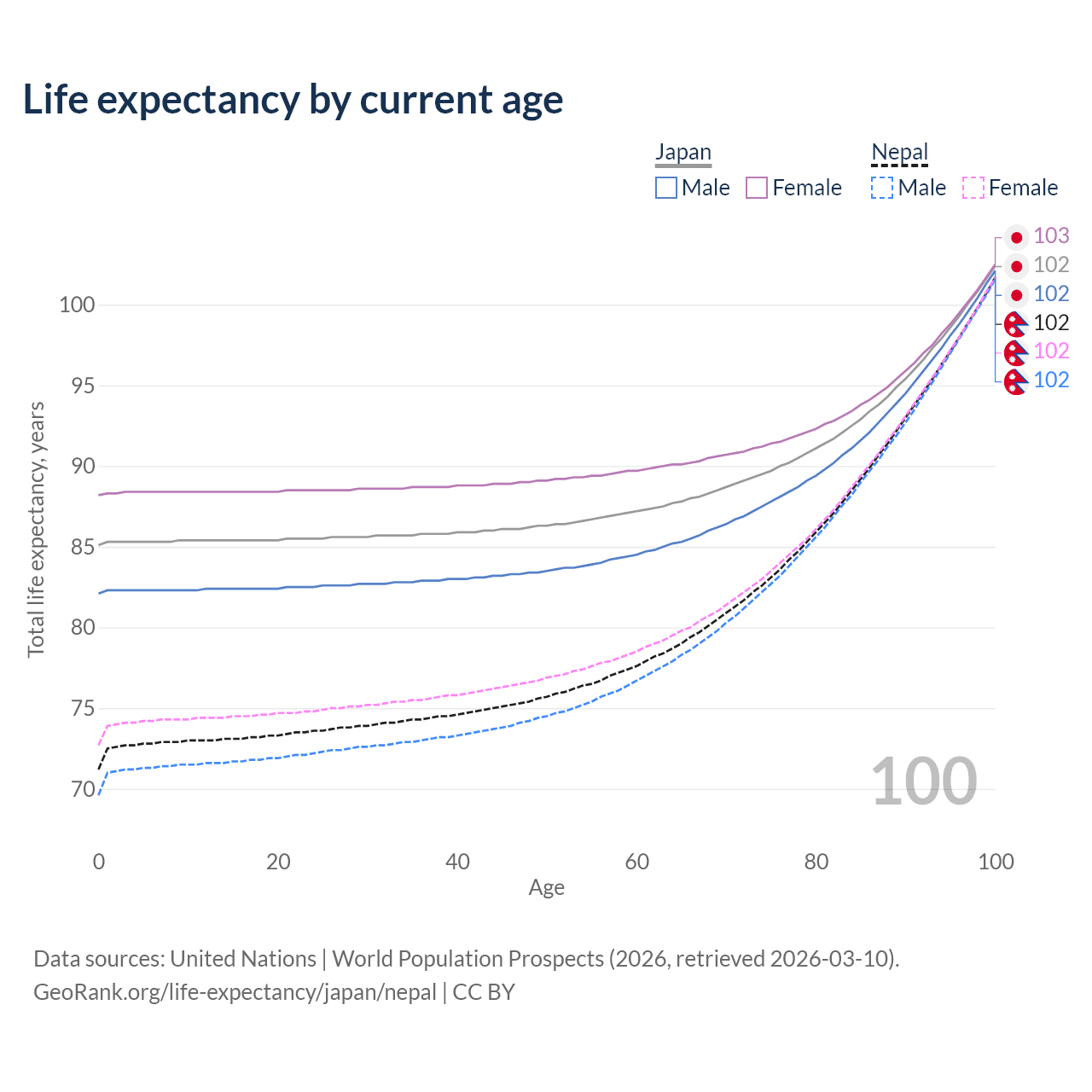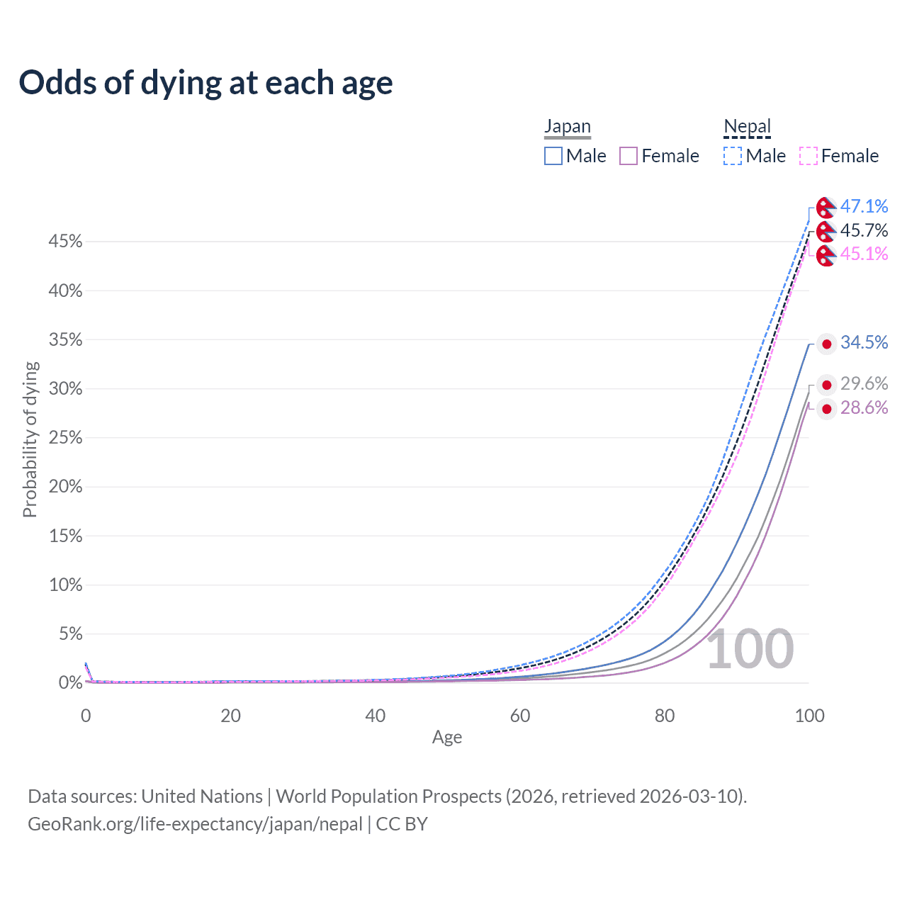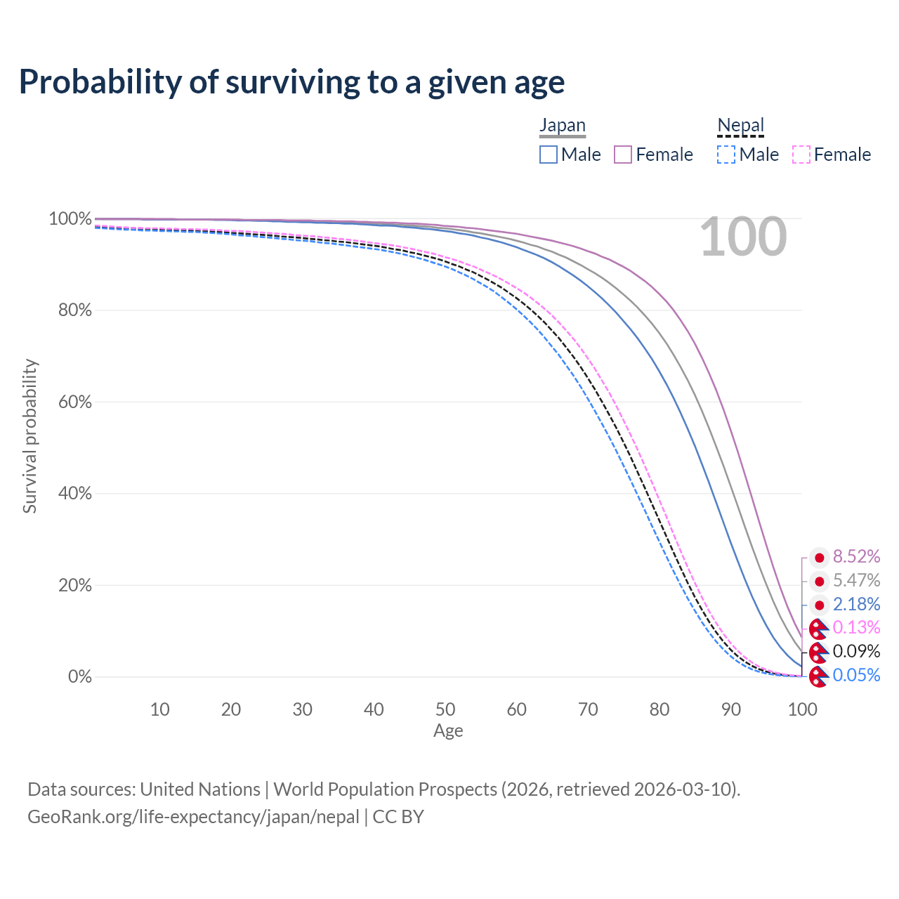 This life expectancy calculator shows the odds of living to 100, 95, 90, and below based on current age for both males and females in Japan and Nepal, along with mean and median age of death. The calculations are based on the 2026 life tables (actuarial tables) from the UN World Population Prospects.
