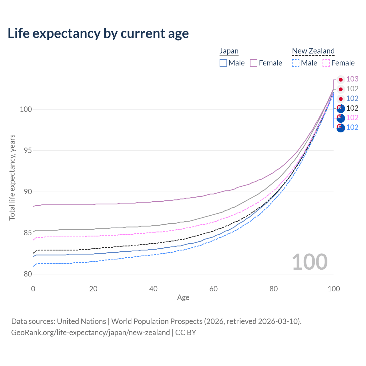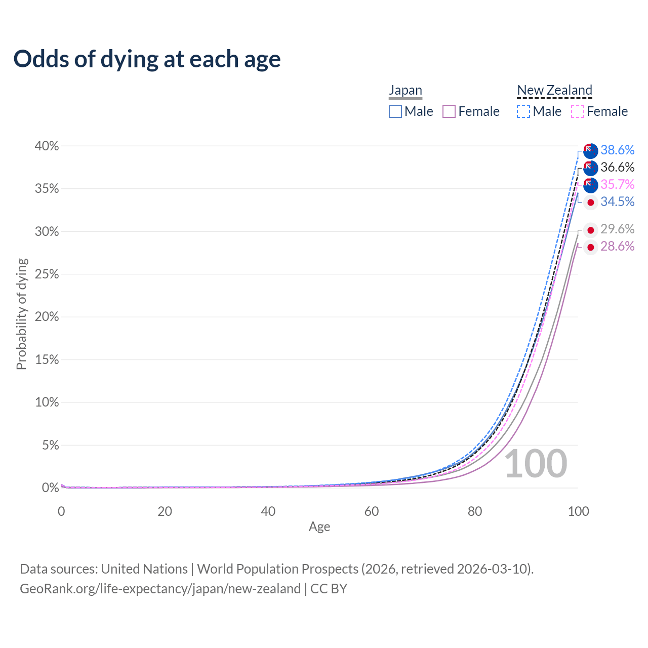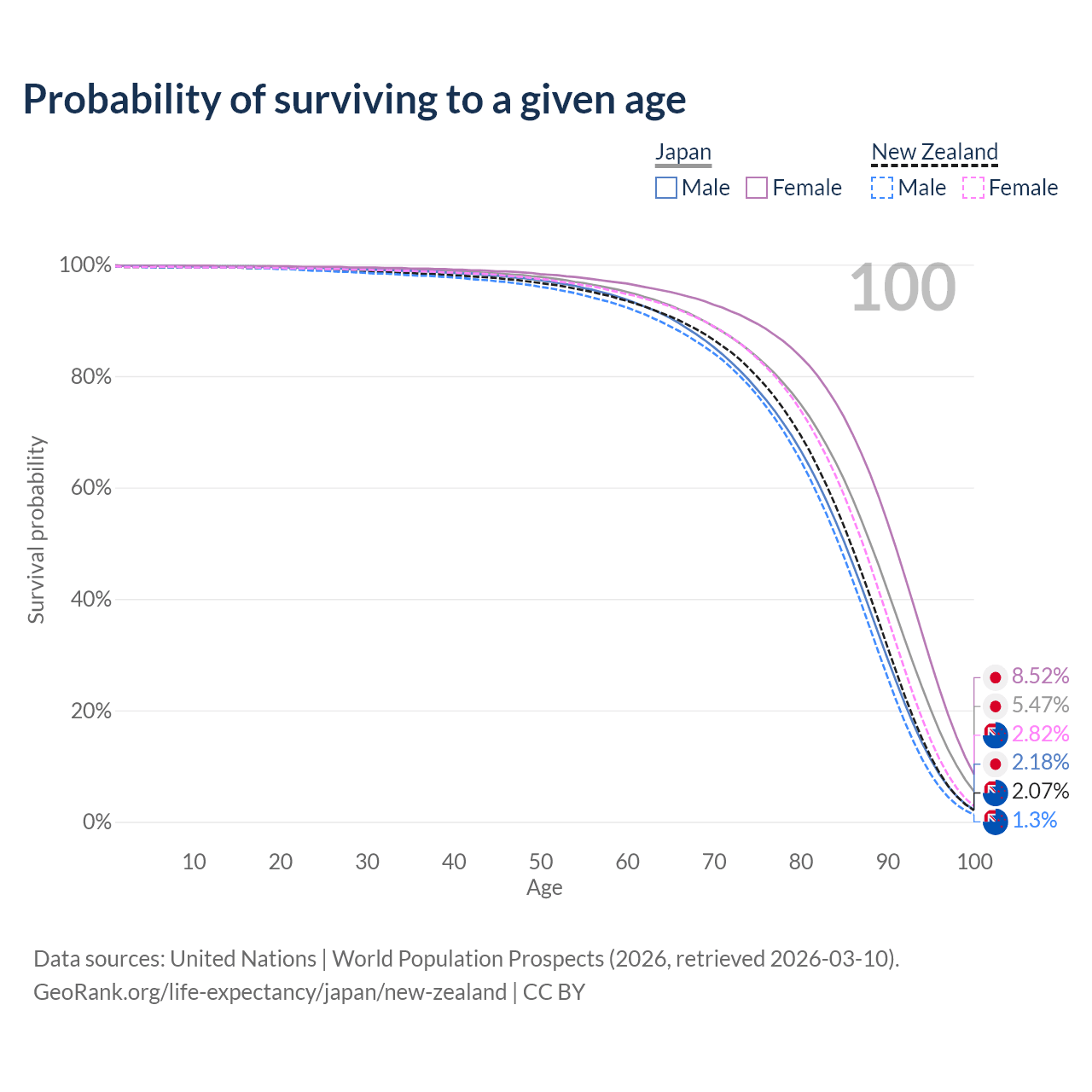 This life expectancy calculator shows the odds of living to 100, 95, 90, and below based on current age for both males and females in Japan and New Zealand, along with mean and median age of death. The calculations are based on the 2026 life tables (actuarial tables) from the UN World Population Prospects.