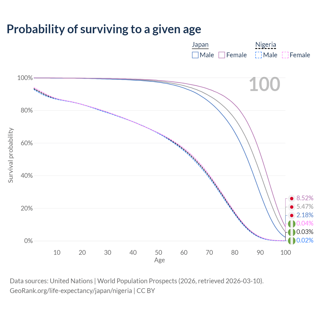 This life expectancy calculator shows the odds of living to 100, 95, 90, and below based on current age for both males and females in Japan and Nigeria, along with mean and median age of death. The calculations are based on the 2026 life tables (actuarial tables) from the UN World Population Prospects.