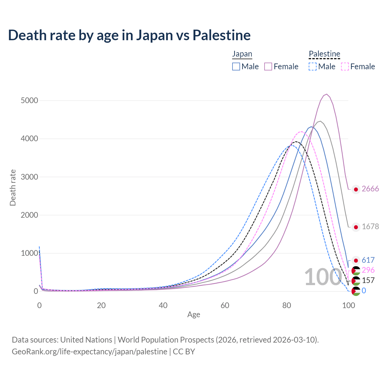 In Japan, the most common age of death is 91, compared to 83 in Palestine. The median age of death is 88.1 in Japan and 80.5 in Palestine, meaning only half of each cohort is expected to live past that age.