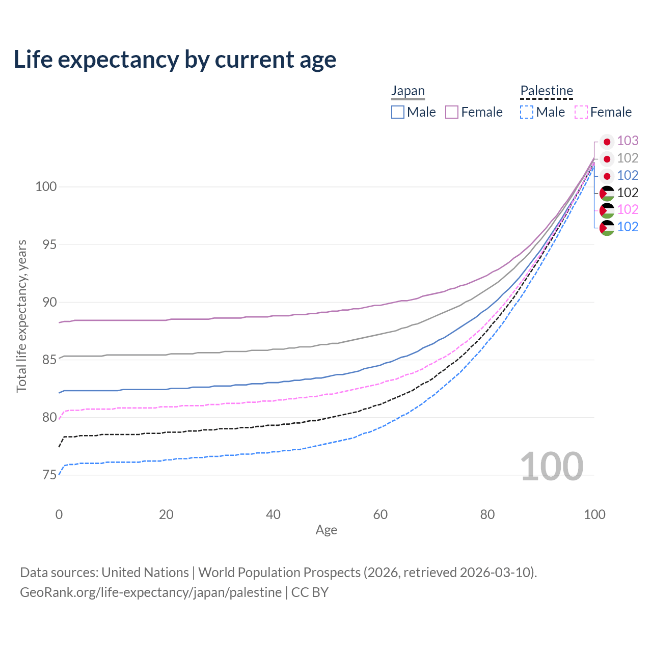 This life expectancy calculator shows the odds of living to 100, 95, 90, and below based on current age for both males and females in Japan and Palestine, along with mean and median age of death. The calculations are based on the 2026 life tables (actuarial tables) from the UN World Population Prospects.