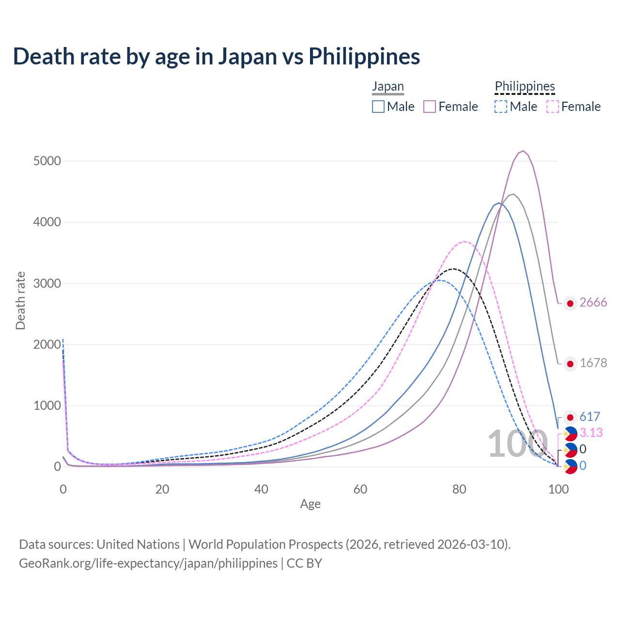 In Japan, the most common age of death is 91, compared to 79 in the Philippines. The median age of death is 88.1 in Japan and 74.6 in the Philippines, meaning only half of each cohort is expected to live past that age.