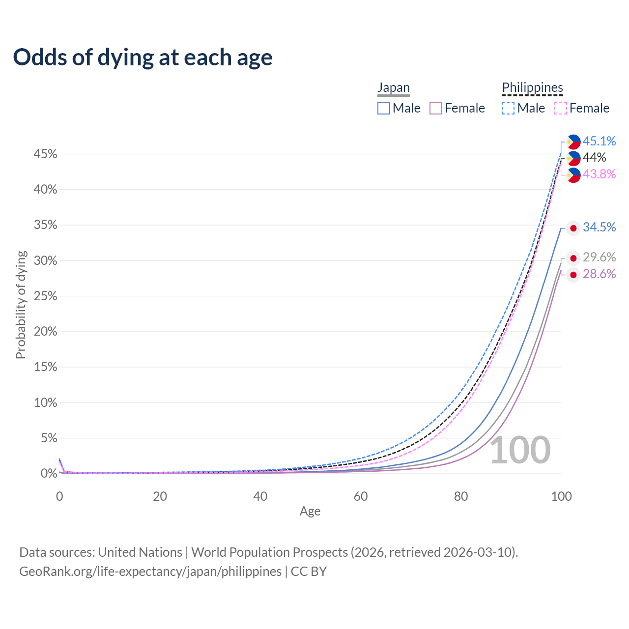 This life expectancy calculator shows the odds of living to 100, 95, 90, and below based on current age for both males and females in Japan and the Philippines, along with mean and median age of death. The calculations are based on the 2026 life tables (actuarial tables) from the UN World Population Prospects.