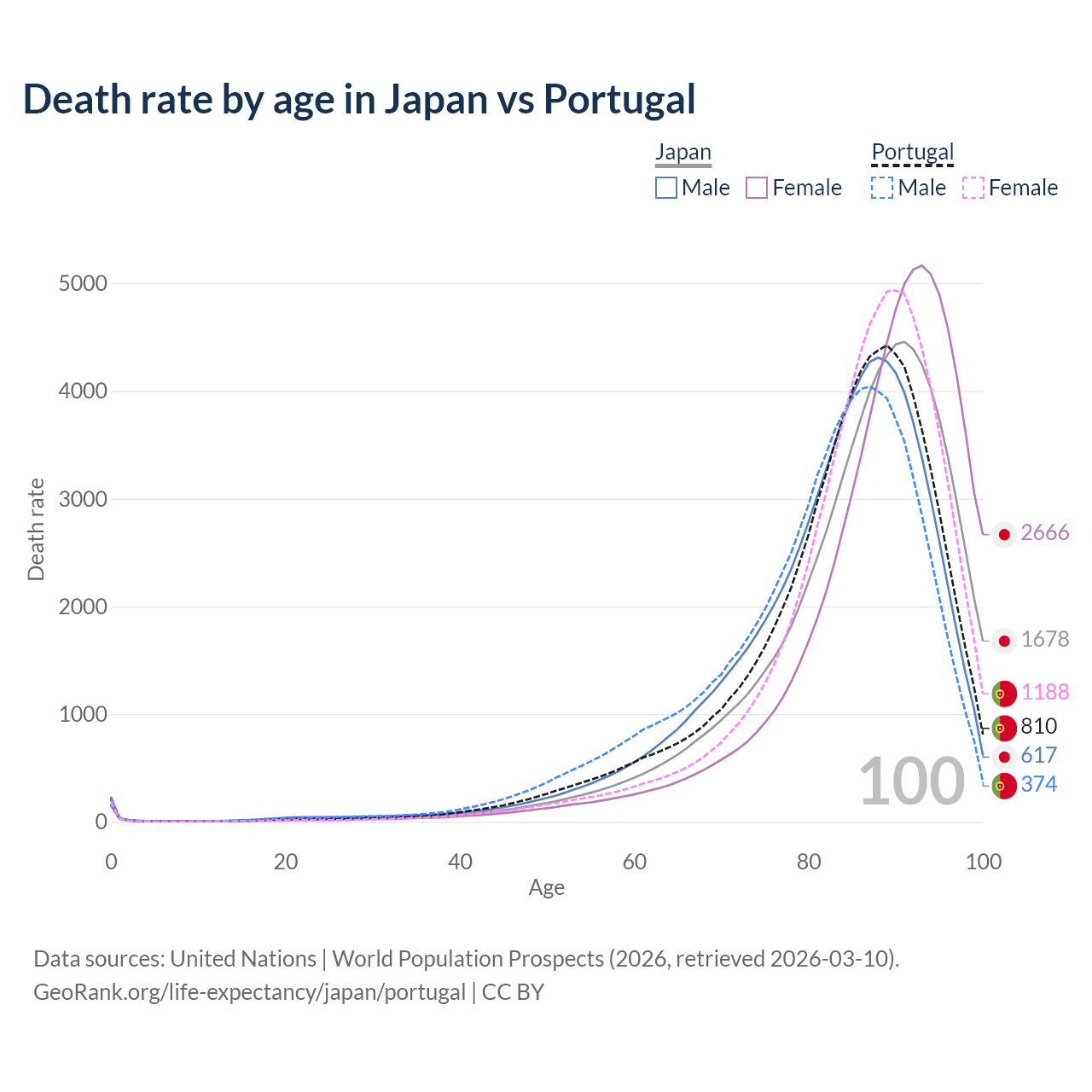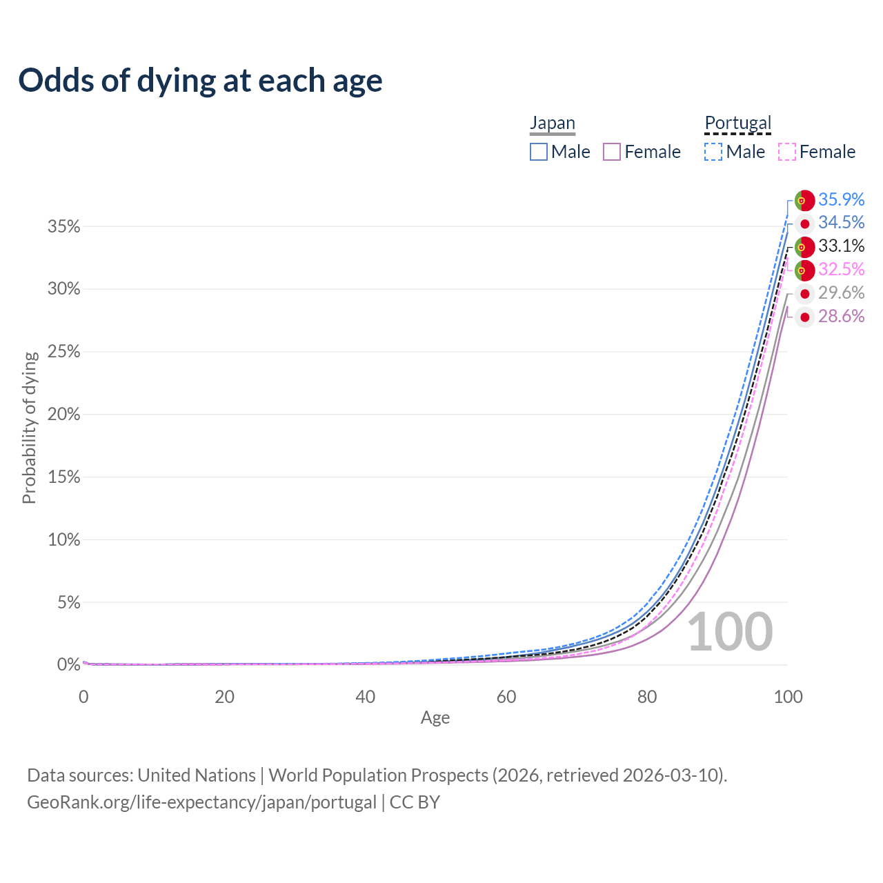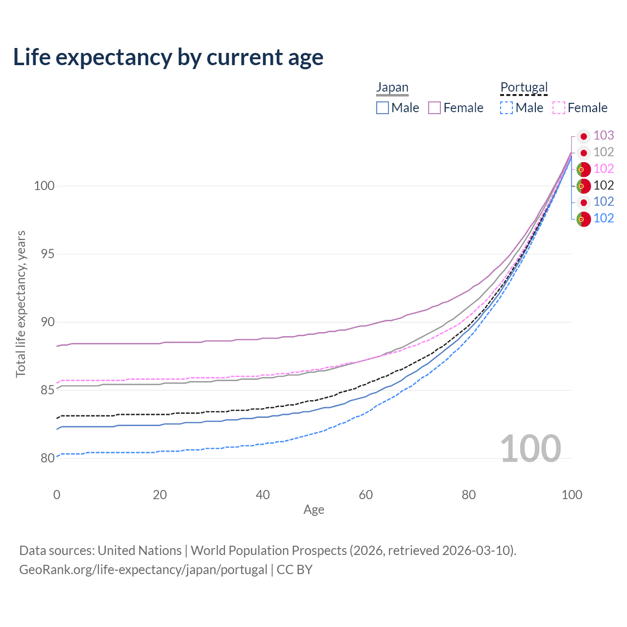 This life expectancy calculator shows the odds of living to 100, 95, 90, and below based on current age for both males and females in Japan and Portugal, along with mean and median age of death. The calculations are based on the 2026 life tables (actuarial tables) from the UN World Population Prospects.