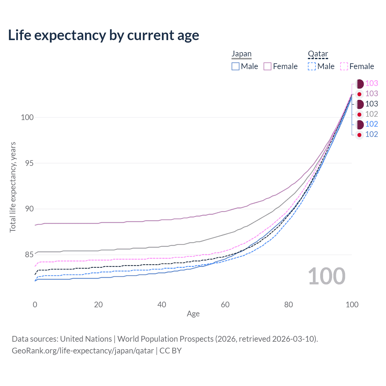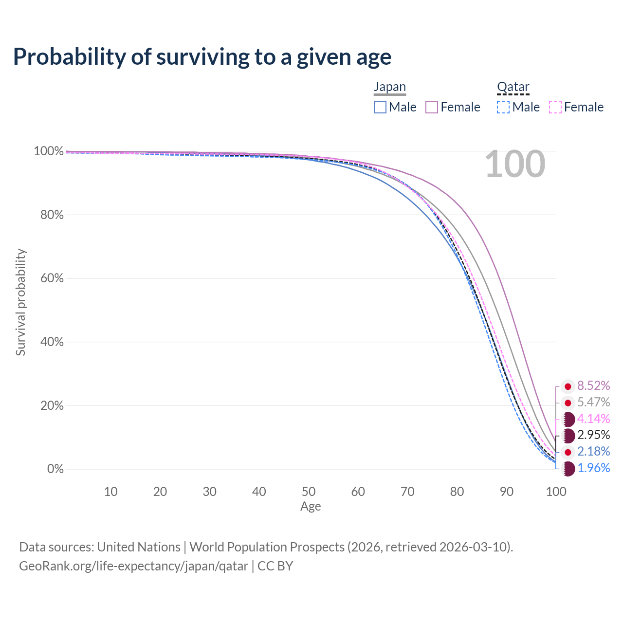 This life expectancy calculator shows the odds of living to 100, 95, 90, and below based on current age for both males and females in Japan and Qatar, along with mean and median age of death. The calculations are based on the 2026 life tables (actuarial tables) from the UN World Population Prospects.
