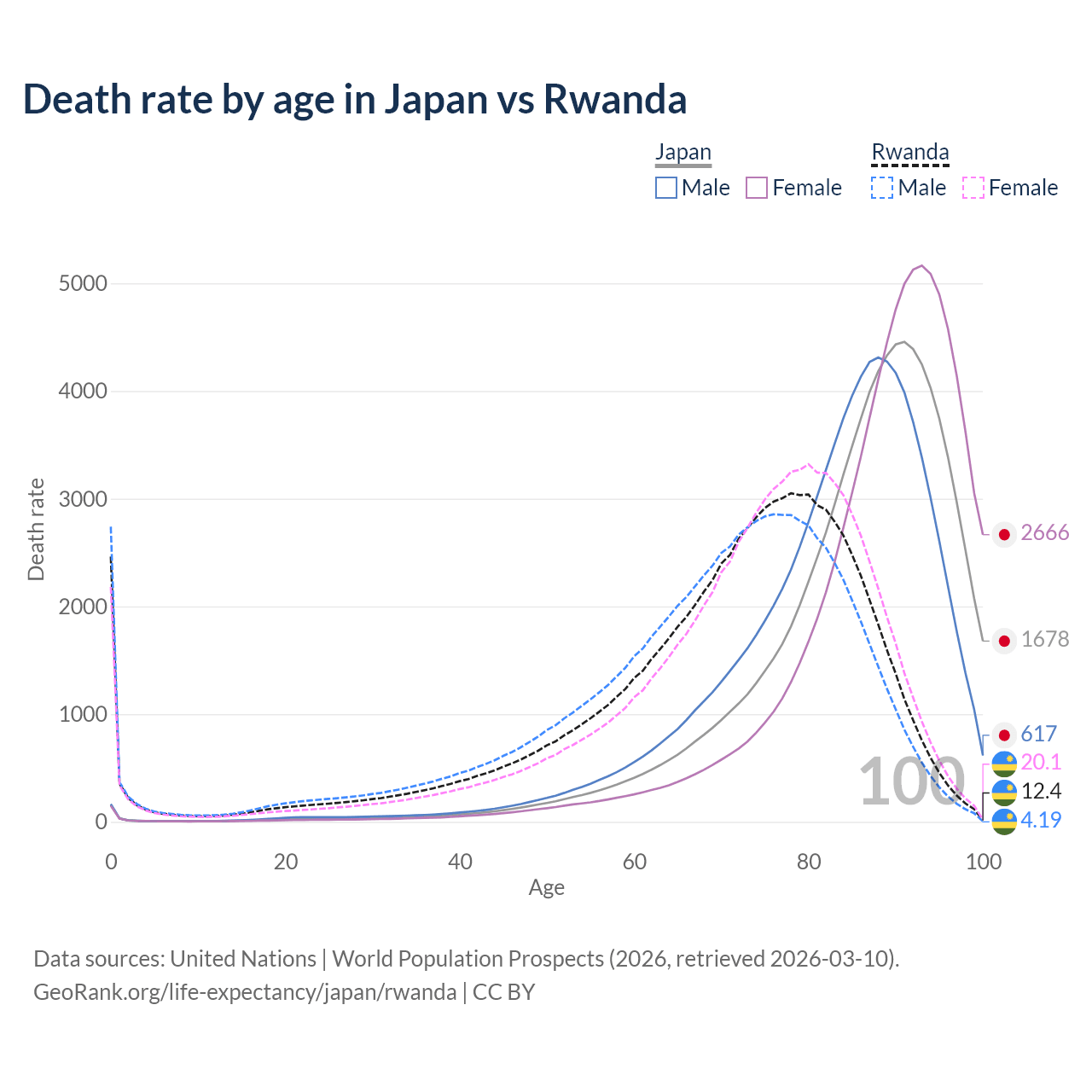In Japan, the most common age of death is 91, compared to 78 in Rwanda. The median age of death is 88.1 in Japan and 73.5 in Rwanda, meaning only half of each cohort is expected to live past that age.