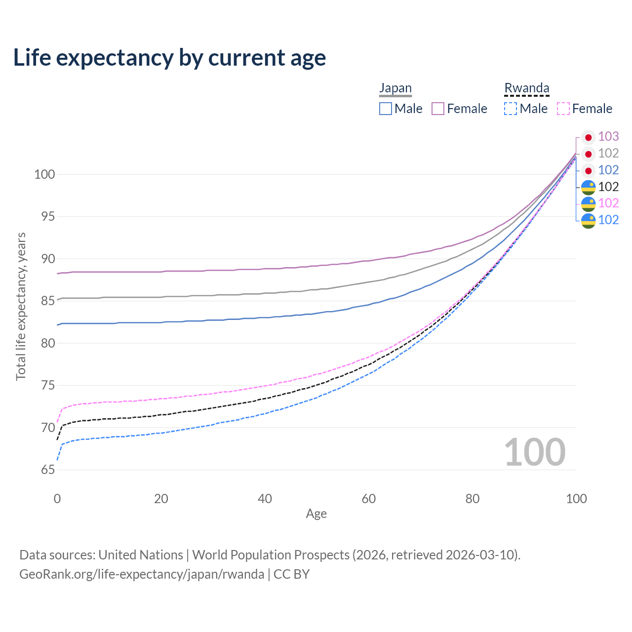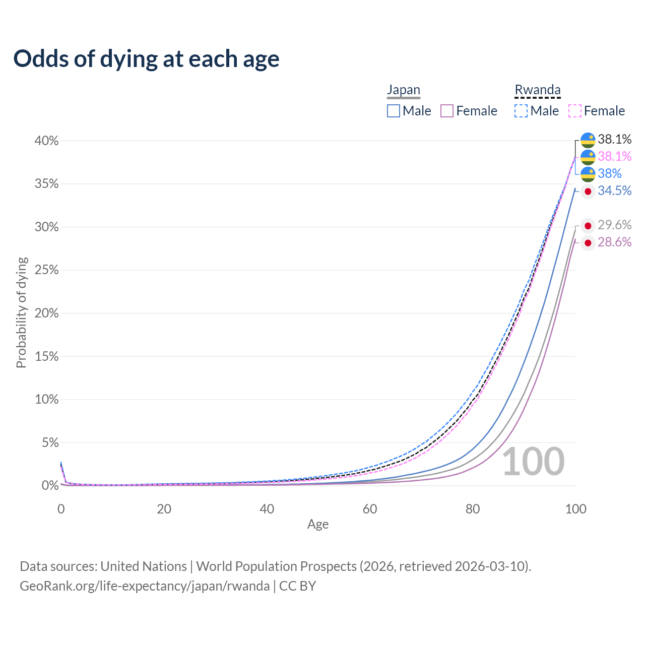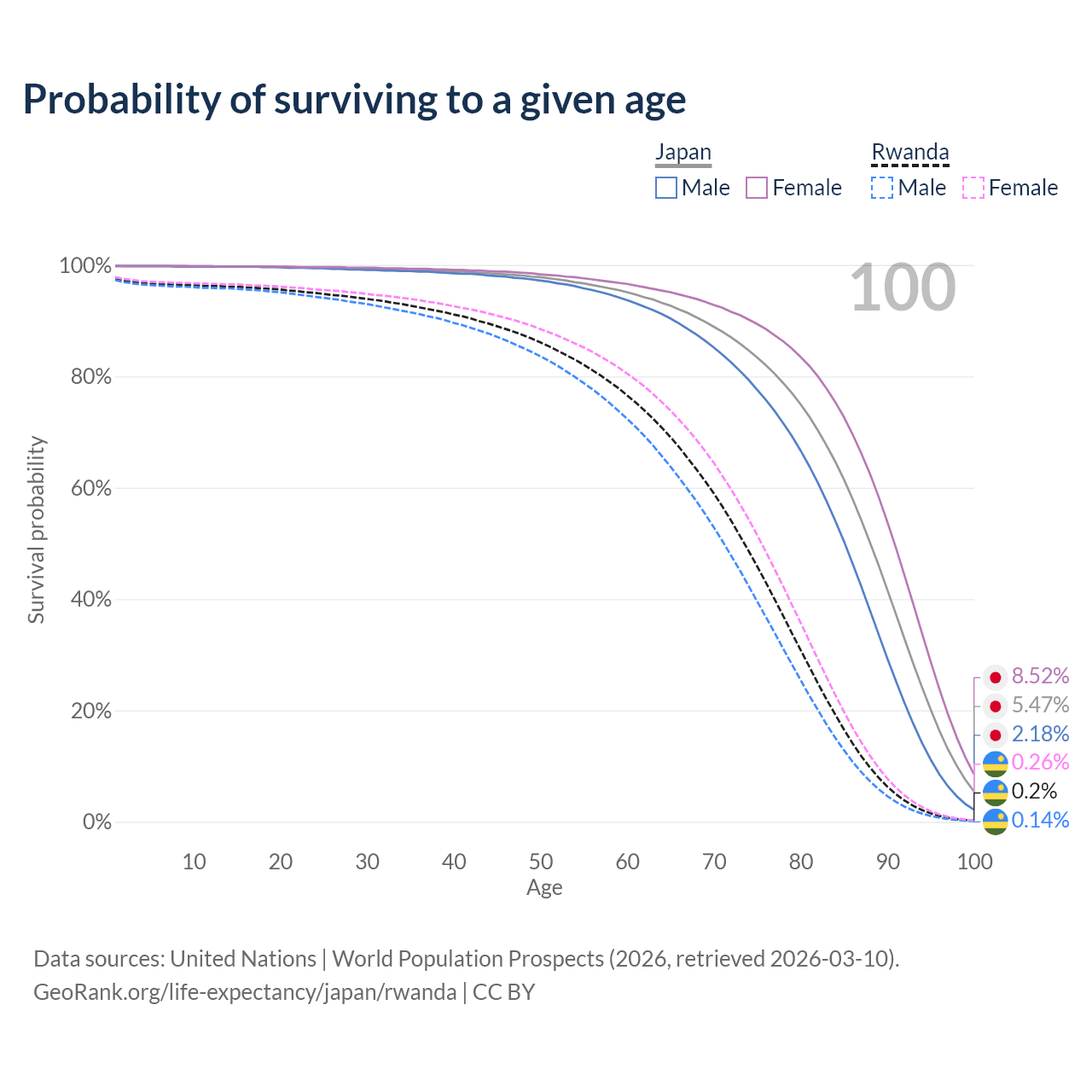This life expectancy calculator shows the odds of living to 100, 95, 90, and below based on current age for both males and females in Japan and Rwanda, along with mean and median age of death. The calculations are based on the 2026 life tables (actuarial tables) from the UN World Population Prospects.