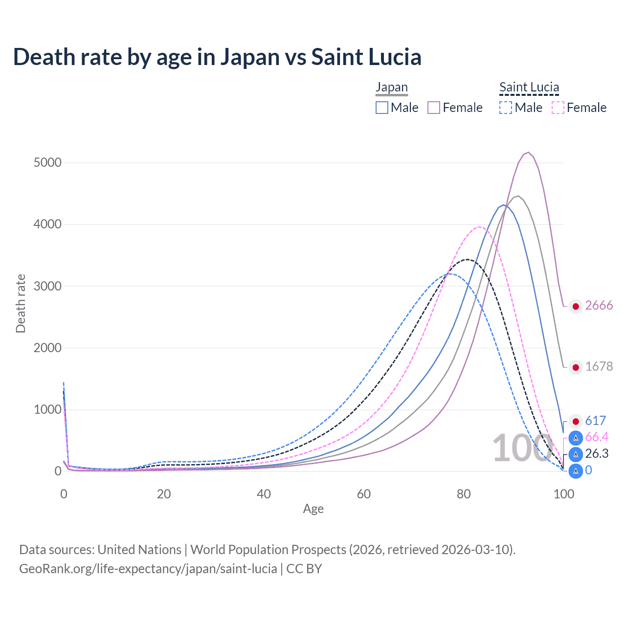 In Japan, the most common age of death is 91, compared to 81 in Saint Lucia. The median age of death is 88.1 in Japan and 76.8 in Saint Lucia, meaning only half of each cohort is expected to live past that age.