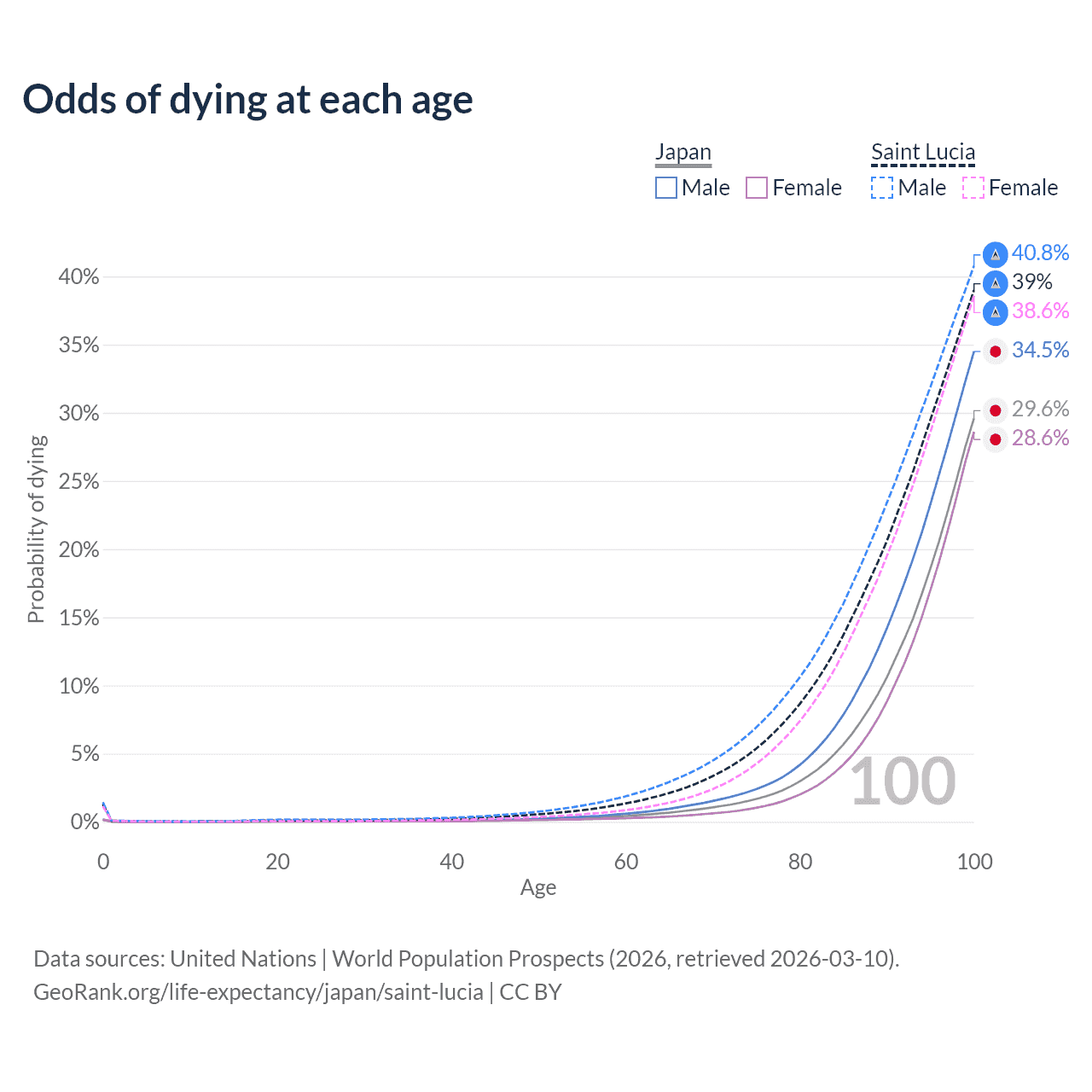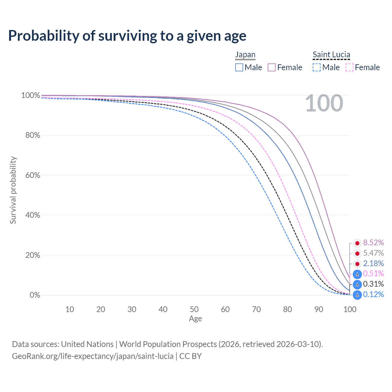 This life expectancy calculator shows the odds of living to 100, 95, 90, and below based on current age for both males and females in Japan and Saint Lucia, along with mean and median age of death. The calculations are based on the 2026 life tables (actuarial tables) from the UN World Population Prospects.