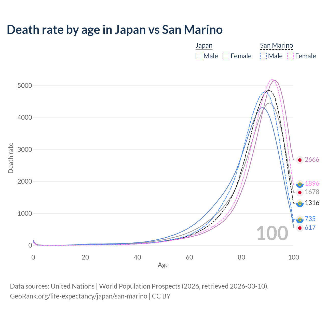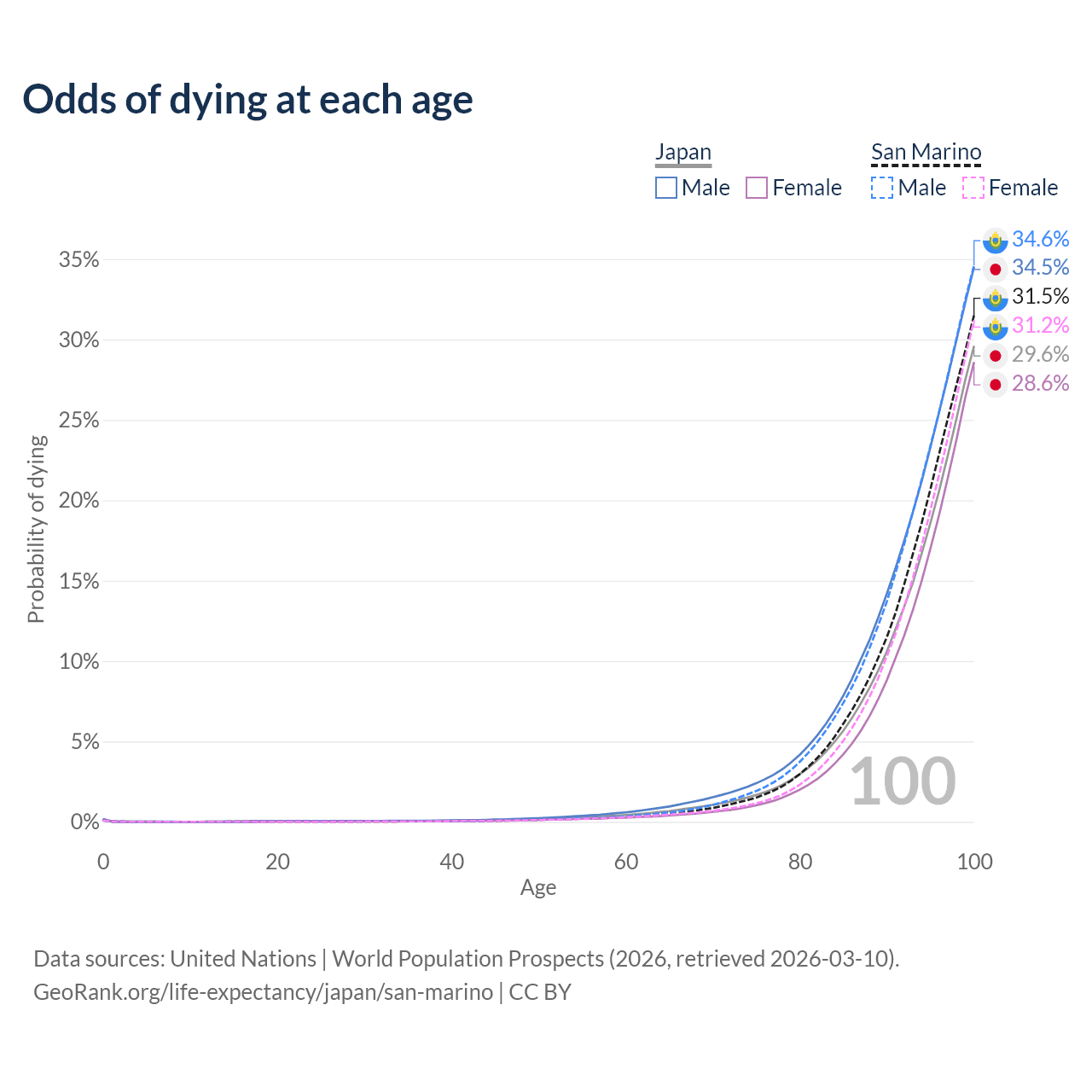 In Japan, the most common age of death is 91, compared to 91 in San Marino. The median age of death is 88.1 in Japan and 88.3 in San Marino, meaning only half of each cohort is expected to live past that age.
