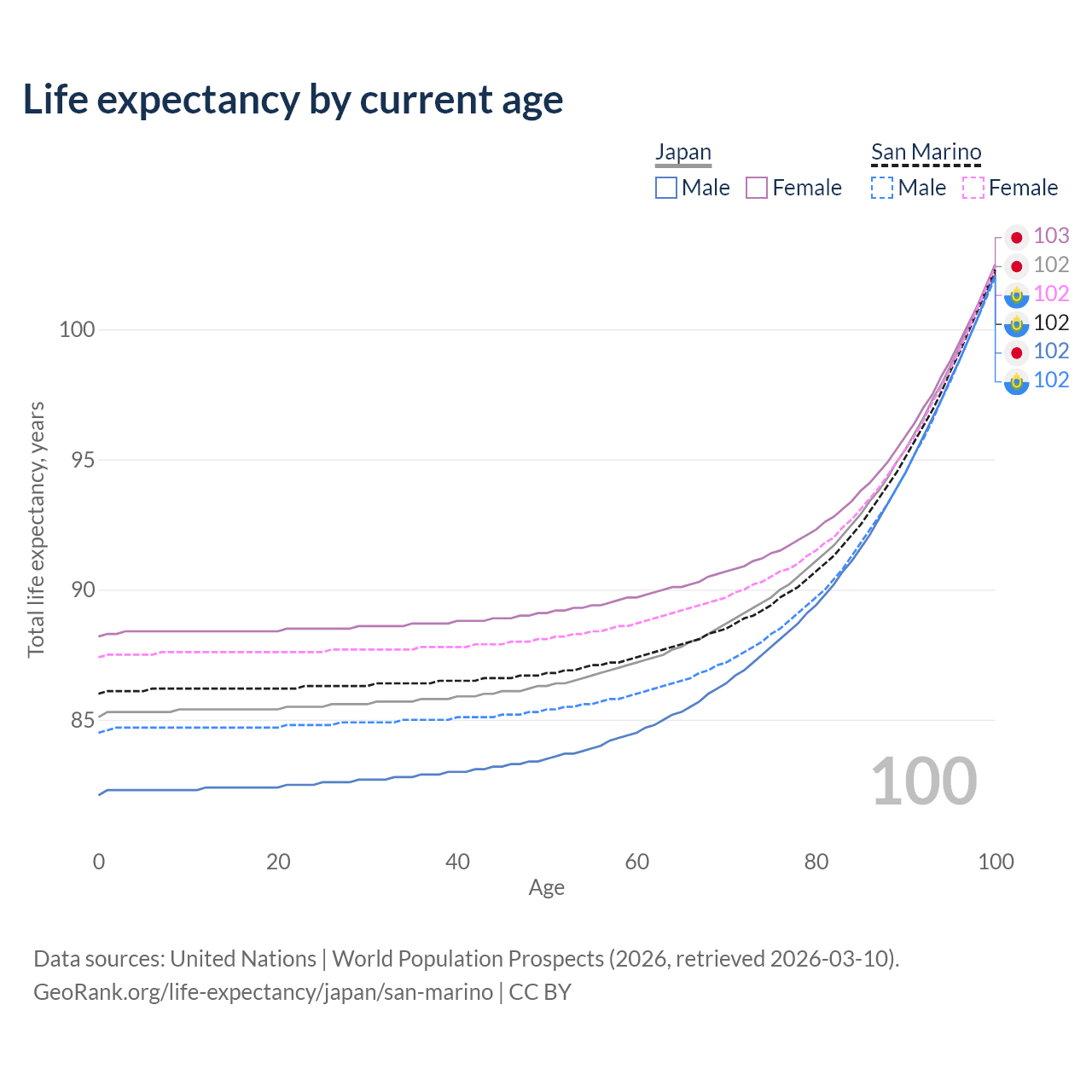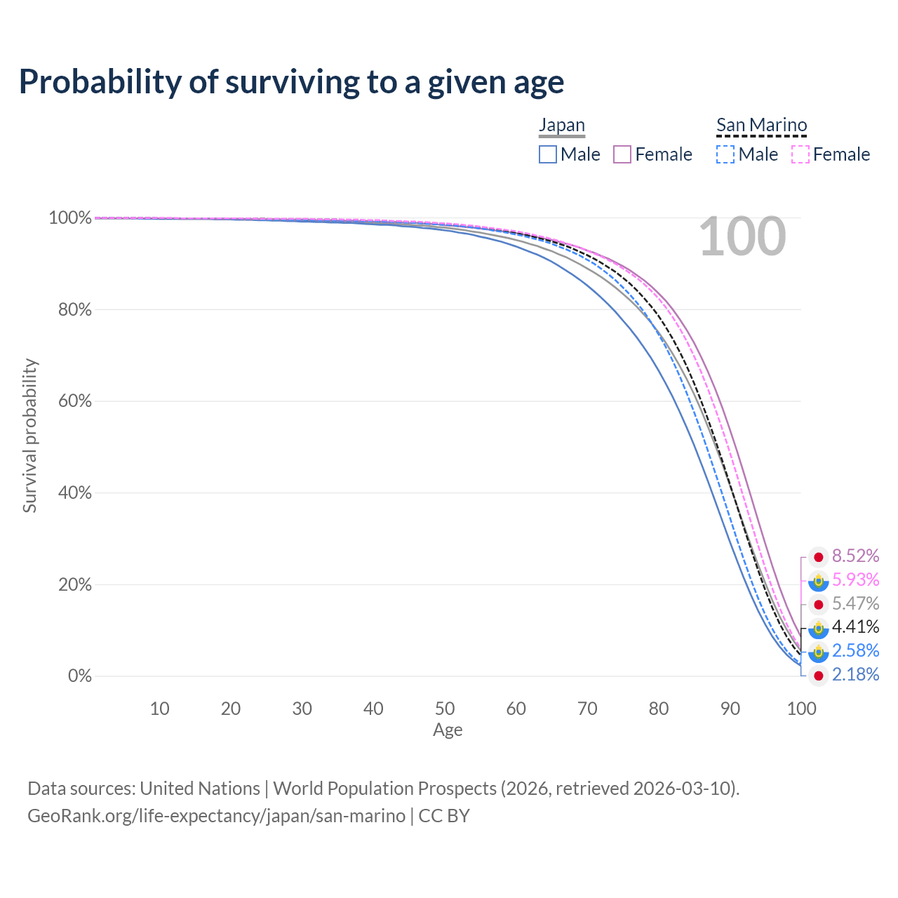 This life expectancy calculator shows the odds of living to 100, 95, 90, and below based on current age for both males and females in Japan and San Marino, along with mean and median age of death. The calculations are based on the 2026 life tables (actuarial tables) from the UN World Population Prospects.