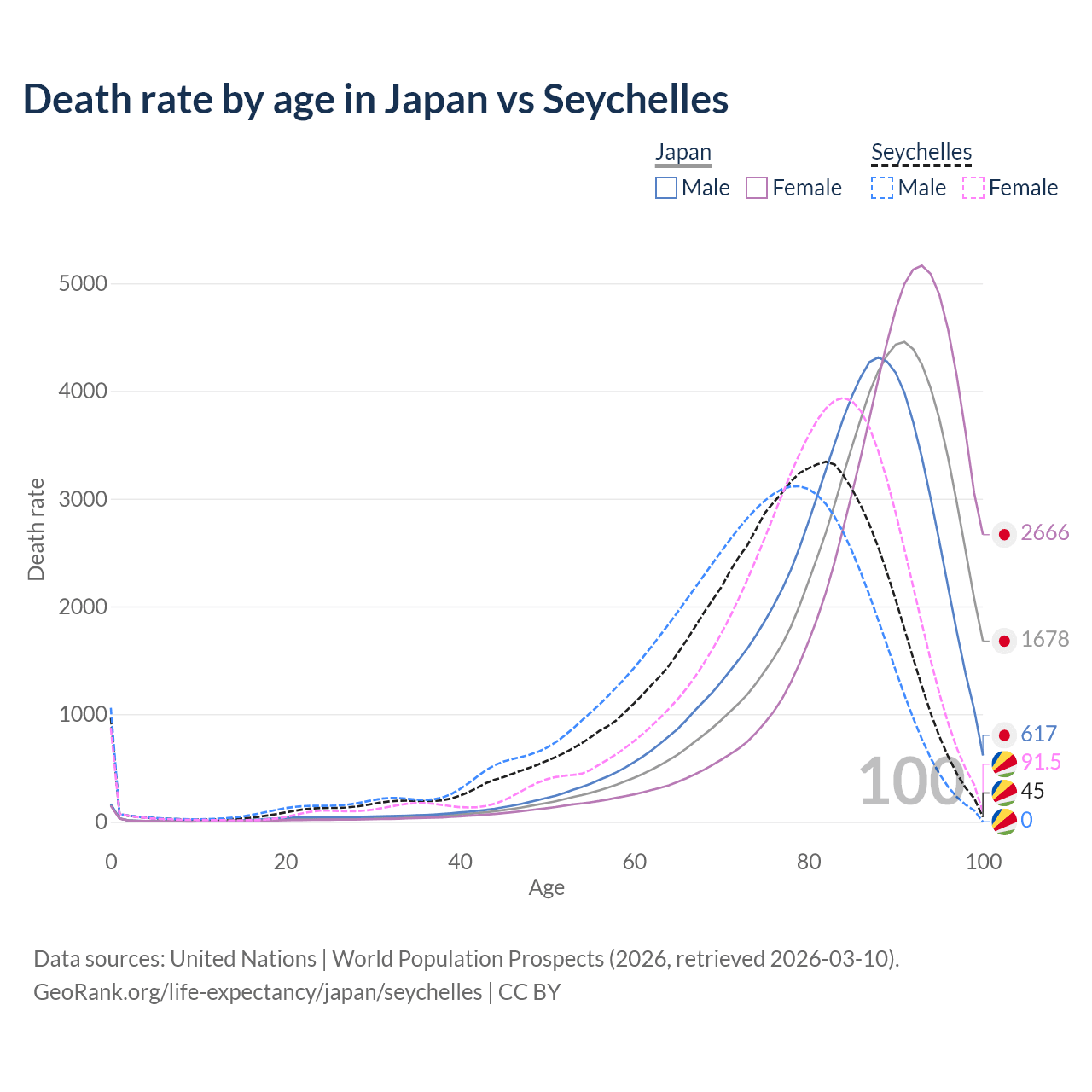 In Japan, the most common age of death is 91, compared to 82 in the Seychelles. The median age of death is 88.1 in Japan and 77 in the Seychelles, meaning only half of each cohort is expected to live past that age.