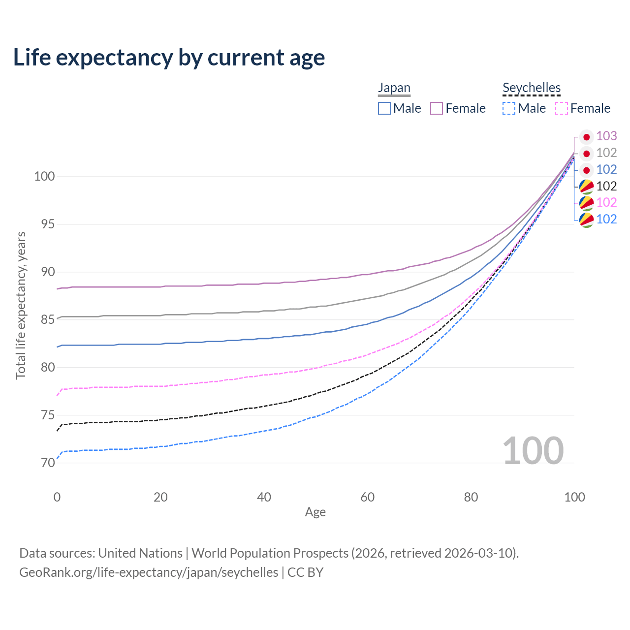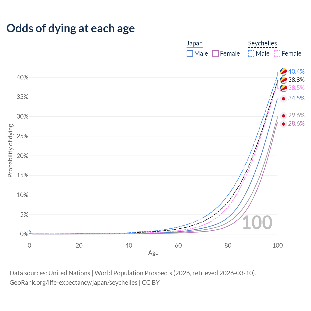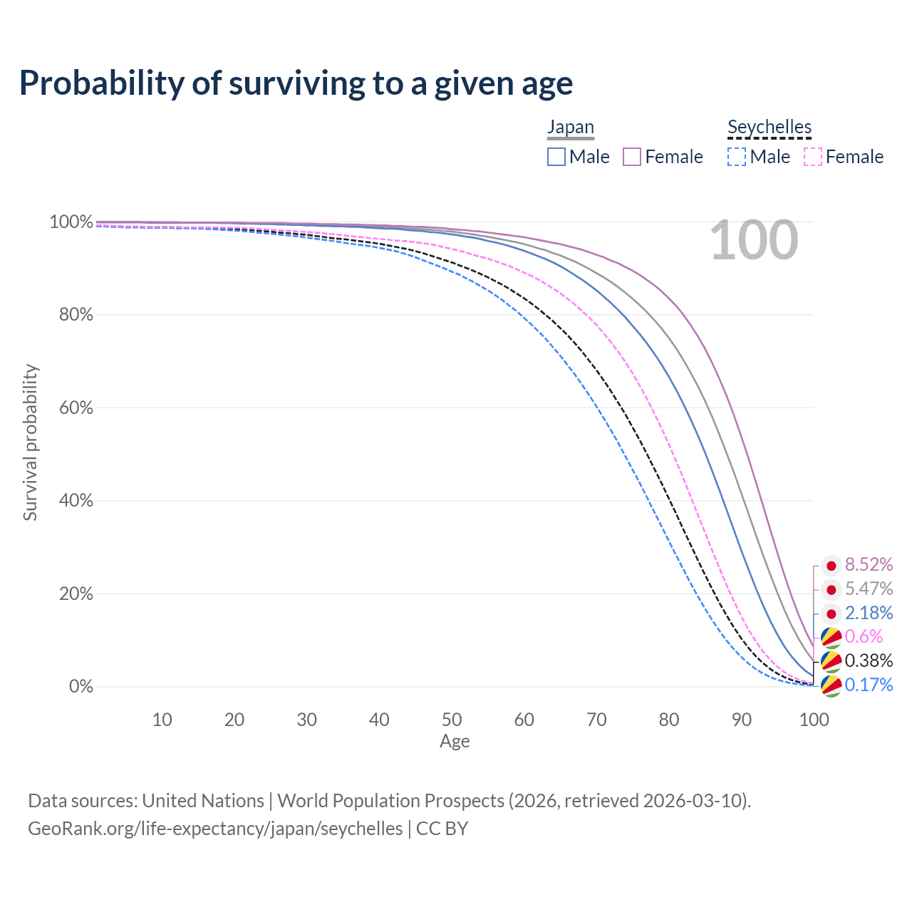 This life expectancy calculator shows the odds of living to 100, 95, 90, and below based on current age for both males and females in Japan and the Seychelles, along with mean and median age of death. The calculations are based on the 2026 life tables (actuarial tables) from the UN World Population Prospects.