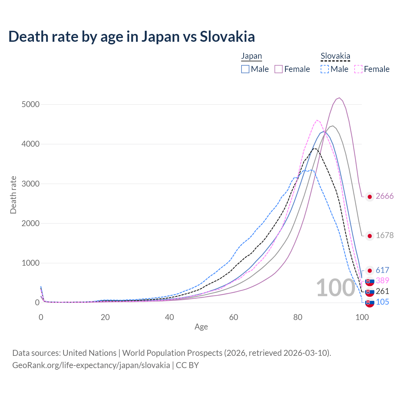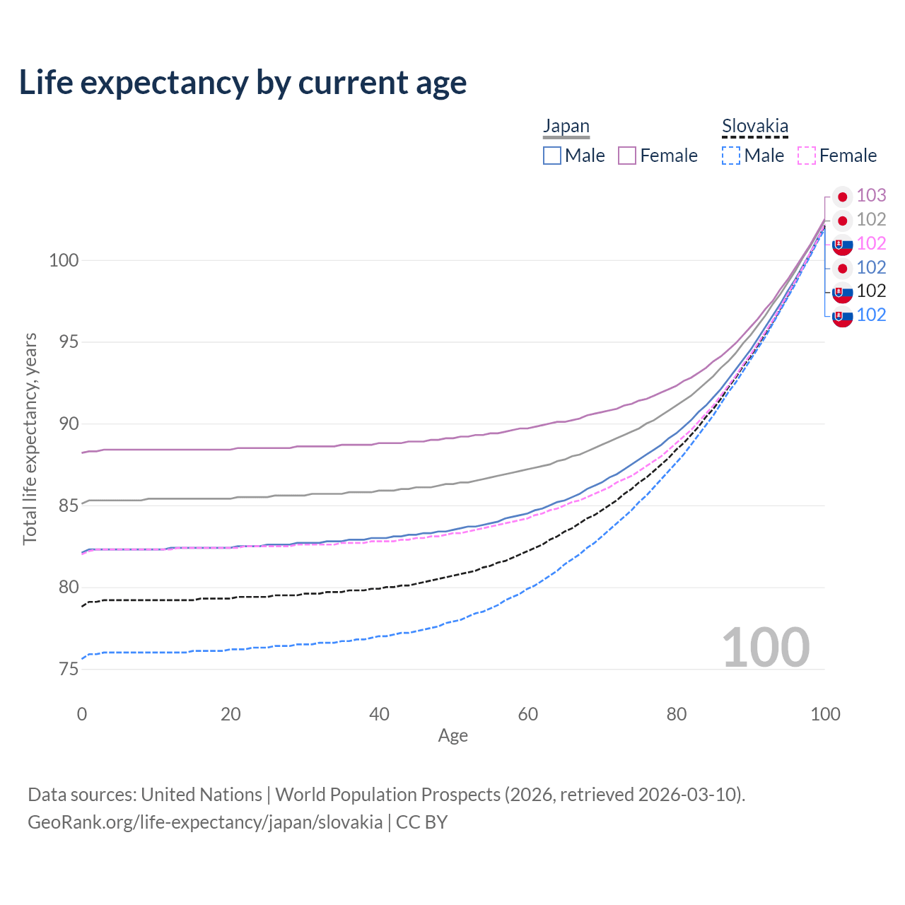 This life expectancy calculator shows the odds of living to 100, 95, 90, and below based on current age for both males and females in Japan and Slovakia, along with mean and median age of death. The calculations are based on the 2026 life tables (actuarial tables) from the UN World Population Prospects.