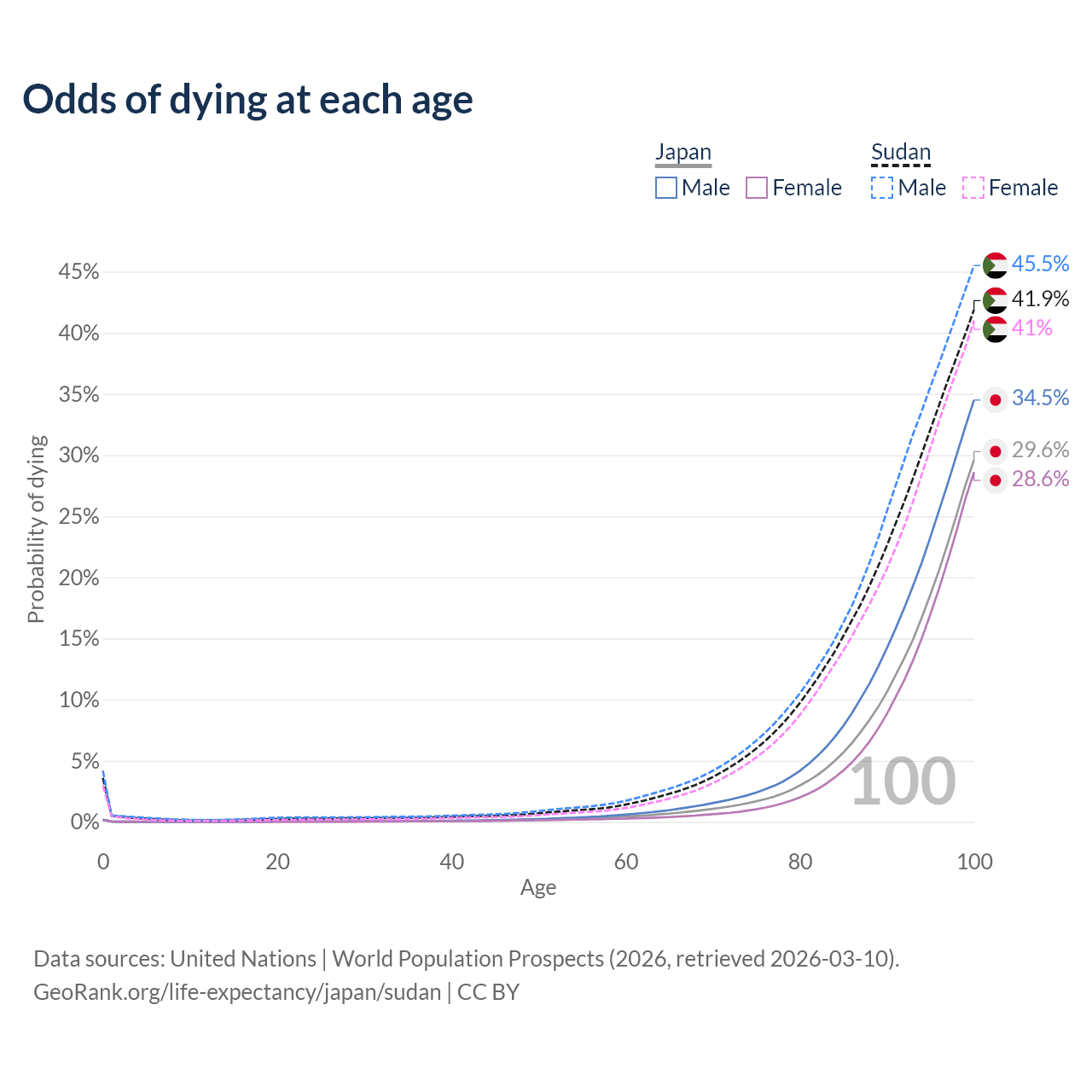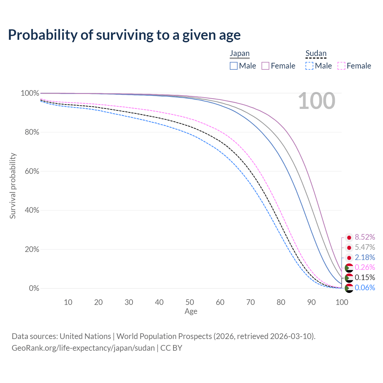 This life expectancy calculator shows the odds of living to 100, 95, 90, and below based on current age for both males and females in Japan and Sudan, along with mean and median age of death. The calculations are based on the 2026 life tables (actuarial tables) from the UN World Population Prospects.