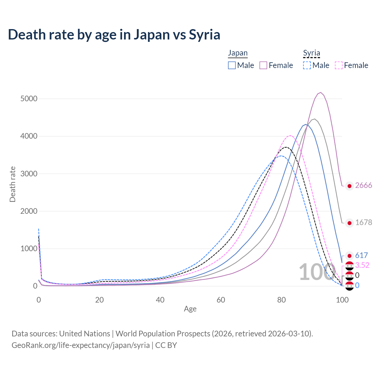 This life expectancy calculator shows the odds of living to 100, 95, 90, and below based on current age for both males and females in Japan and Syria, along with mean and median age of death. The calculations are based on the 2026 life tables (actuarial tables) from the UN World Population Prospects.
