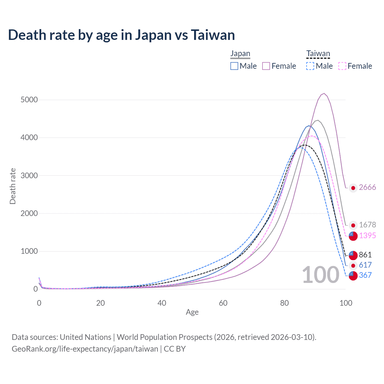 This life expectancy calculator shows the odds of living to 100, 95, 90, and below based on current age for both males and females in Japan and Taiwan, along with mean and median age of death. The calculations are based on the 2026 life tables (actuarial tables) from the UN World Population Prospects.