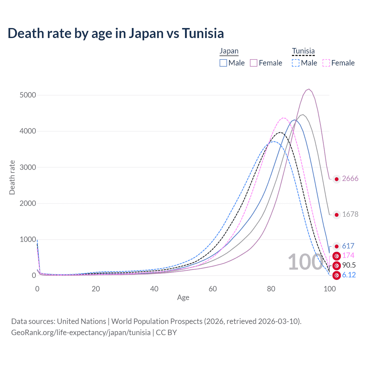 In Japan, the most common age of death is 91, compared to 83 in Tunisia. The median age of death is 88.1 in Japan and 80.2 in Tunisia, meaning only half of each cohort is expected to live past that age.