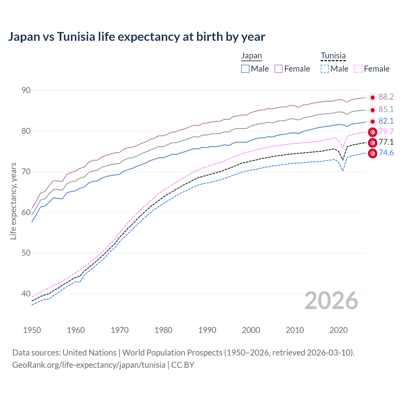 The average life expectancy at birth is 85.1 years in Japan vs 77.1 in Tunisia. Japan is ranked 3/197 by life expectancy, and Tunisia is 74/197. In Japan, the life expectancy is 82.1 years for males and 88.2 years for females. In Tunisia, it's 74.6 years for males and 79.7 years for females.