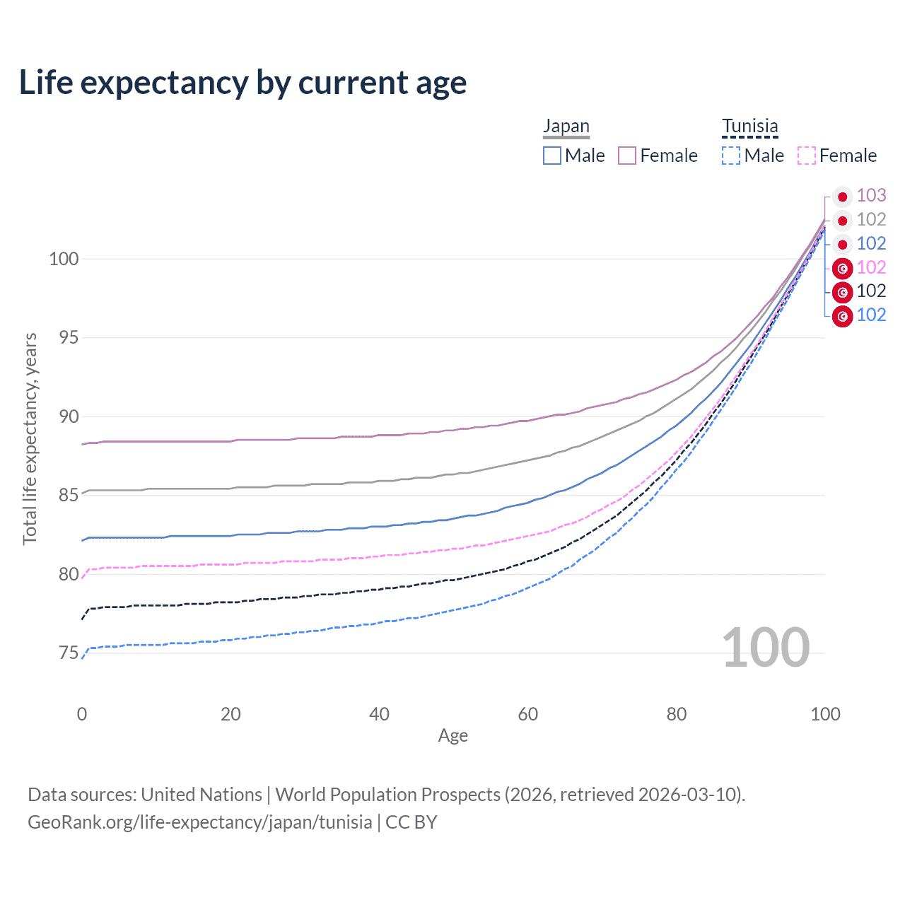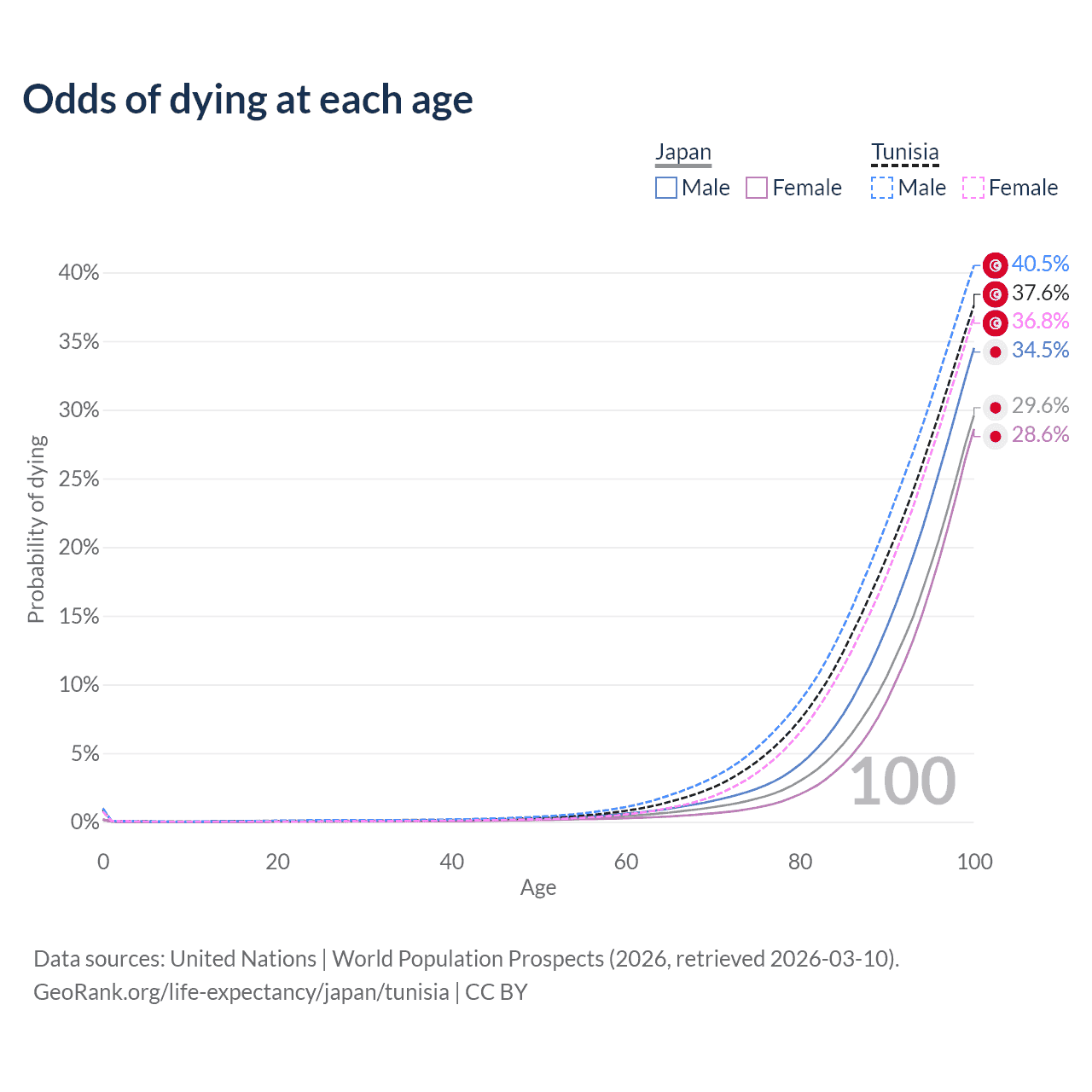 This life expectancy calculator shows the odds of living to 100, 95, 90, and below based on current age for both males and females in Japan and Tunisia, along with mean and median age of death. The calculations are based on the 2026 life tables (actuarial tables) from the UN World Population Prospects.
