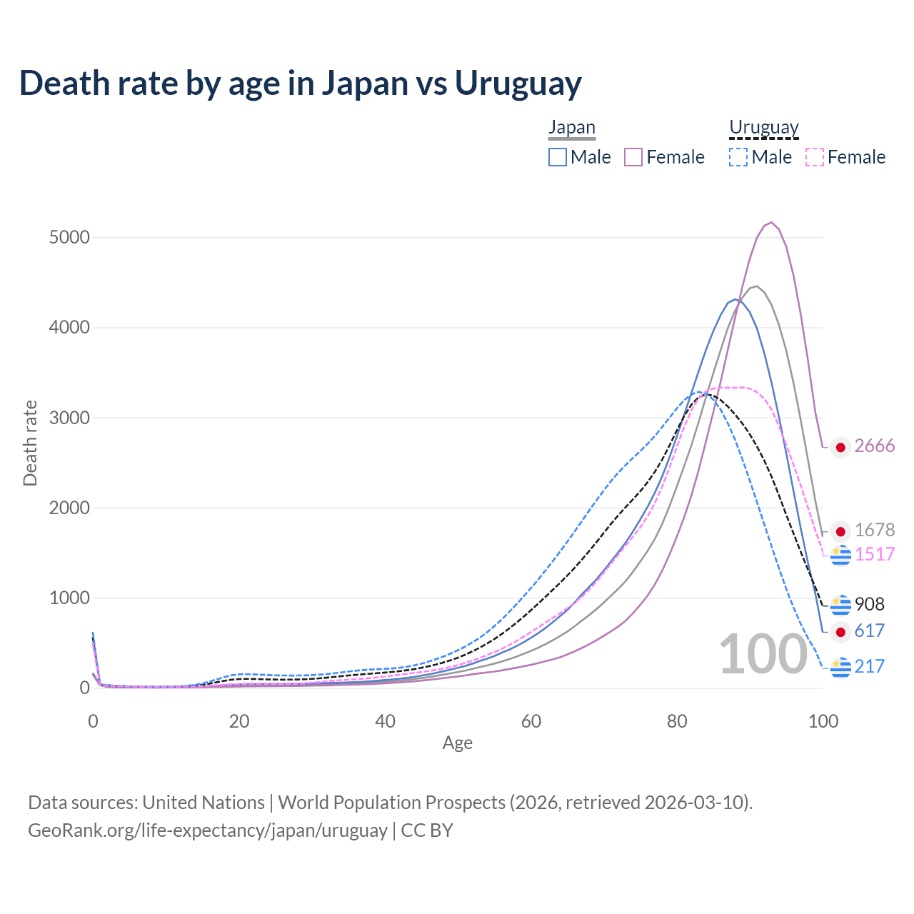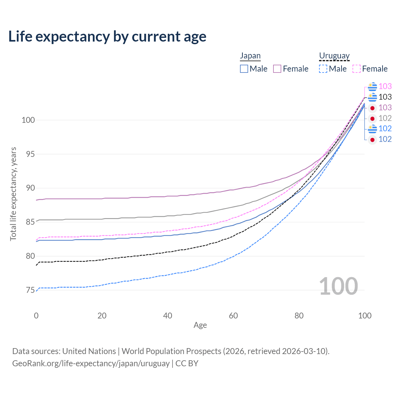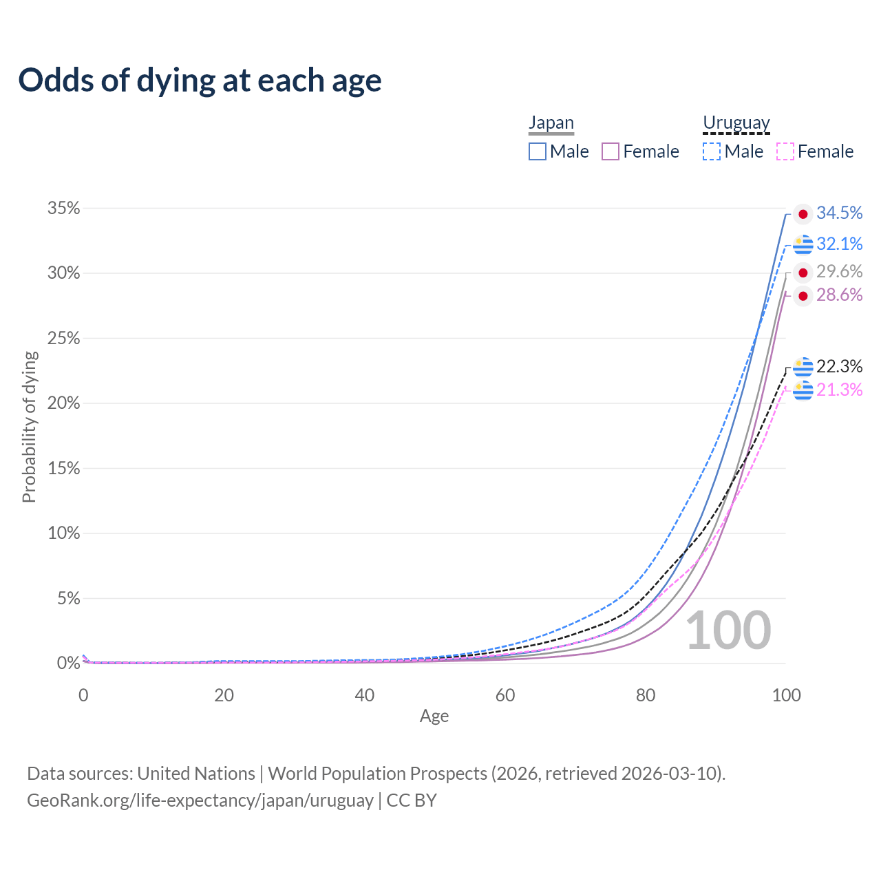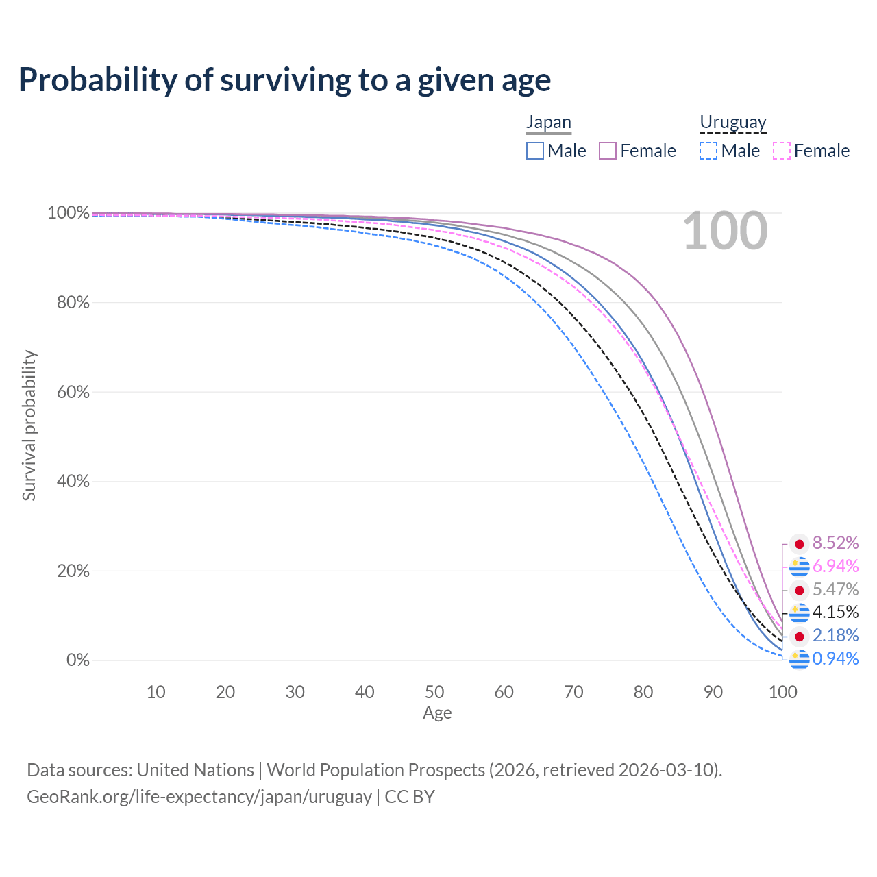 This life expectancy calculator shows the odds of living to 100, 95, 90, and below based on current age for both males and females in Japan and Uruguay, along with mean and median age of death. The calculations are based on the 2026 life tables (actuarial tables) from the UN World Population Prospects.