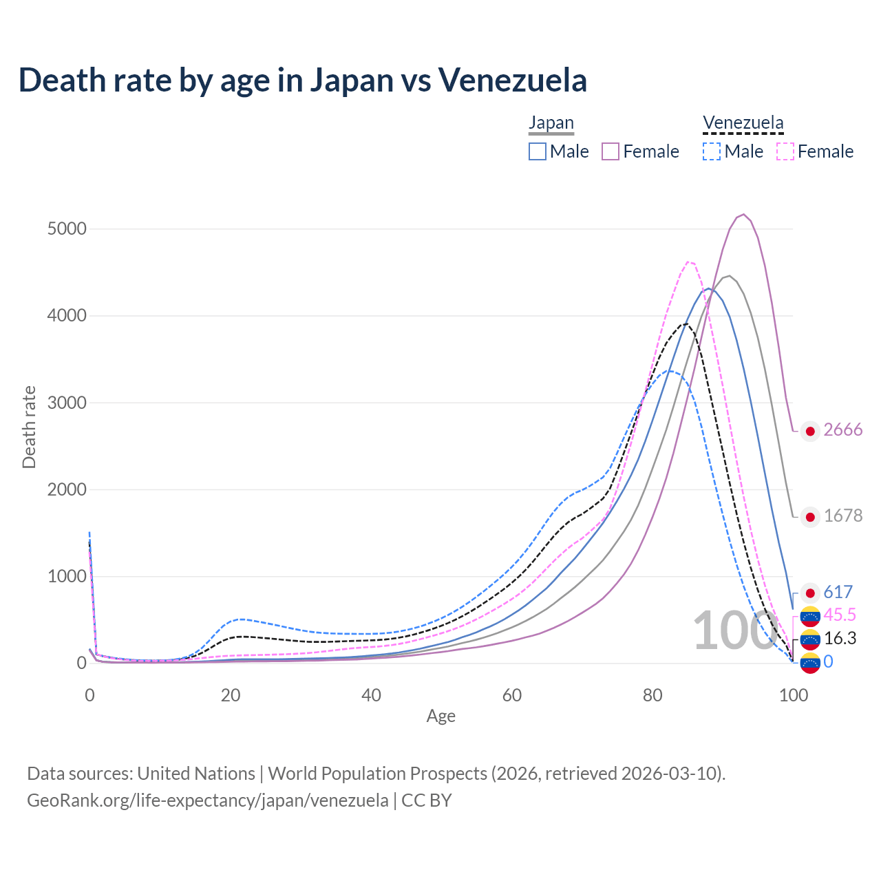 In Japan, the most common age of death is 91, compared to 85 in Venezuela. The median age of death is 88.1 in Japan and 79 in Venezuela, meaning only half of each cohort is expected to live past that age.