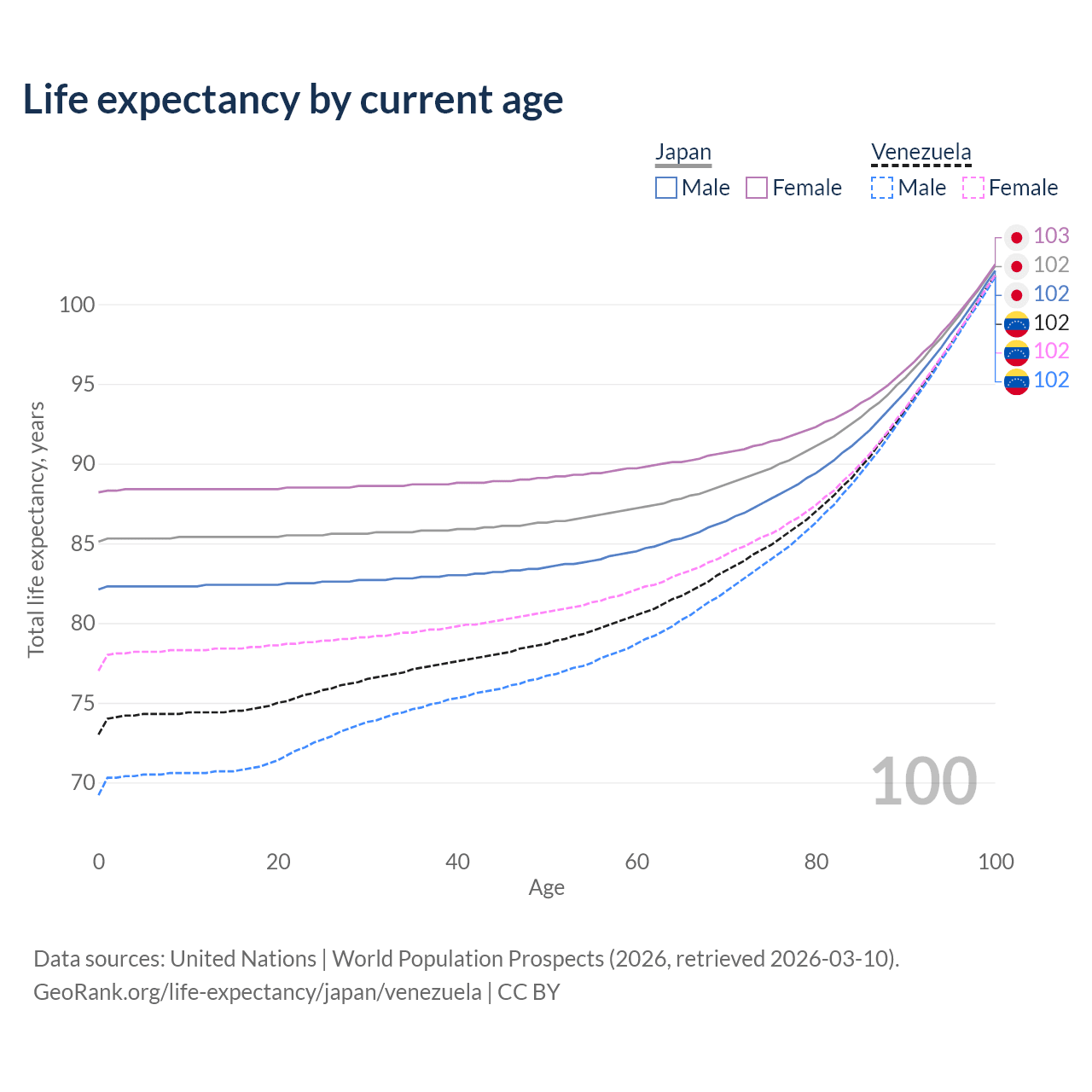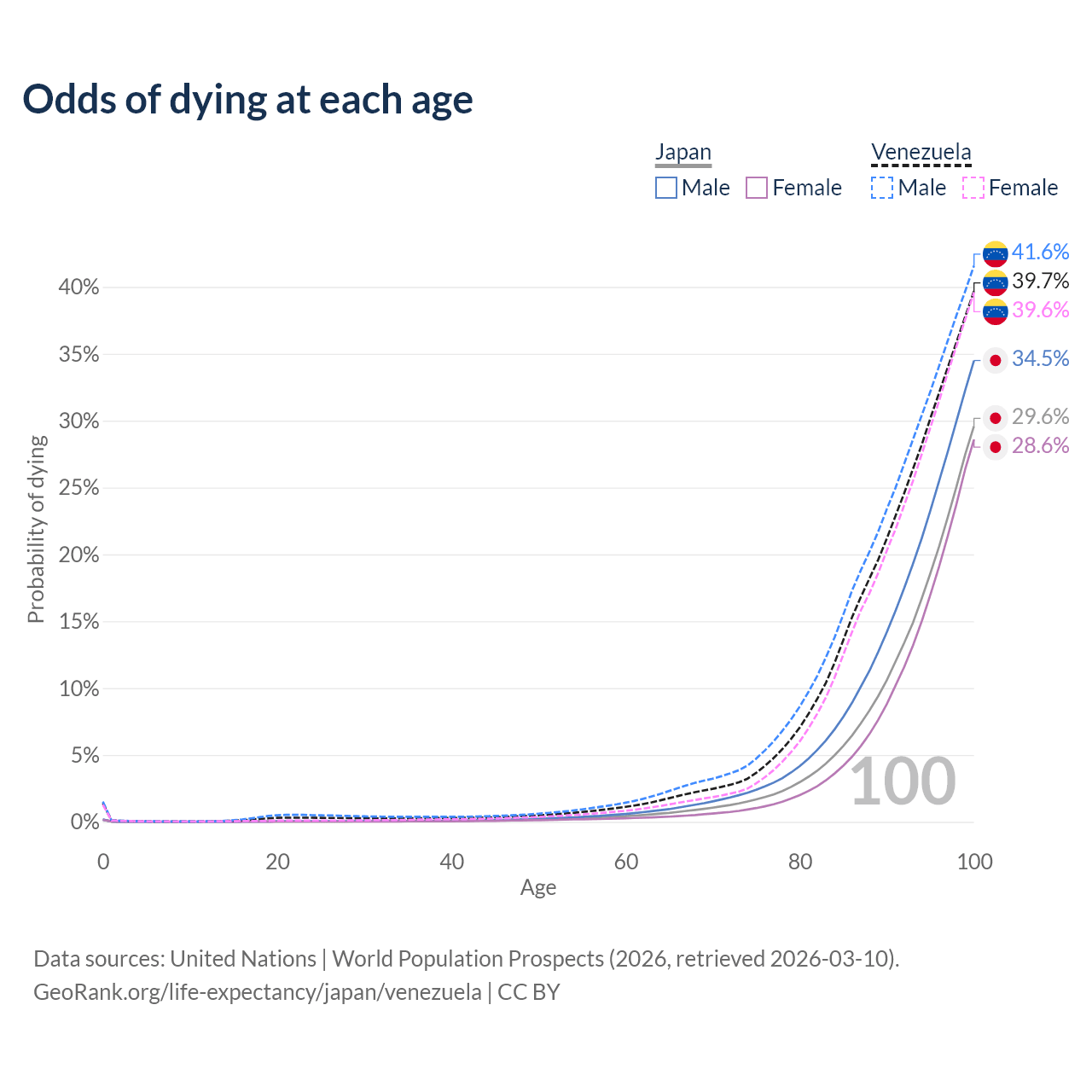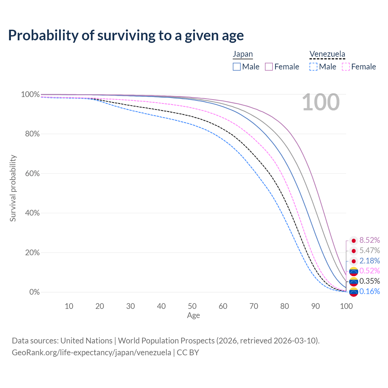 This life expectancy calculator shows the odds of living to 100, 95, 90, and below based on current age for both males and females in Japan and Venezuela, along with mean and median age of death. The calculations are based on the 2026 life tables (actuarial tables) from the UN World Population Prospects.