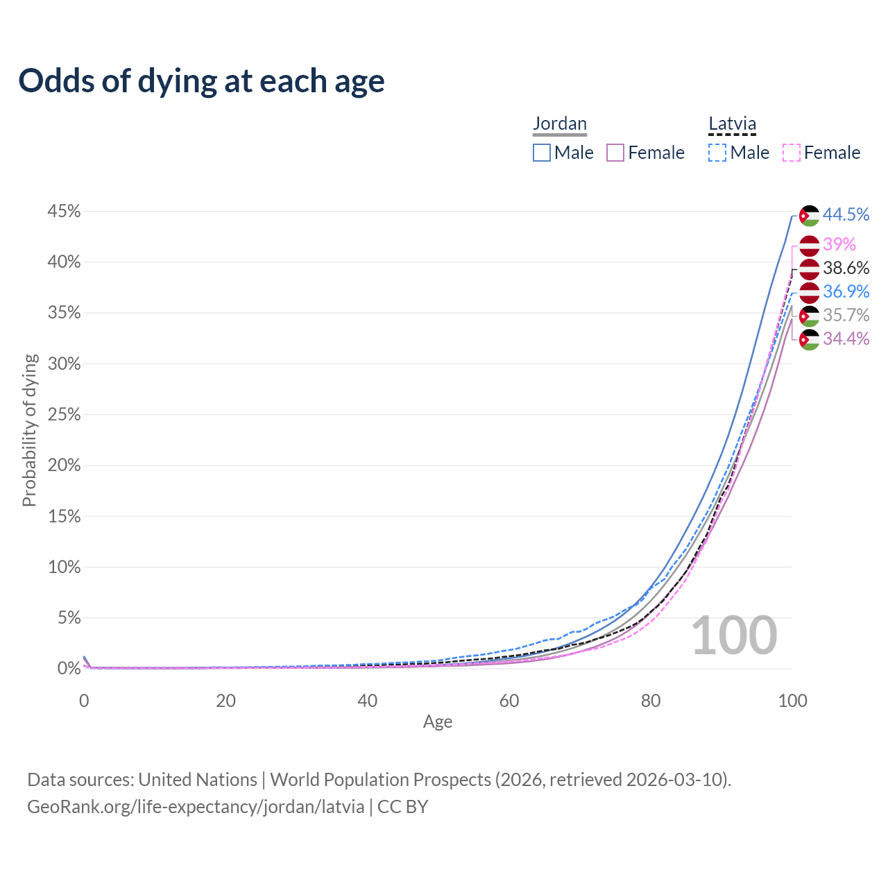 This life expectancy calculator shows the odds of living to 100, 95, 90, and below based on current age for both males and females in Jordan and Latvia, along with mean and median age of death. The calculations are based on the 2026 life tables (actuarial tables) from the UN World Population Prospects.
