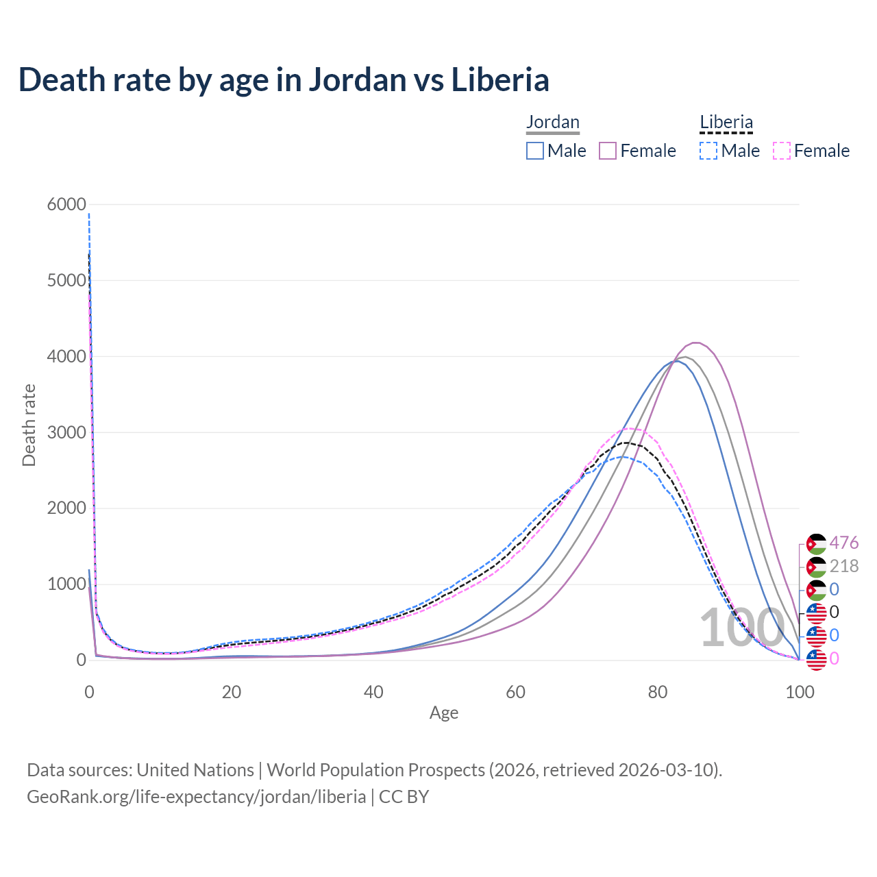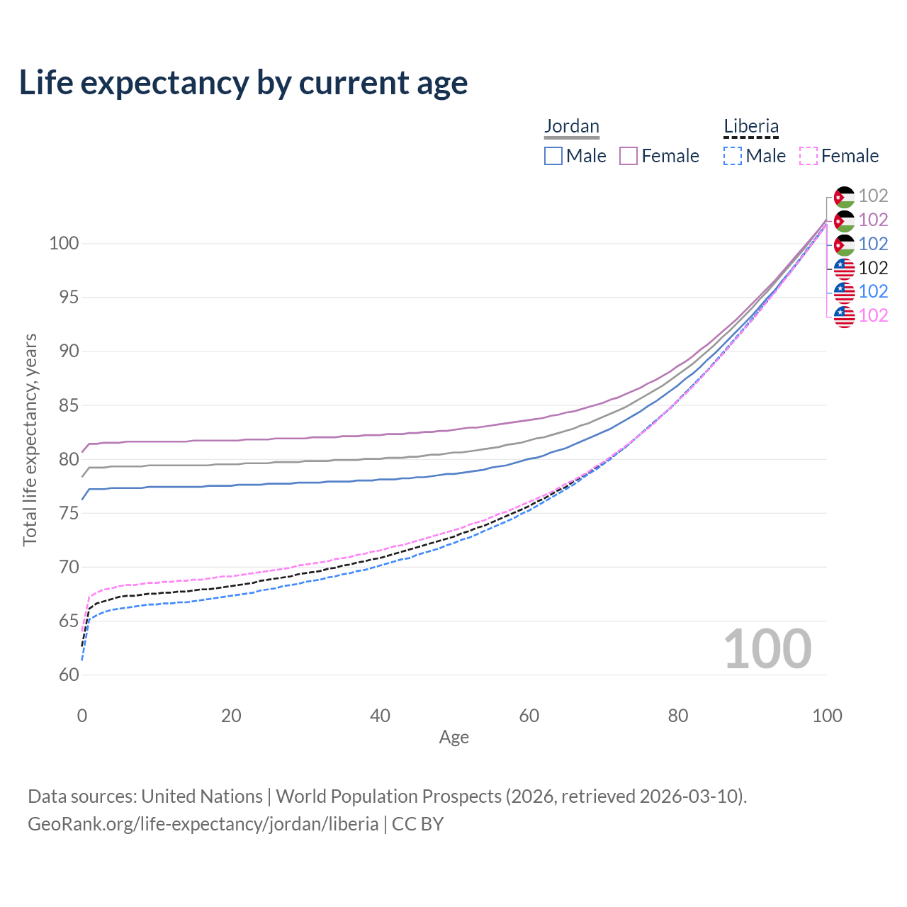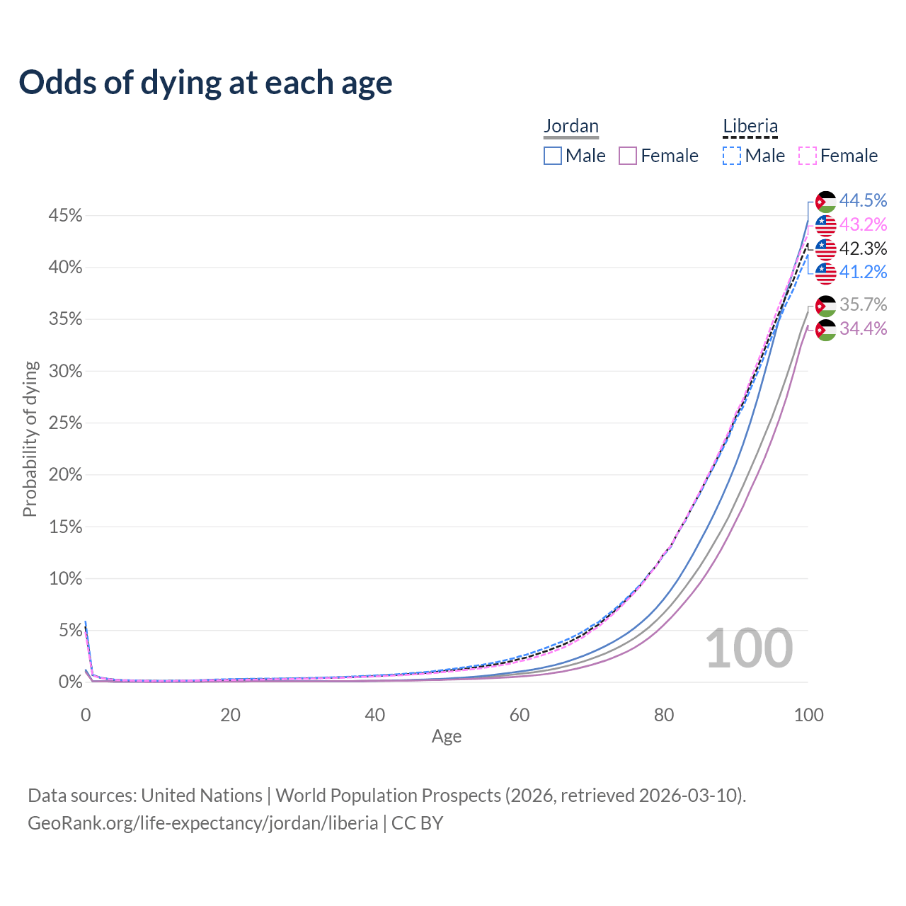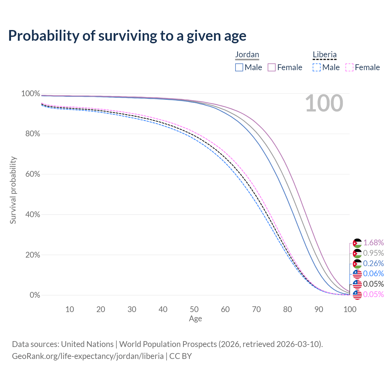 This life expectancy calculator shows the odds of living to 100, 95, 90, and below based on current age for both males and females in Jordan and Liberia, along with mean and median age of death. The calculations are based on the 2026 life tables (actuarial tables) from the UN World Population Prospects.